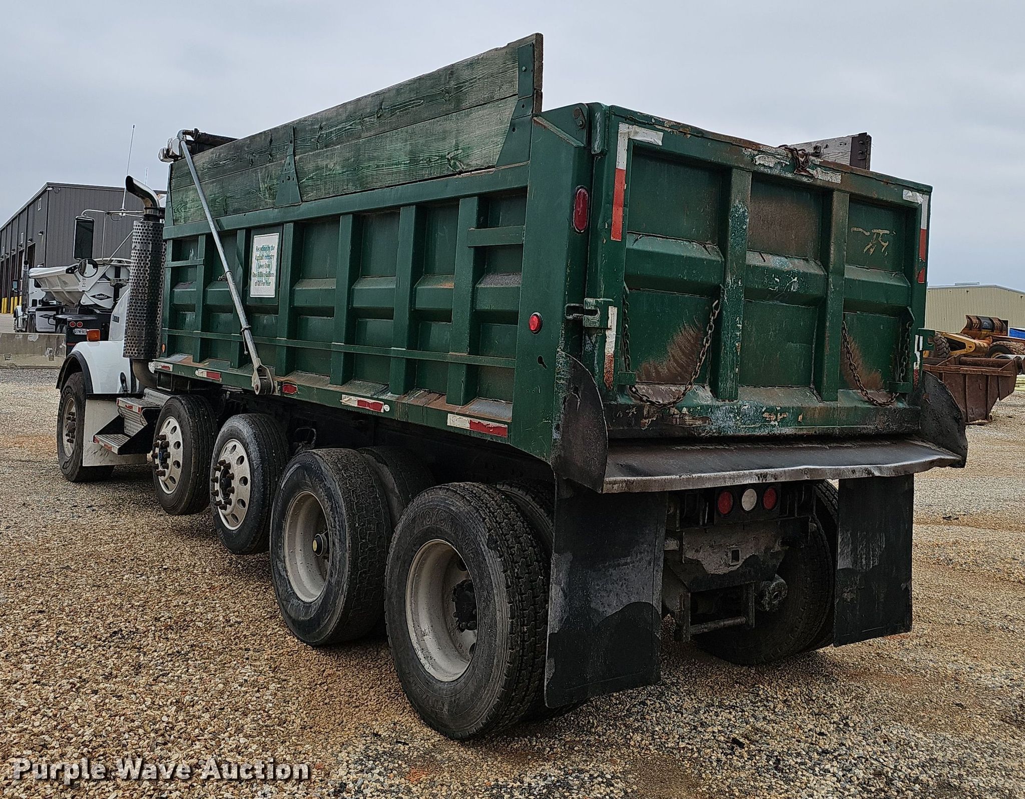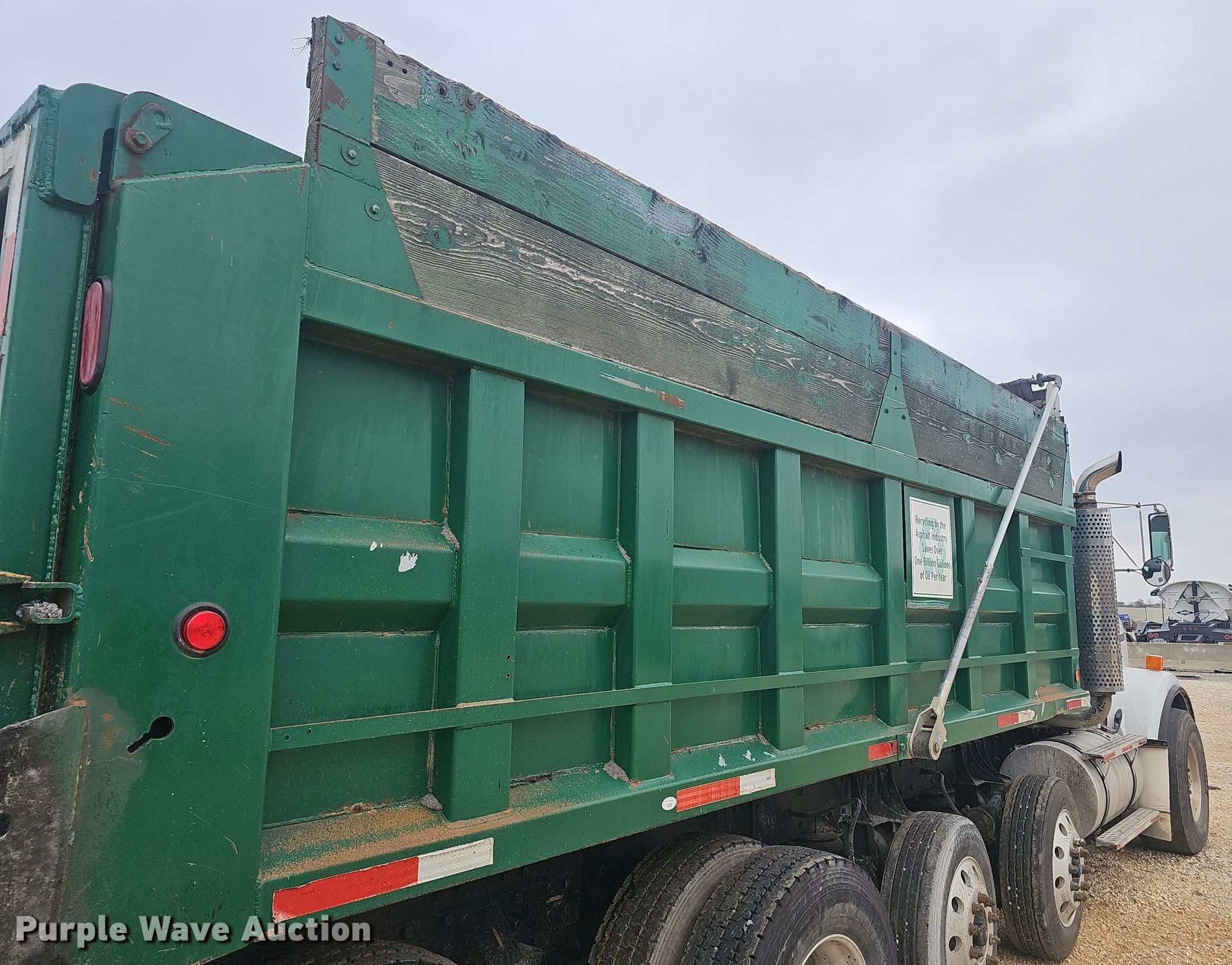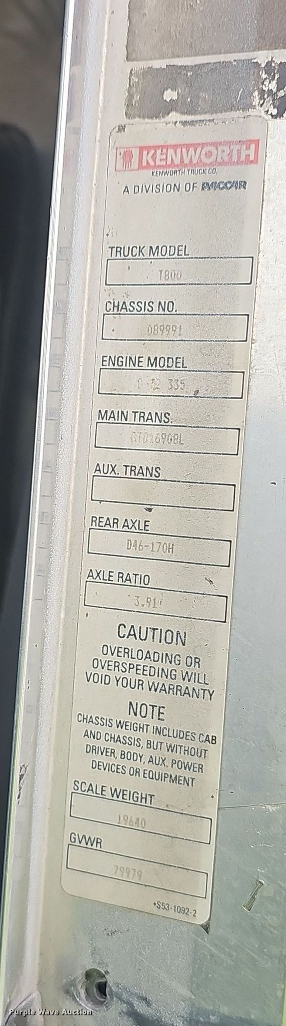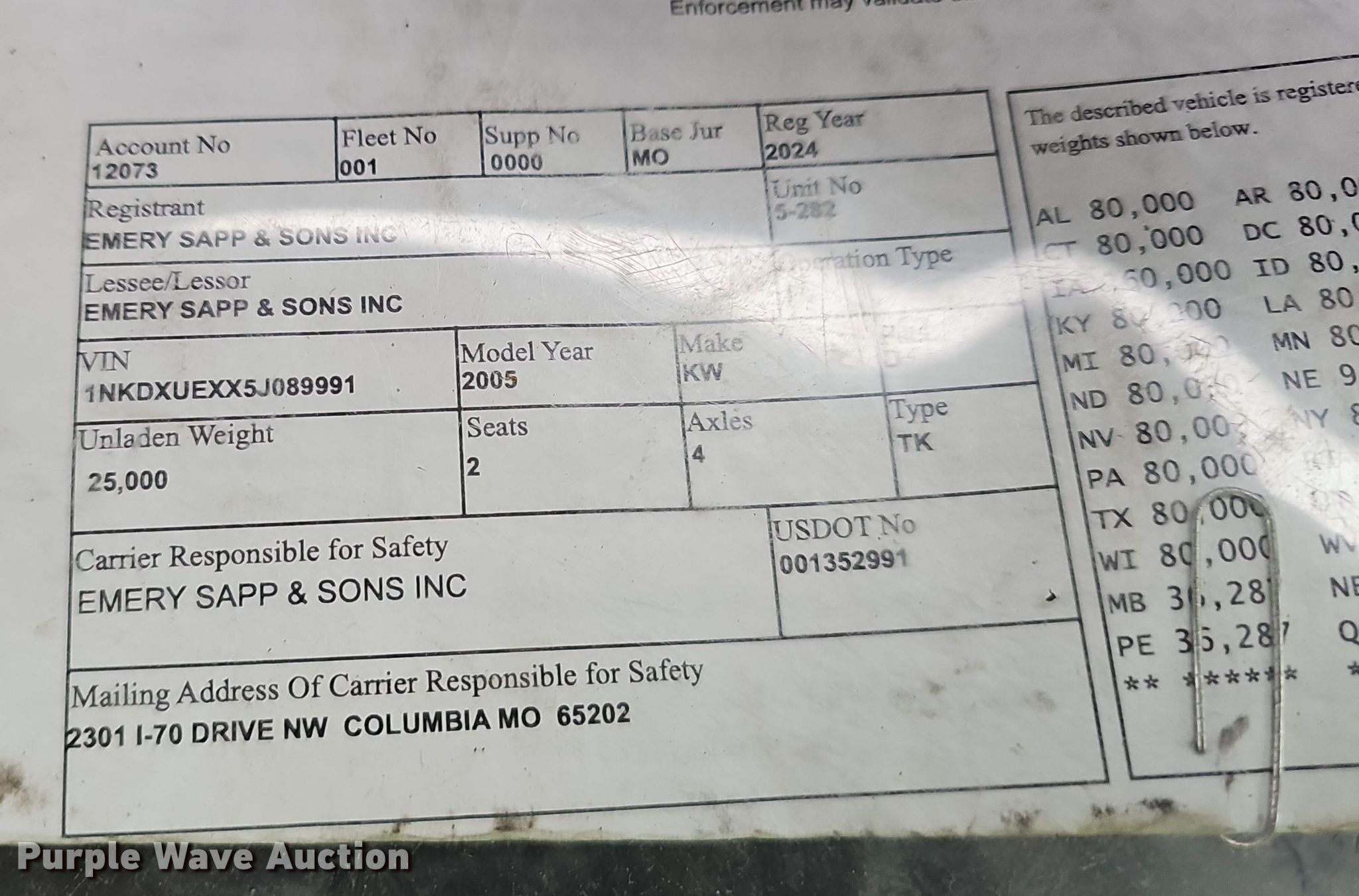 2005 Kenworth T800 dump truck. Miles: 974,318 on odometer, VIN: 1NKDXUEXX5J089991, Unit #: 5-282. Engine Catapillar C13 Acert, Displacement: 12.0L, Cylinders: 6, Fuel type: Diesel, Engine brake. Transmission Manual. Chassis Axles: 4, Pusher axle, Differential lock: Inter-axle, Suspension: Spring over walking beam, Brakes: Air, PTO. Interior AC, Heat, Heated mirrors, Cruise control. Features Dump bed Model: Ox Bodies, Serial: 6041003SC, Capacity: 18 cu.yd., 17' L x 96" W, Side height: 45", Side board height: 20", Bed type: Steel, Bed vibrator, Roll tarp, Ram: Single, End gate: Air operated. Tires Front: 425/64R22.5, Rear: 11R22.5, Lift axle: 155/70R22.5. Notes Non-operational roll tarp. Missouri title. Title distribution may be delayed up to 30 days from verification of funds. Emery Sapp & Sons, Inc.. Springdale, AR 72764