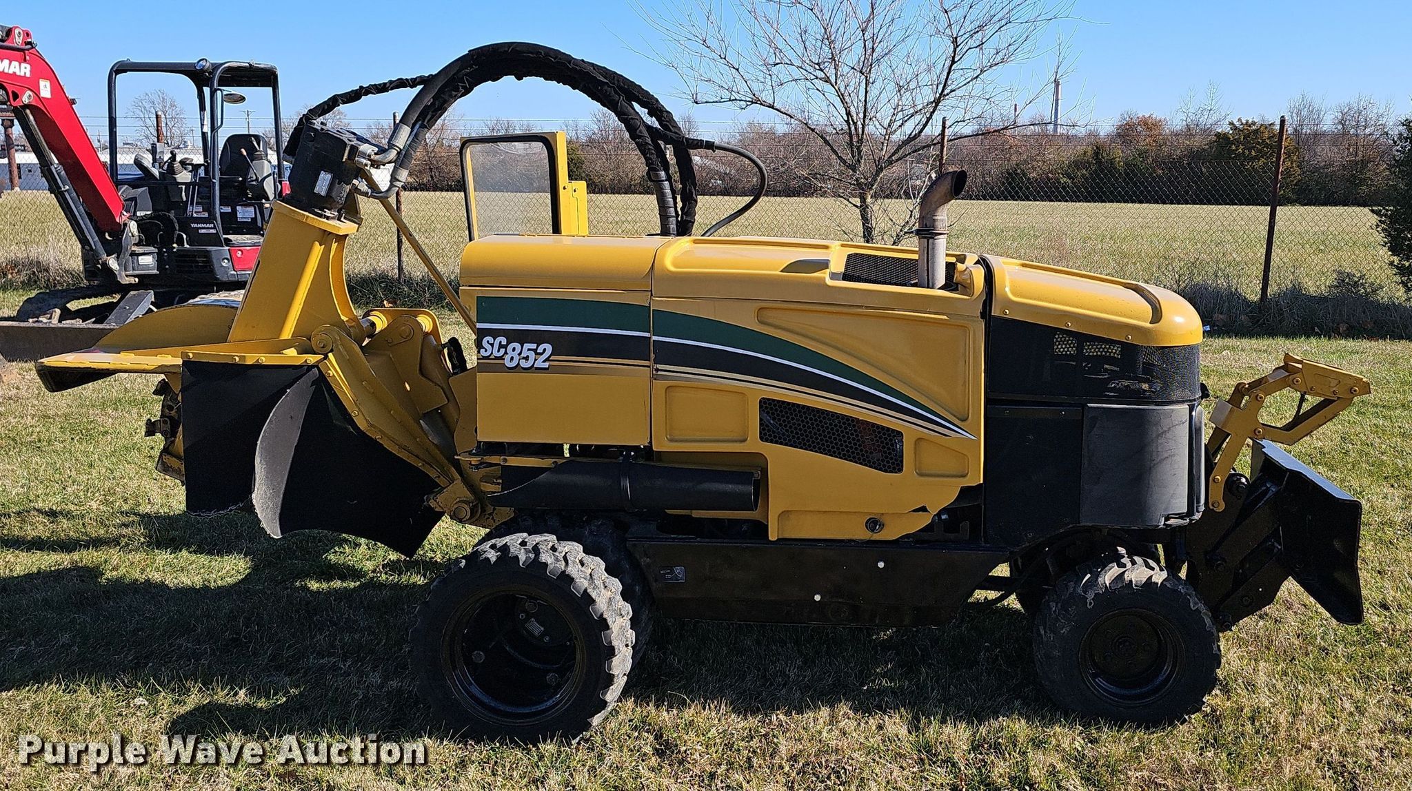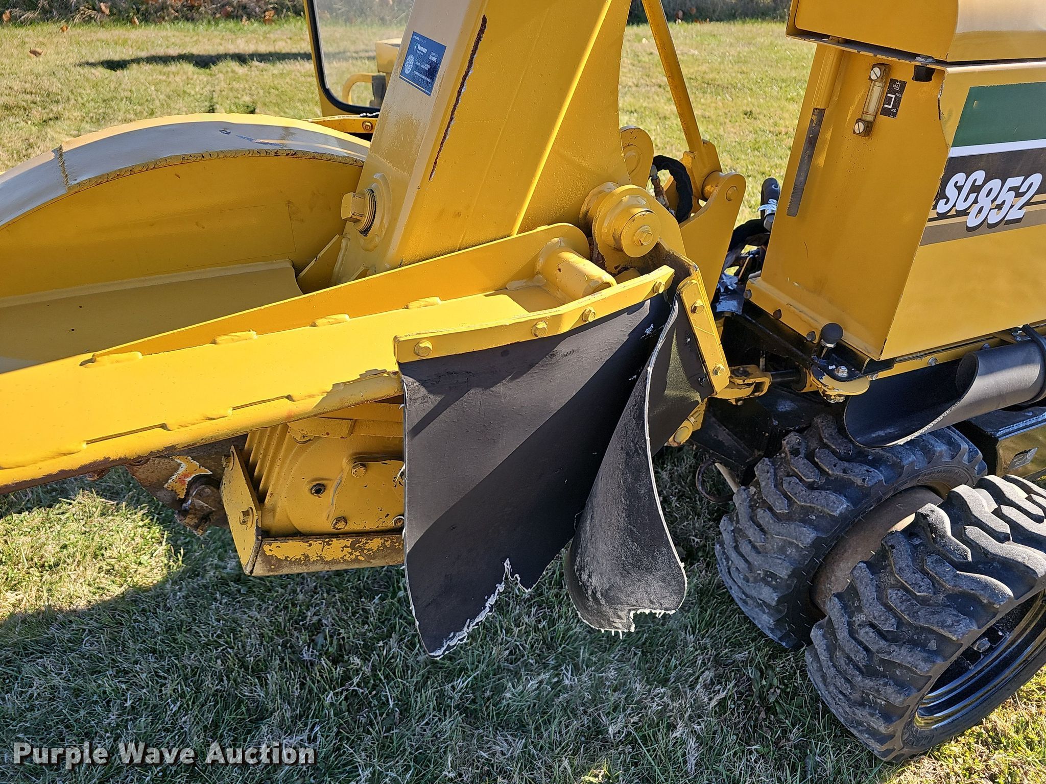2008 Vermeer SC852 stump grinder. Hours: 2,124 on meter, Serial: 1VR7122L081000164. Engine Cylinders: 4, Fuel type: Diesel. Transmission Hydrostatic. Features Cutting head diameter: 24" Bolt-on teeth, Backfill blade: 34". Tires Front: 20-8.00-10, Rear: 23-8.50-14. Brookline, MO 65619