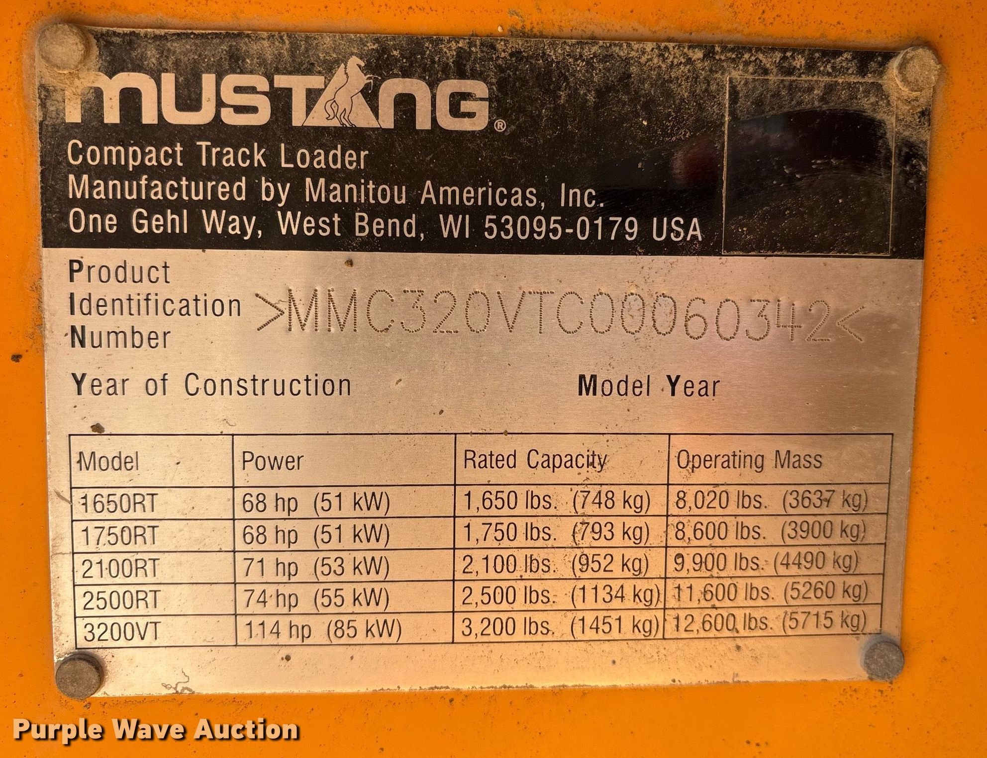 Mustang 3200VT tracked skid steer loader. Hours: 2,107 on meter, Serial: MMC320VTC00060342, Unit #: SEM-044. Engine Deutz, Displacement: 3.6L, Cylinders: 4, Fuel type: Diesel. Transmission Hydrostatic, Two speed travel. Operators station OROPS, Bucket control: Hand, Electronic Monitoring System panel. Features Auxiliary hydraulics, Quick coupler: Manual, Bucket Gen, Width: 74", Cutting edge: Bolt-on. Tracks Width: 18". G. R. Birdwell Construction. Houston, TX 77064
