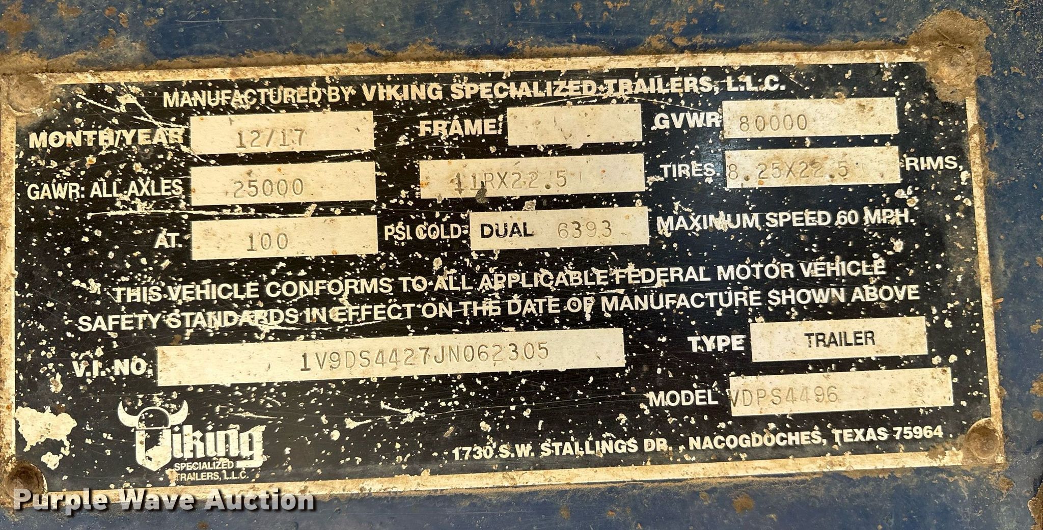 Purple Wave is selling a used Flat or Drop Deck Trailer in Arkansas. This item is a 2018 Viking VDPS4496 drop deck trailer with the following: VIN: 1V9DS4427JN062305, Unit #: T1688