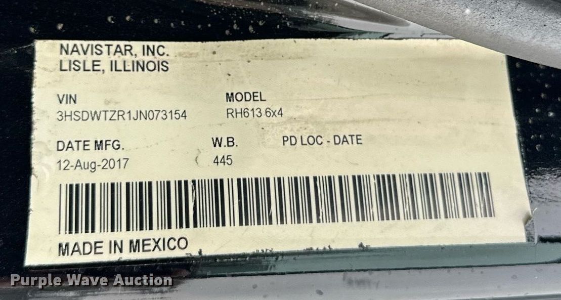 Purple Wave is selling a used Truck Tractor in Minnesota. This item is a 2018 International RH613 semi truck with the following: Miles: 458,771 on odometer, Hours: 11,281 on meter, VIN: 3HSDWTZR1JN073154