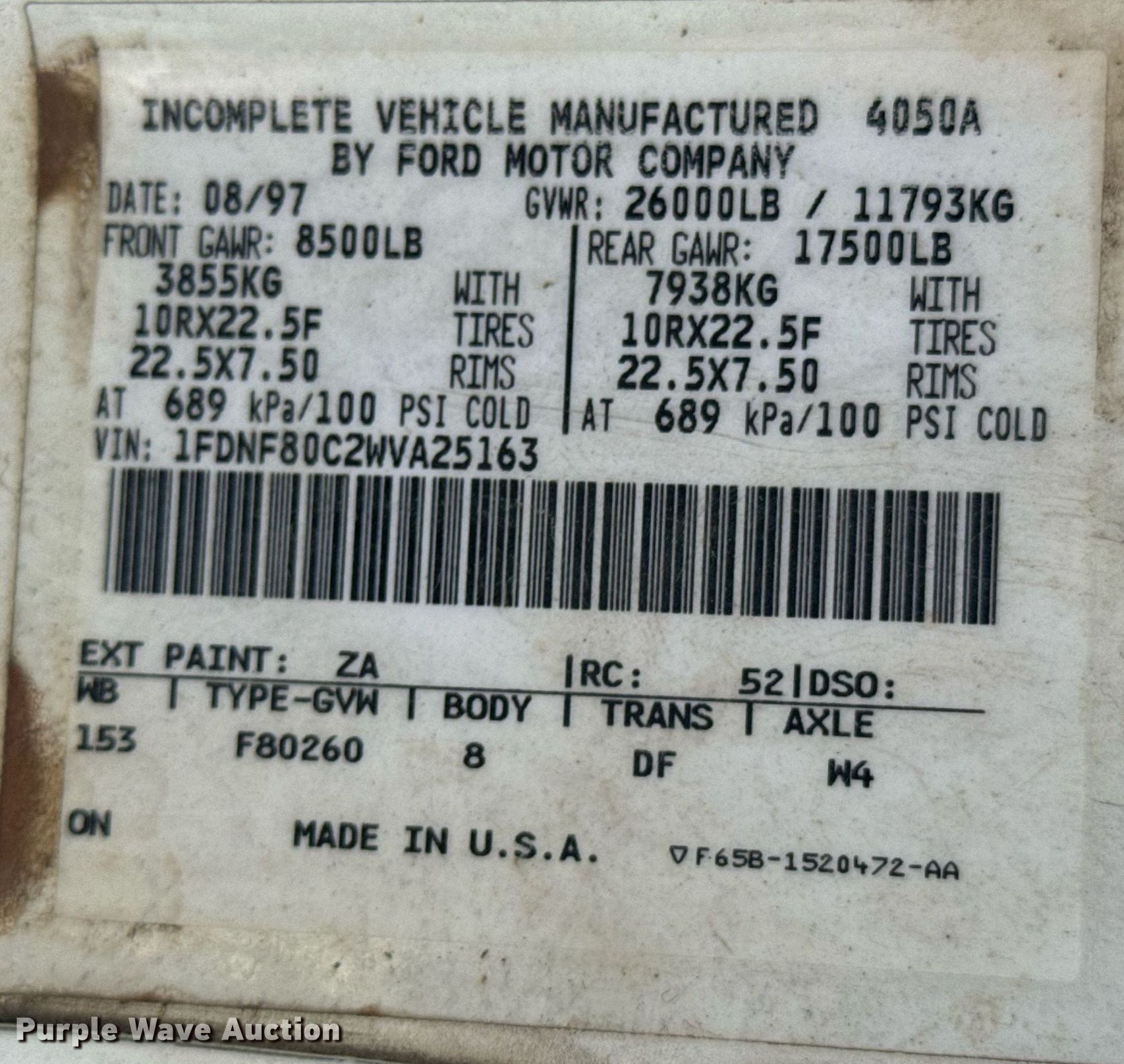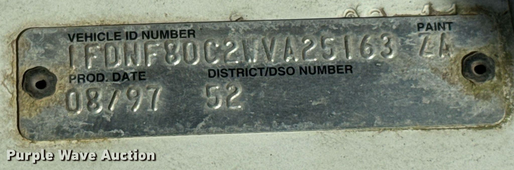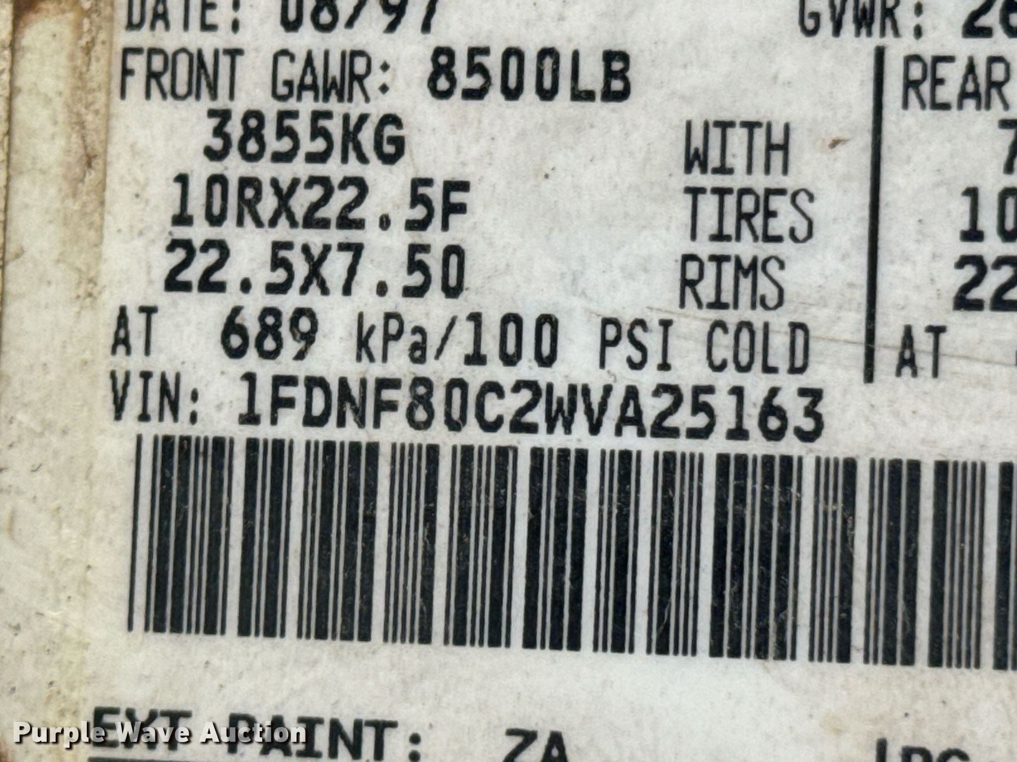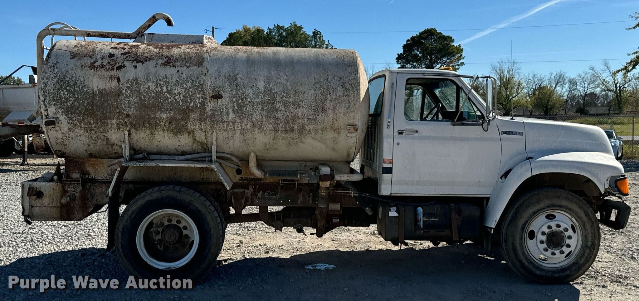 1998 Ford F800 water truck. Miles: 3,718 on odometer Actual mileage unknown, VIN: 1FDNF80C2WVA25163. Engine Cummins, Displacement: 5.9L, Cylinders: 6, Fuel type: Diesel. Transmission Manual, Speed: 5. Chassis Axles: Single, Suspension: Spring, Brakes: Hydraulic, PTO, GVWR: 26,000 lbs, Wheelbase: 153". Interior AC, Heat. Features Bed / tank Capacity: 2,000 gallons, 11' L x 96" W, Side discharge, Top fill. Tires Front: 10R22.5, Rear: 295/75R22.5. Notes Unknown operating condition of odometer. Oklahoma title. Mileage has not been verified. Exempt will be written in the odometer disclosure on the title. Title distribution may be delayed up to 14 days from verification of funds. Inola , OK 74036