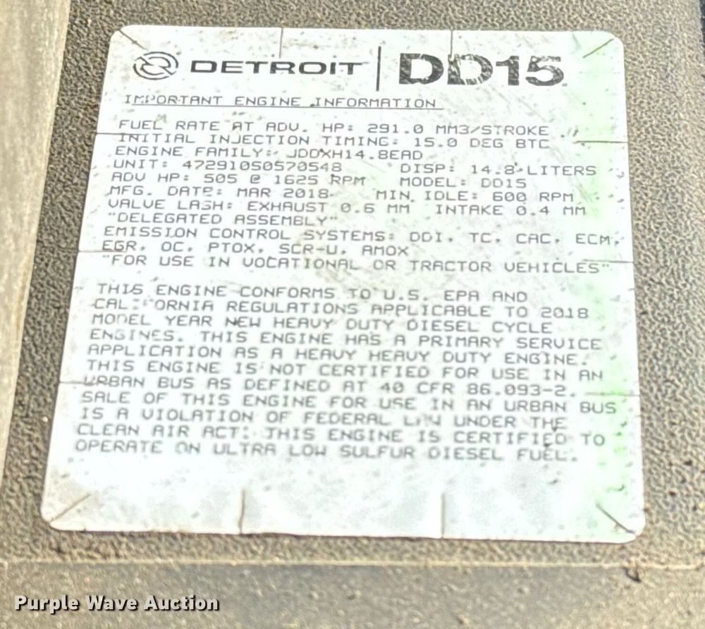 2019 Freightliner Cascadia semi truck. Miles: 798,567 on odometer, Engine hours: 20,932 on meter, VIN: 3AKJHHDR4KSKG0710. Engine Detroit DD15, Displacement: 14.8L, Cylinders: 6, Fuel type: Diesel, HP: 505, Engine brake. Transmission Automated manual. Chassis Axles: Tandem, Differential lock: Inter-axle, Suspension: Air Dump valves, Brakes: Air, GVWR: 53,300 lbs FAWR: 13,300 lbs, IAWR: 20,000 lbs, RAWR: 20,000 lbs. Interior AC, Heat, Heated mirrors, Power windows, Power locks, Cruise control, Air ride cab, Sleeper Sleeper length: 66", Beds: Double bunk, Rear climate control. Features Deck plate: Aluminum, Fifth wheel type: Air operated, Sliding, Fuel tank: Dual. Tires Size: 295/75R22.5. Notes Dash warning indicator: Check engine, Regen. Texas title. Seller is a Texas licensed motor vehicle dealer. The buyer may be required to pay sales tax and/or registration fees to the dealer prior to taking possession. Title will be assigned and distributed by the dealer. Please contact the seller for distribution questions. DeLucio USA. Donna, TX 78537