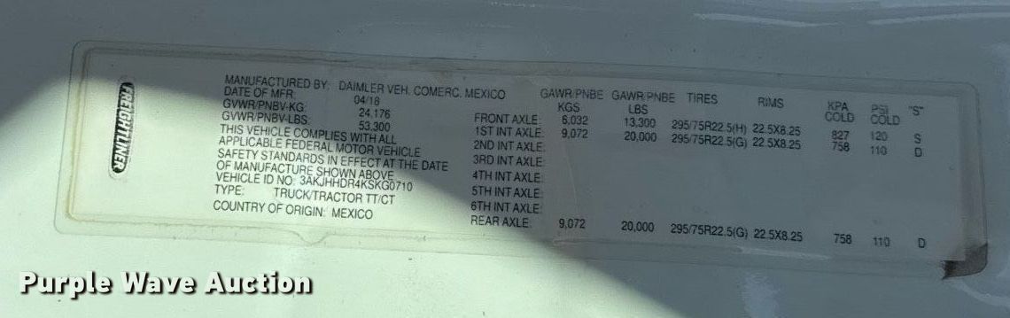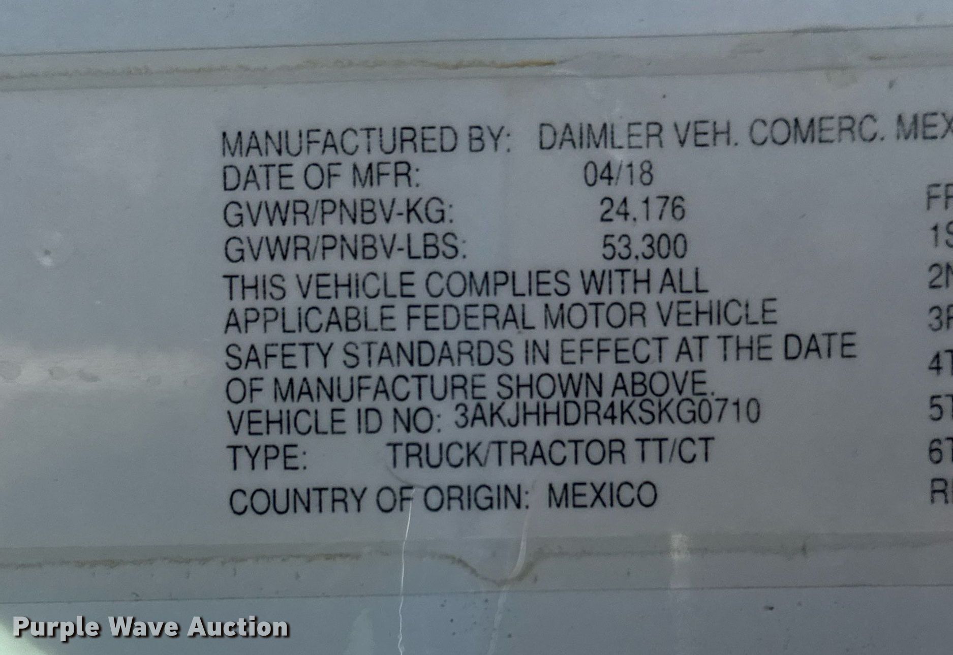 Purple Wave is selling a used Truck Tractor in Texas. This item is a 2019 Freightliner Cascadia semi truck with the following: Miles: 798,567 on odometer, Engine hours: 20,932 on meter, VIN: 3AKJHHDR4KSKG0710