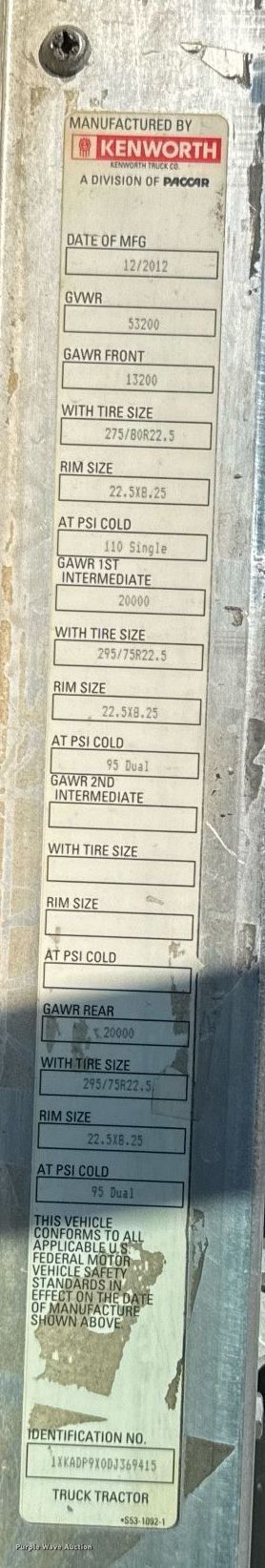 2013 Kenworth T660 semi truck. Miles: 738,815 on odometer, Hours: 23,229 on meter, VIN: 1XKADP9X0DJ369415. Engine Paccar, Serial: Y019250, Displacement: 12.9L, Cylinders: 6, Fuel type: Diesel, HP: 431, kW: 321, Engine brake. Transmission Eaton Fuller, Manual, Speed: 10. Chassis Axles: Tandem, Differential lock: Inter-axle, Suspension: Air Dump valves, Brakes: Air, GVWR: 53,200 lbs FAWR: 13,200 lbs, IAWR: 20,000 lbs, RAWR: 20,000 lbs. Interior AC, Heat, Heated mirrors, Power locks, Cruise control, Air ride cab, Sleeper AeroCab, Sleeper length: 60", Beds: Single, Rear climate control. Features Deck plate: Aluminum, Fifth wheel type: Air operated, Sliding, Fuel tank: Dual. Tires Front: 275/80R22.5, Rear: 295/75R22.5. Notes AC issues, does not blow cold, Windshield chipped or cracked. Lender owned. Item condition and history are unknown. Texas title. Seller is a Texas licensed motor vehicle dealer. The buyer may be required to pay sales tax and/or registration fees to the dealer prior to taking possession. Title will be assigned and distributed by the dealer. Please contact the seller for distribution questions. DeLucio USA. Donna, TX 78537