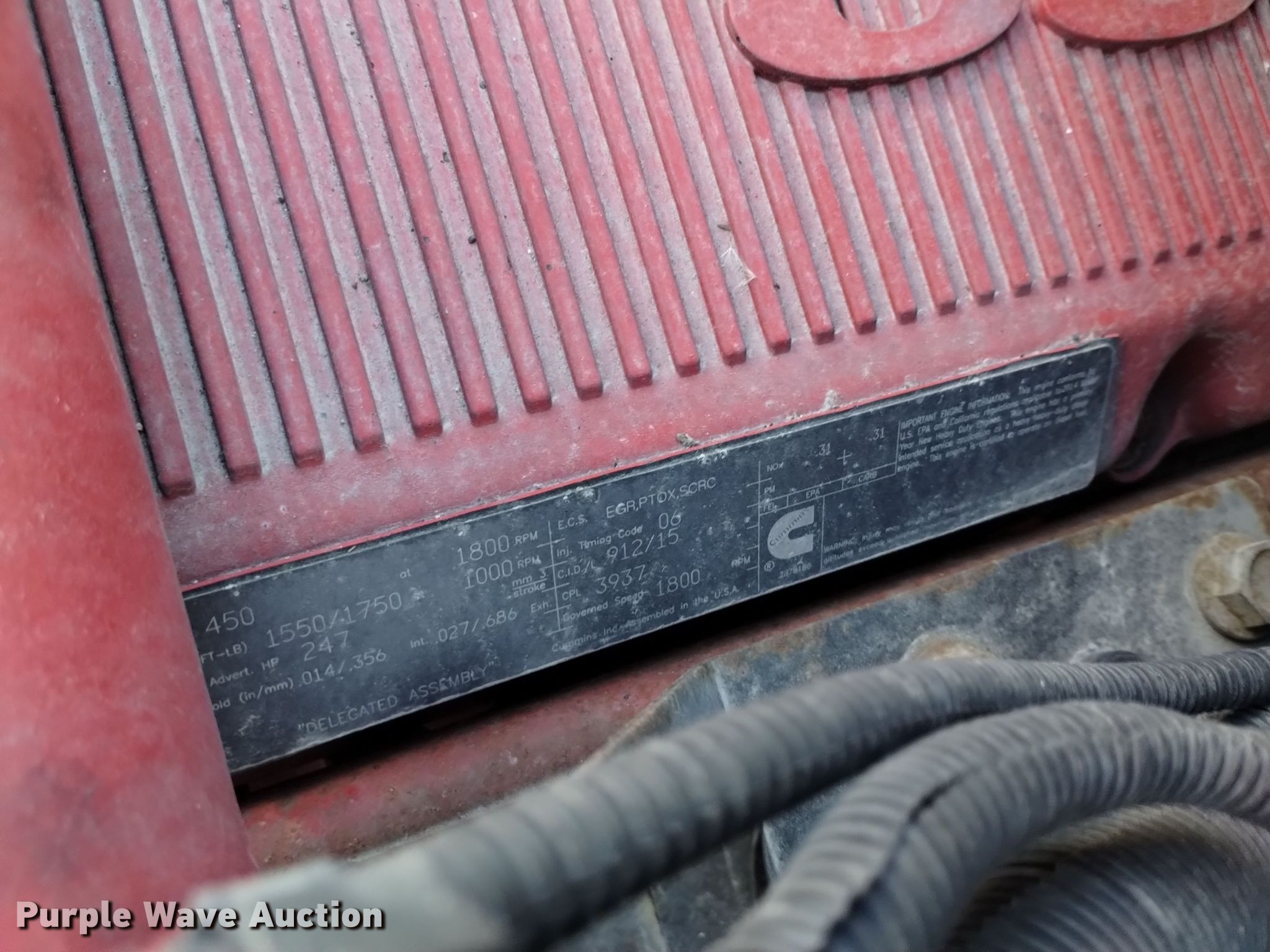 2015 International Prostar semi truck. Miles: 841,215 on odometer, Hours: 17,461 on meter, VIN: 3HSDJAPR0FN643139, Unit #: 2940. Engine Cummins ISX15, Displacement: 14.9L, Cylinders: 6, Fuel type: Diesel, Engine brake. Transmission Automated manual. Chassis Axles: Tandem, Differential lock: Inter-axle, Suspension: Air Dump valves, Brakes: Air, GVWR: 46,350 lbs FAWR: 12,350 lbs, IAWR: 17,000 lbs, RAWR: 17,000 lbs. Interior AC, Heat, Heated mirrors, Cruise control, Air ride cab, Sleeper Sleeper length: 42", Beds: Single, Rear climate control. Features Fifth wheel type: Fixed, Fuel tank: Dual. Tires Front: 295/75R22.5, Rear: 445/50R22.5. Notes Dead battery. Indiana title. Title distribution may be delayed up to 30 days from verification of funds. Wilbert Funeral Services. Lynn, IN 47355