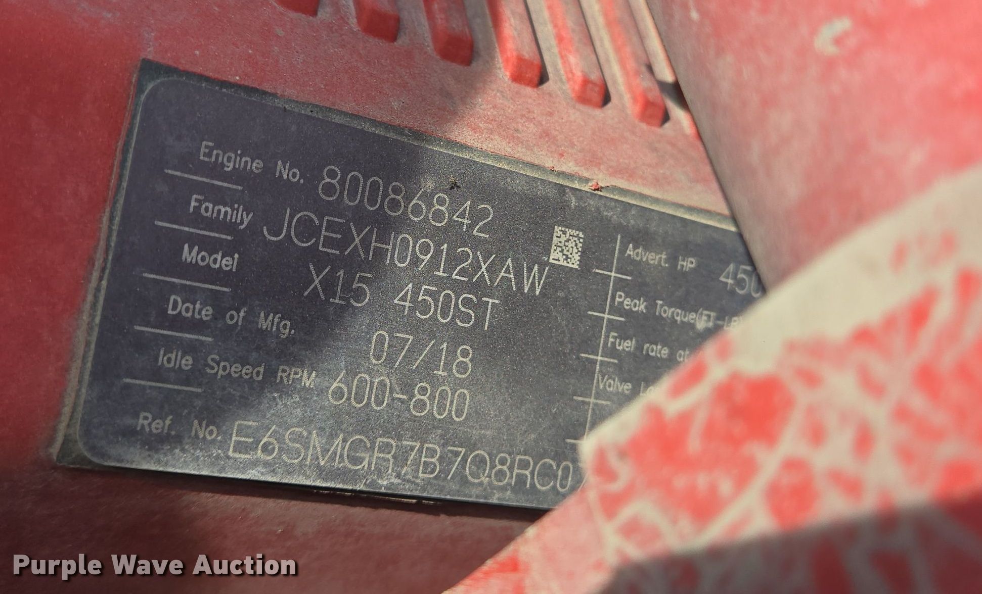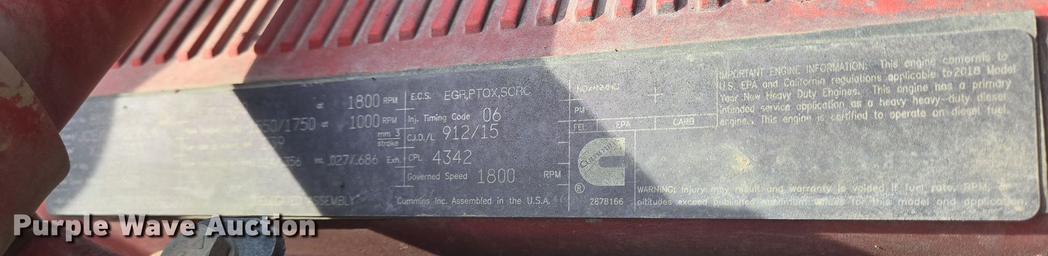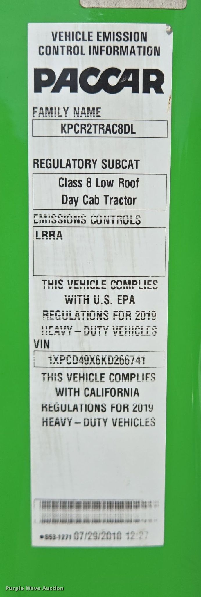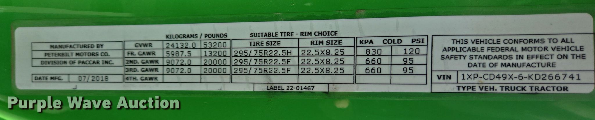 2019 Peterbilt 567 semi truck. Miles: 332,277 on odometer, VIN: 1XPCD49X6KD266741. Engine Cummins X15, Serial: 80086842, Displacement: 15.0L, Cylinders: 6, Fuel type: Diesel, HP: 450, Engine brake. Transmission Automated manual. Chassis Axles: Tandem, Differential lock: Full, Suspension: Air Dump valves, Brakes: Air, PTO, Wet kit, GVWR: 53,200 lbs FAWR: 13,200 lbs, IAWR: 20,000 lbs, RAWR: 20,000 lbs, Wheelbase: 214". Interior AC, Heat, Heated mirrors, Power windows, Power locks, Cruise control, Air ride cab. Features Deck plate: Aluminum, Fifth wheel type: Air operated, Sliding, Fuel tank: Single. Tires Size: 11R24.5. Notes Dash warning indicator: Adaptive cruise fault. Texas electronic title. Title has a lien that will be released following the close of the auction. A paper title will be printed once the lien is released. Title distribution may be delayed up to 45 days from verification of funds. Milstead Corp. Conroe, TX 77303