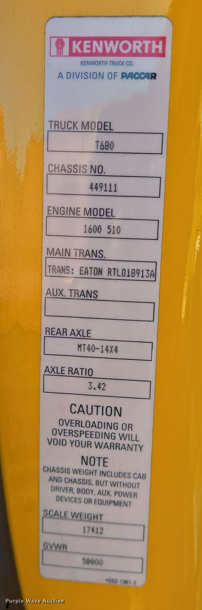 2021 Kenworth T680 semi truck. Miles: 602,030 on odometer, VIN: 1XKYPPOX4MJ449111. Engine Paccar MX-13, Displacement: 12.9L, Cylinders: 6, Fuel type: Diesel, Engine brake. Transmission Eaton Fuller RTLO18913A, Manual, Speed: 13. Chassis Axles: Triple, Pusher axle, Gear ratio: 3.42, Differential lock: Inter-axle, Suspension: Air Dump valves, Brakes: Air, GVWR: 58,000 lbs FAWR: 13,200 lbs, IAWR: 17,000 lbs, RAWR: 17,000 lbs, Lift axle GAWR: 12,350 lbs, Wheelbase: 280". Interior AC, Heat, Heated mirrors, Power windows, Power locks, Cruise control, Air ride cab. Features Deck plate: Aluminum, Fifth wheel type: Fixed, Fuel tank: Dual. Tires Size: 295/75R22.5. Notes Dash warning indicator: Check engine. Oklahoma title. Title distribution may be delayed up to 30 days from verification of funds. Gemini Motor Transport. Fernley, NV 89408