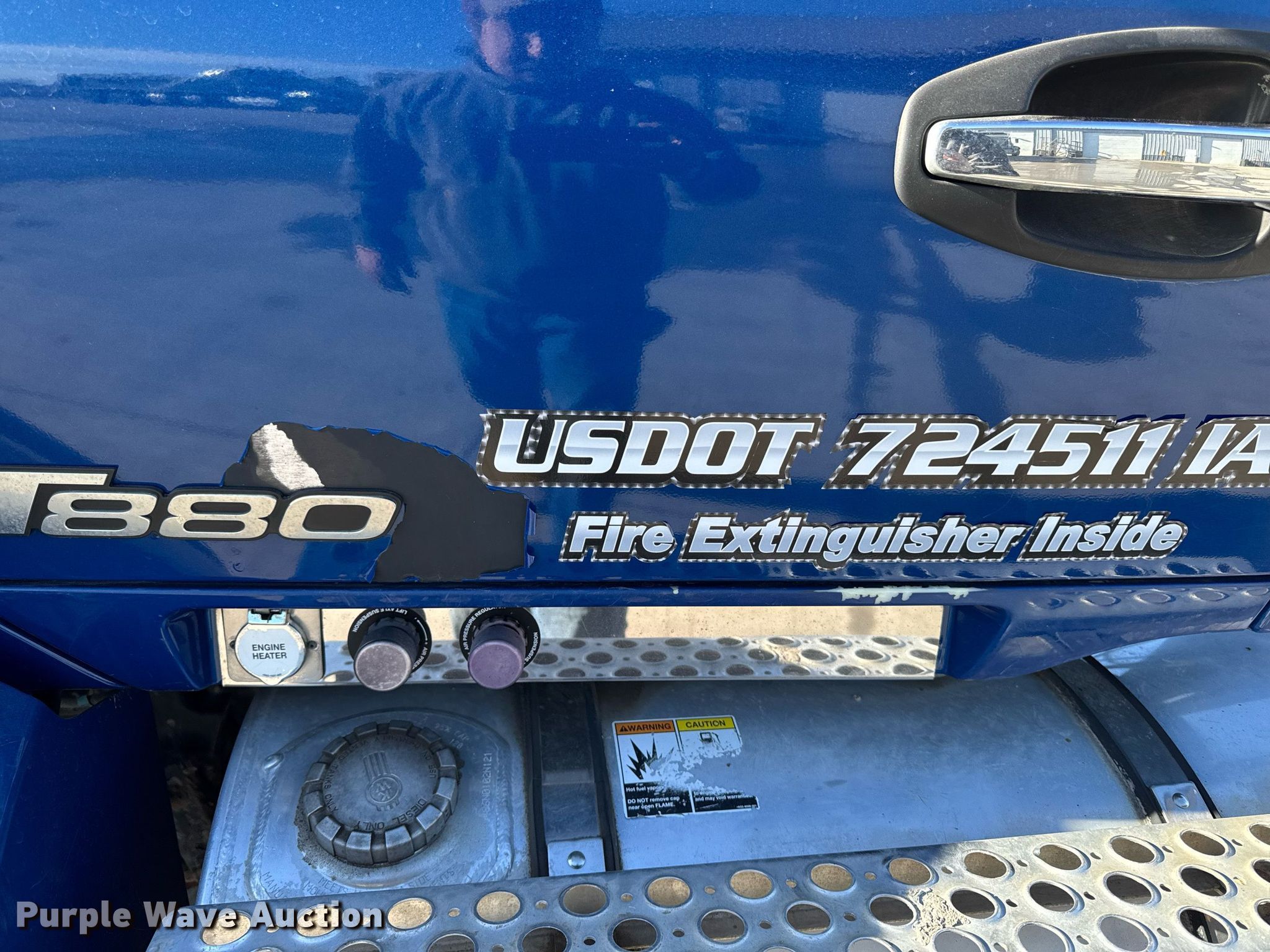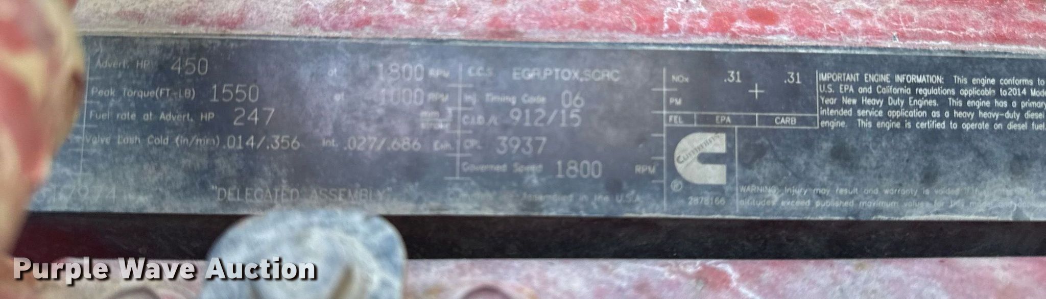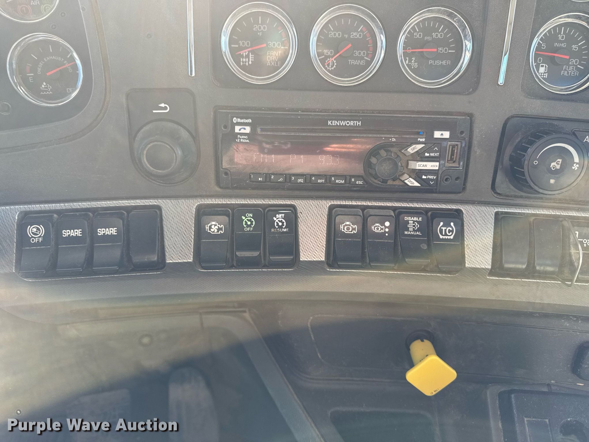 2015 Kenworth T880 roll-off container truck. Miles: 546,536 on odometer, Hours: 8,044 on meter, VIN: 1NKZX4EX0FJ447073. Engine Cummins ISX15, Displacement: 15.0L, Cylinders: 6, Fuel type: Diesel, HP: 450. Transmission Automatic. Chassis Axles: Four, Pusher axle Steerable, Suspension: Spring over walking beam, Brakes: Air, PTO, GVWR: 72,000 lbs GAWR: 13,000 lbs, RAWR: 22,000 lbs. Interior AC, Heat, Heated mirrors, Power windows, Power locks, Cruise control, Auxiliary controls. Features Hook lift bed Pioneer RP4500 SARG, Serial: 22160, 20' L x 96" W, Roll tarp. Tires Front: 425/65R22.5, Rear: 11R22.5, Lift axle: 265/70R22.5. Iowa title. Title distribution may be delayed up to 14 days from verification of funds. Larry Fleck & Son Trucking, LLC. Des Moines, IA 50327