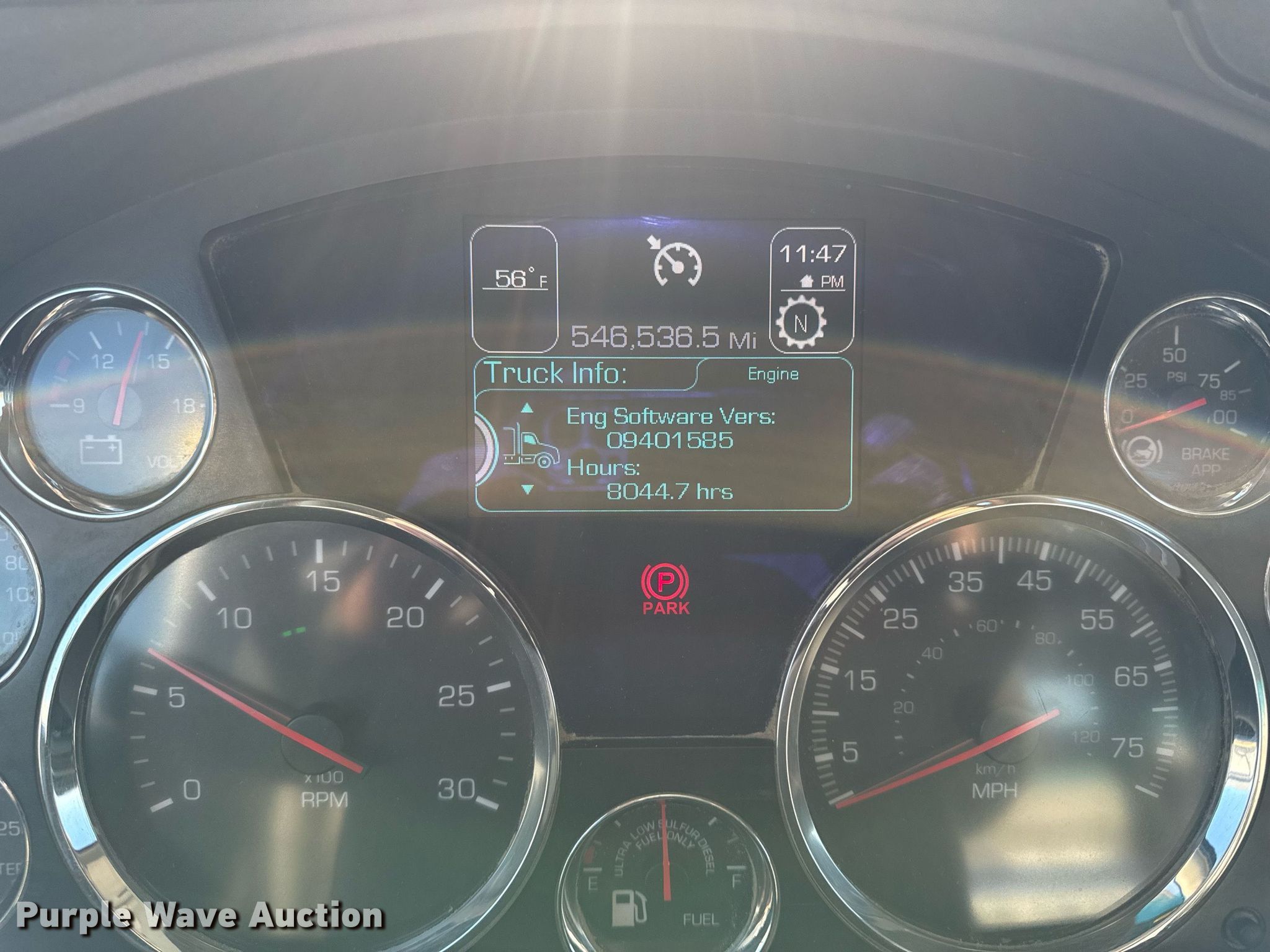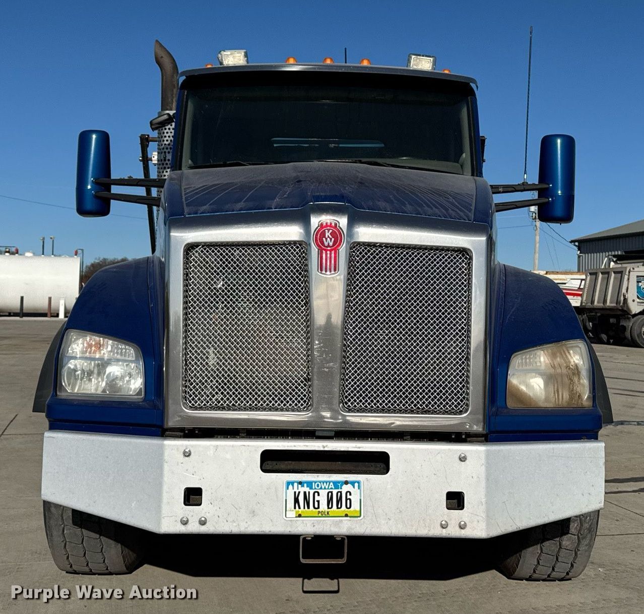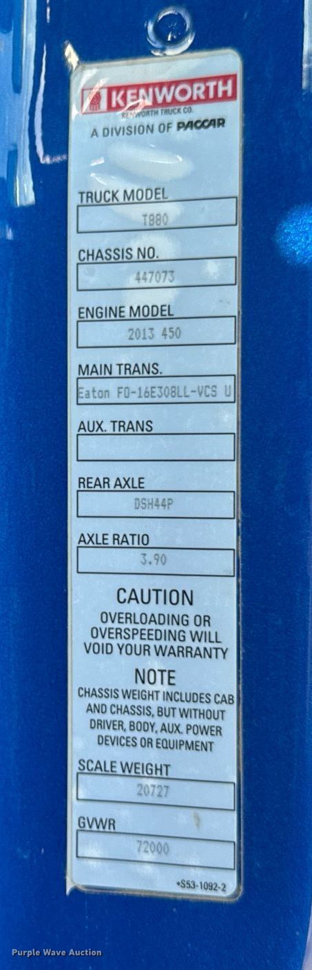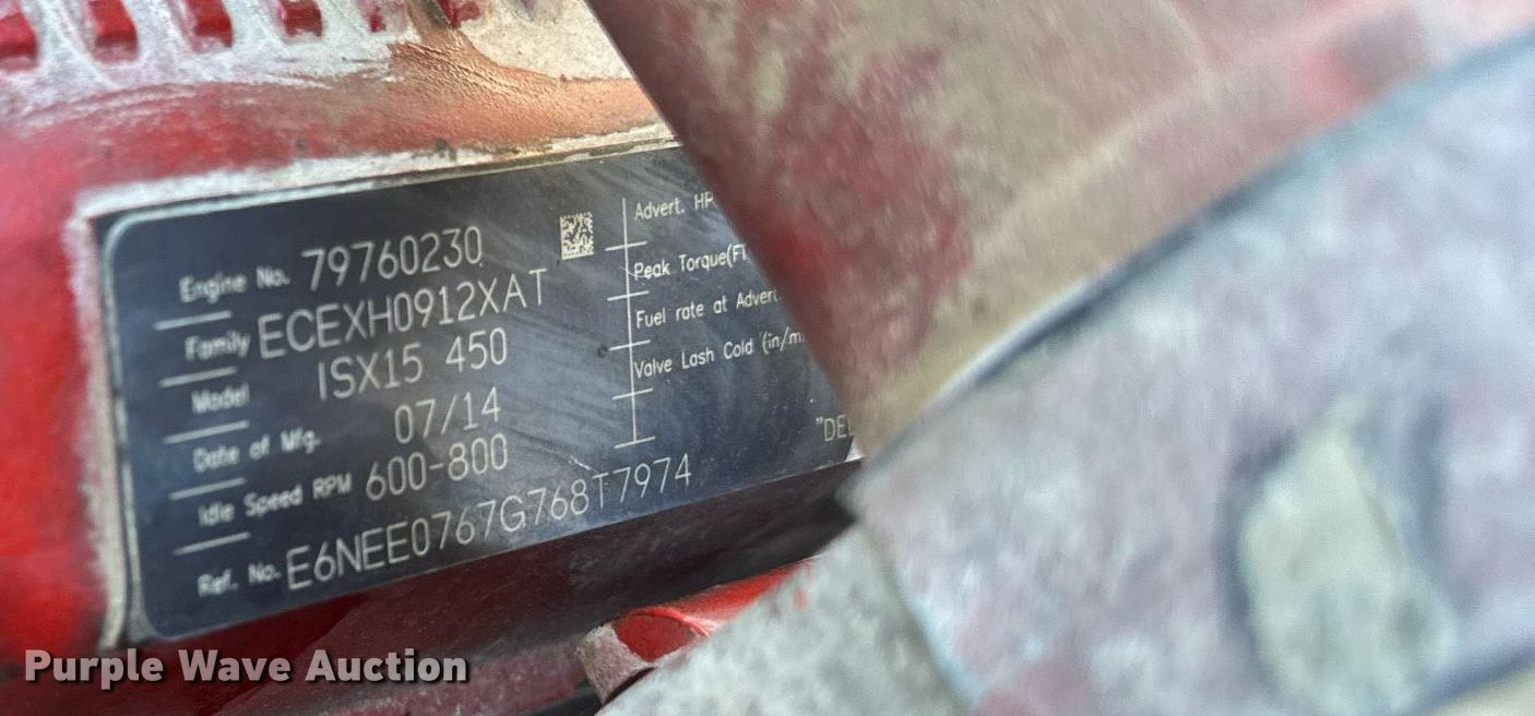 2015 Kenworth T880 roll-off container truck. Miles: 546,536 on odometer, Hours: 8,044 on meter, VIN: 1NKZX4EX0FJ447073. Engine Cummins ISX15, Displacement: 15.0L, Cylinders: 6, Fuel type: Diesel, HP: 450. Transmission Automatic. Chassis Axles: Four, Pusher axle Steerable, Suspension: Spring over walking beam, Brakes: Air, PTO, GVWR: 72,000 lbs GAWR: 13,000 lbs, RAWR: 22,000 lbs. Interior AC, Heat, Heated mirrors, Power windows, Power locks, Cruise control, Auxiliary controls. Features Hook lift bed Pioneer RP4500 SARG, Serial: 22160, 20' L x 96" W, Roll tarp. Tires Front: 425/65R22.5, Rear: 11R22.5, Lift axle: 265/70R22.5. Iowa title. Title distribution may be delayed up to 14 days from verification of funds. Larry Fleck & Son Trucking, LLC. Des Moines, IA 50327