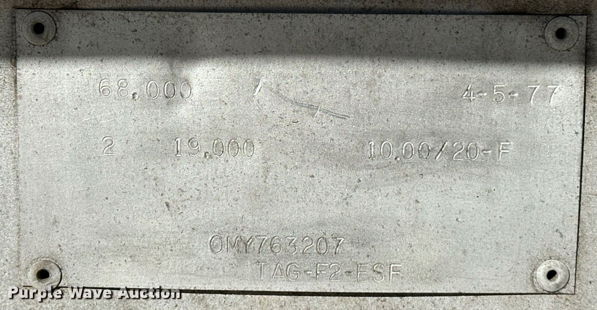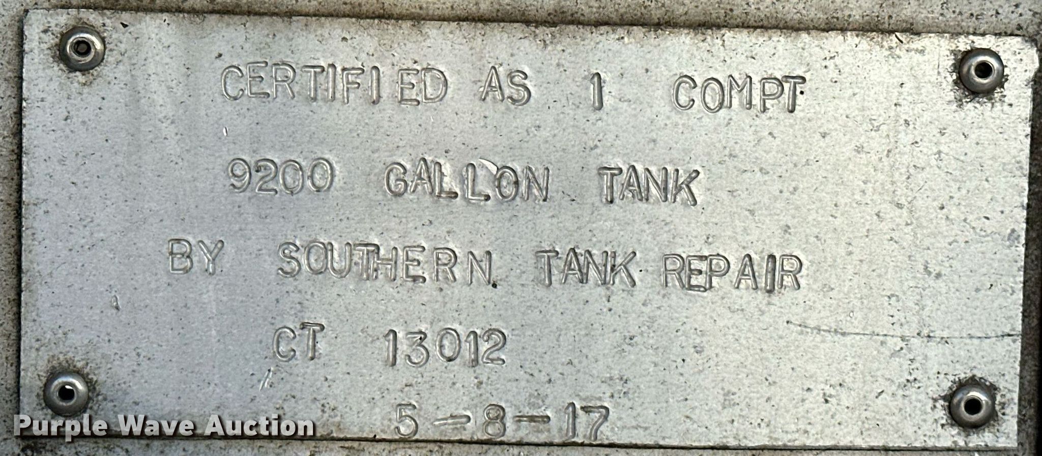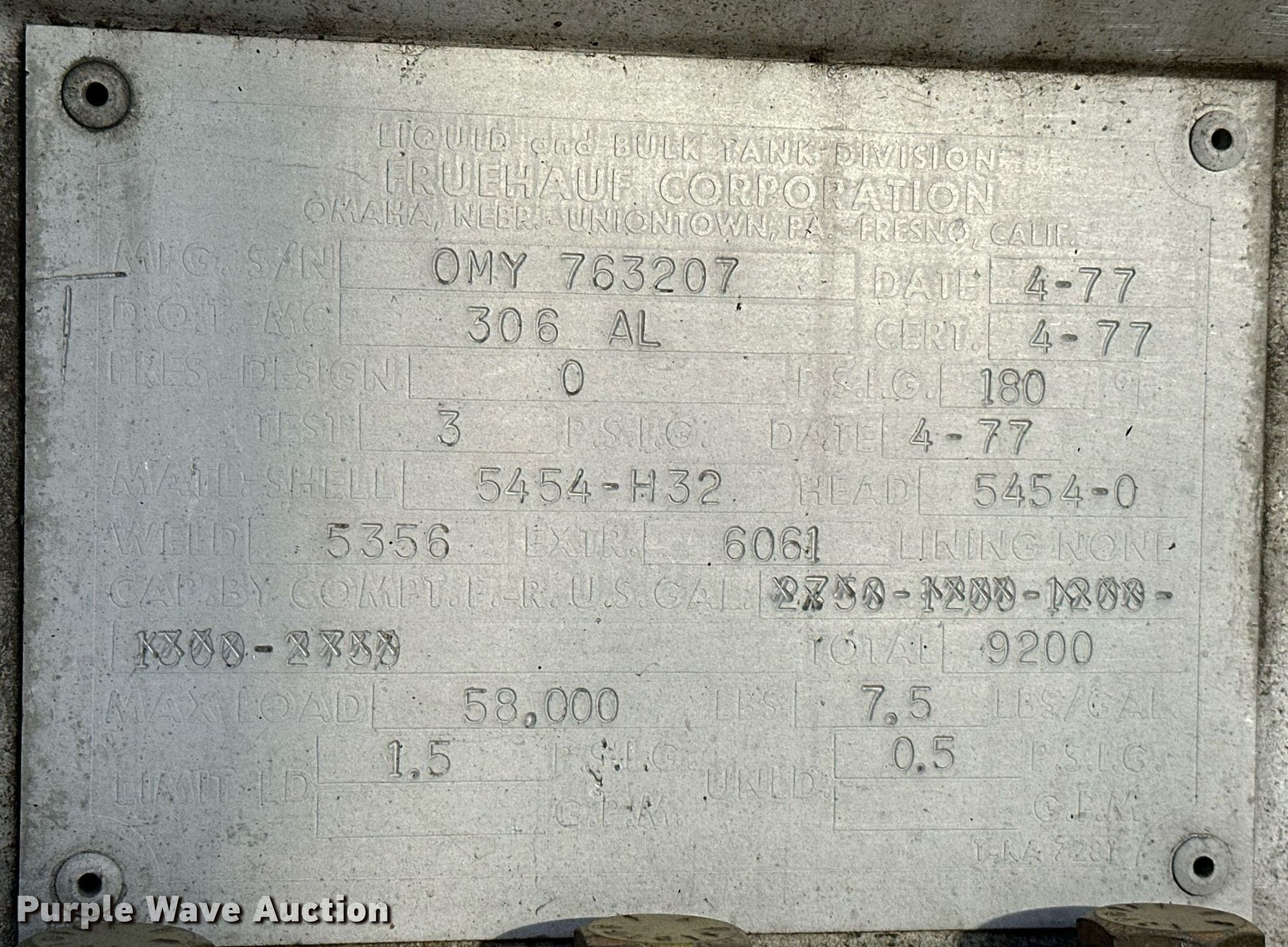 1978 Freuhauf TAG-F2-ESF tank trailer. VIN: OMY763207, Unit #: 850. Dimensions Overall: 41' L x 96" W. Features Tank type: Aluminum Capacity: 9,200 gallons, Compartments: 1, Baffles: 4, Outlet valves: 1 Size: 4", Relief valve size: 5", No. of manways/manholes: 1 Width: 20". Chassis Landing gear: Dual, Suspension: Spring, Brakes: Air, Axles: Tandem. Tires Steel wheels, Size: 285/75R24.5. Notes Semi not included. Titles will be distributed after confirmation of payment and removal. Tennessee title. Frontier Logistical Services, LLC. North Little Rock, AR 72117