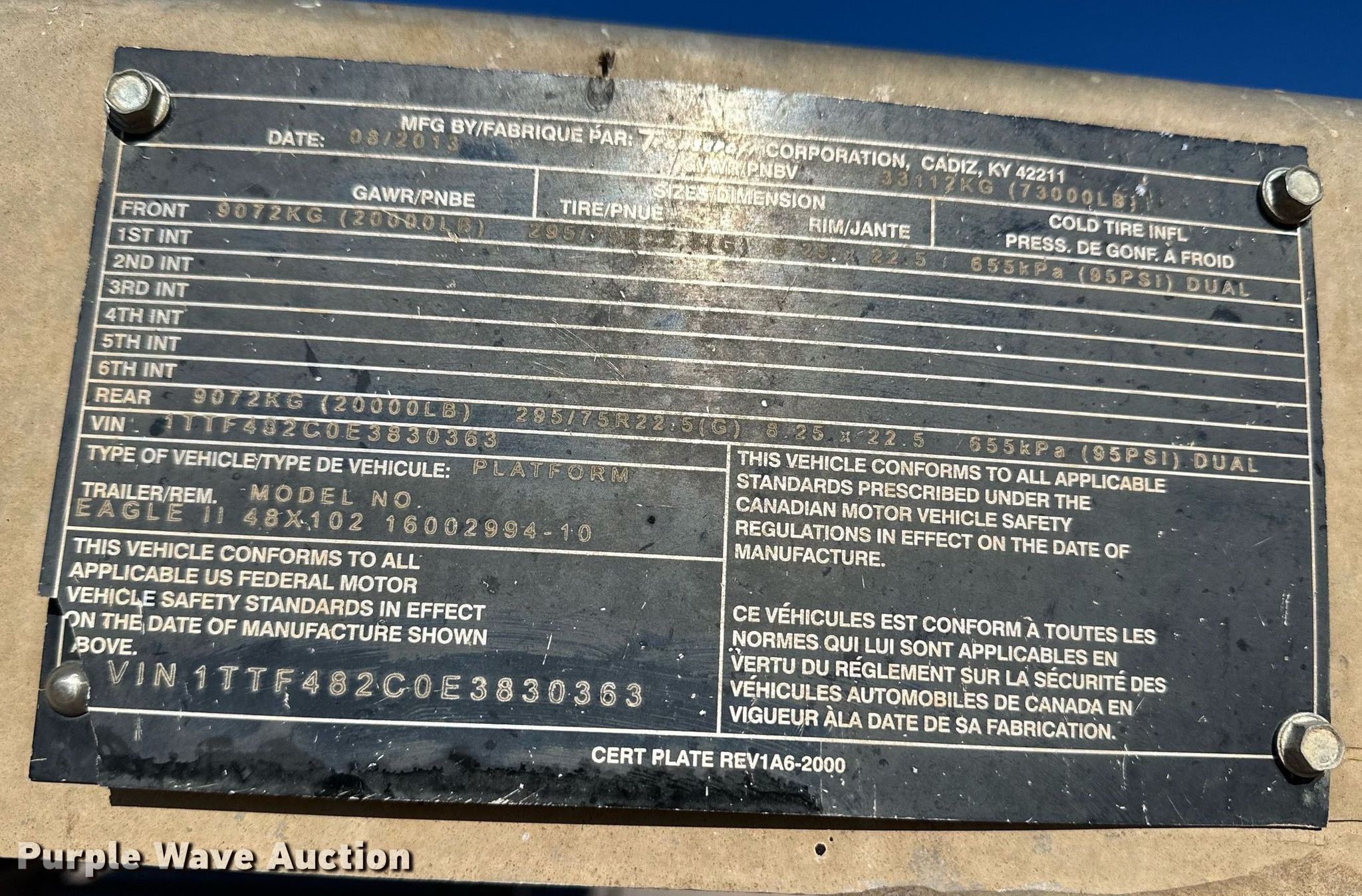 2014 Transcraft Eagle II flatbed trailer. VIN: 1TTF482C0E3830363. Dimensions Overall: 48' L x 102" W. Features Deck type: Aluminum. Chassis Landing gear: Dual, Suspension: Air, Brakes: Air, Axles: Tandem Sliding, GVWR: 73,000 lbs, GAWR: 20,000 lbs. Tires Aluminum wheels, Size: 295/75R22.5. Oklahoma title. Title distribution may be delayed up to 14 days from verification of funds. Custom Equipment Rental, Inc.. Sharon, OK 73857