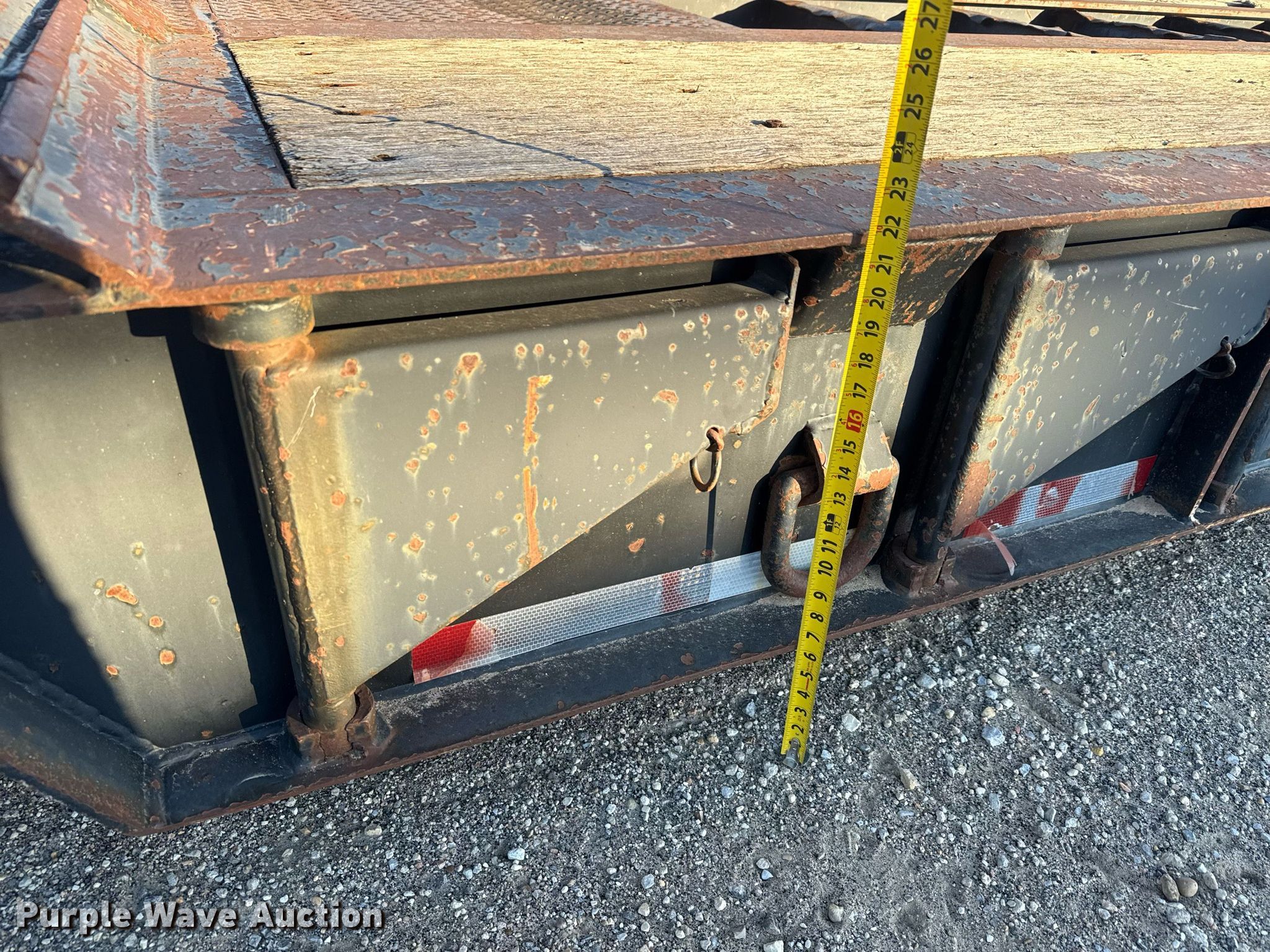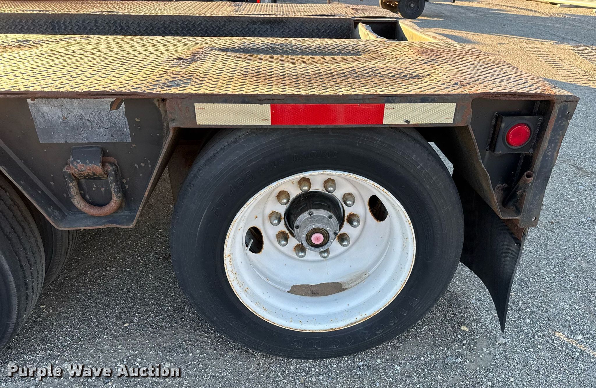 1990 Trail King TK100DGP-503 lowboy equipment trailer. VIN: 1TKH05039LM105054. Dimensions Overall: 51' 6" L x 102" W, Deck: 24' L x 102" W, Top deck length: 13', Rear deck length: 12' 6". Features Deck type: Steel, Wood, Outriggers: Swing-out, Neck type: Detachable, Self-contained hydraulics, Hydraulic controls: Manual. Chassis Landing gear: Hydraulic, Suspension: Air, Brakes: Air, Axles: Triple, GVWR: 122,700 lbs, GAWR: 20,280 lbs. Tires Steel wheels, Size: 255/70R22.5. Kansas title. Title distribution may be delayed up to 14 days from verification of funds. UCI. Wichita, KS 67209