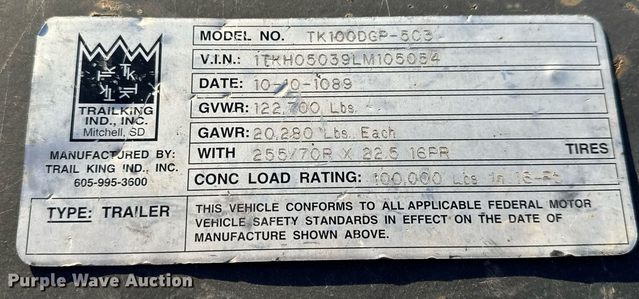Purple Wave is selling a used Equip. Trailer in Kansas. This item is a 1990 Trail King TK100DGP-503 lowboy equipment trailer with the following: VIN: 1TKH05039LM105054