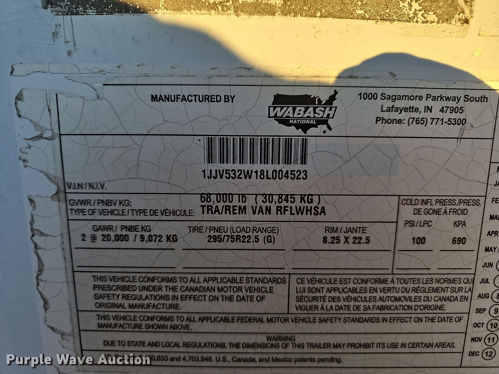 Purple Wave is selling a used Refrigerated Van Trailer in Missouri. This item is a 2008 Wabash refrigerated van trailer with the following: VIN: 1JJV532W18L004523, Unit #: 11014
