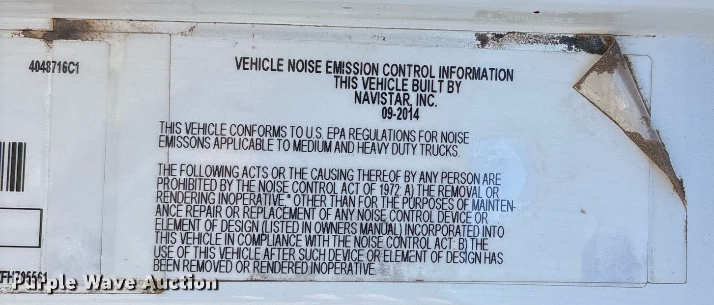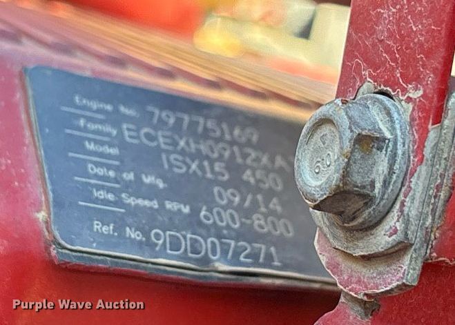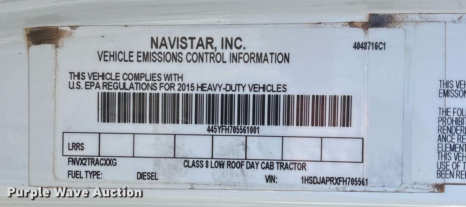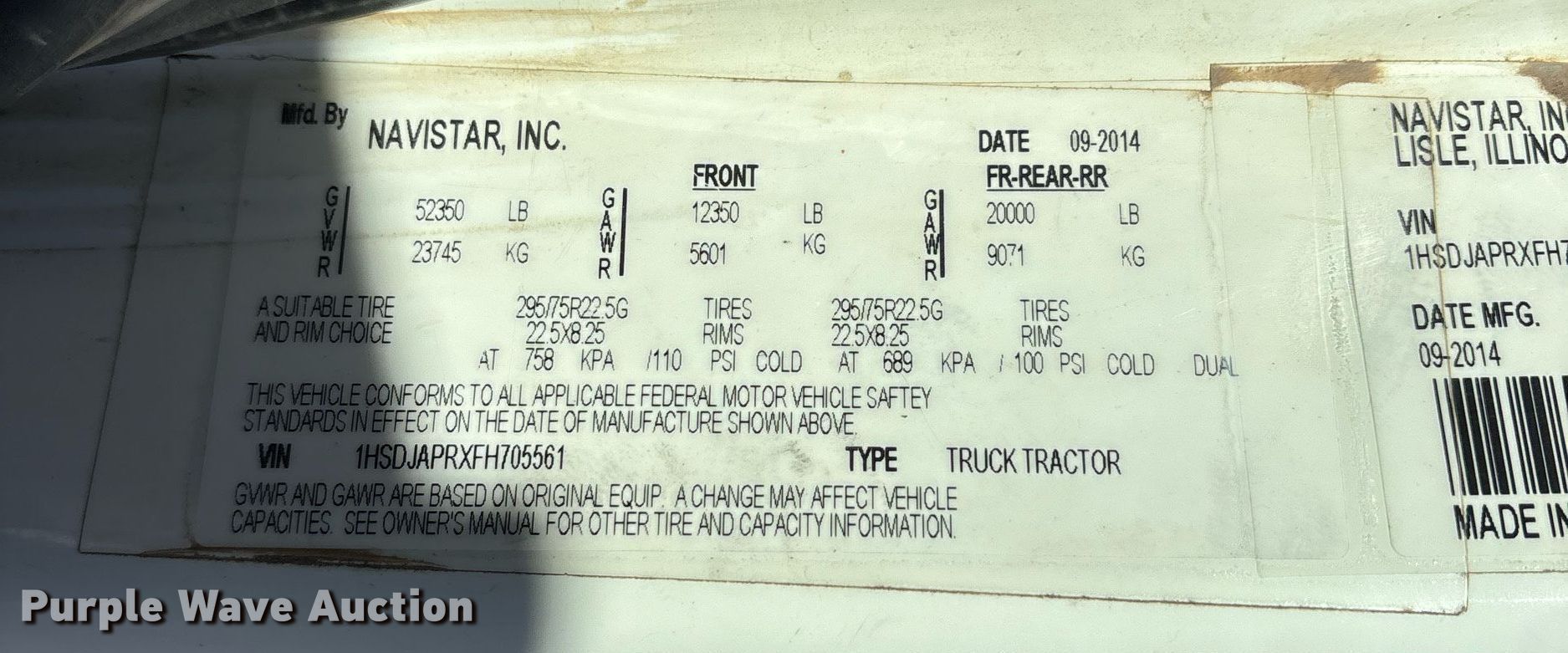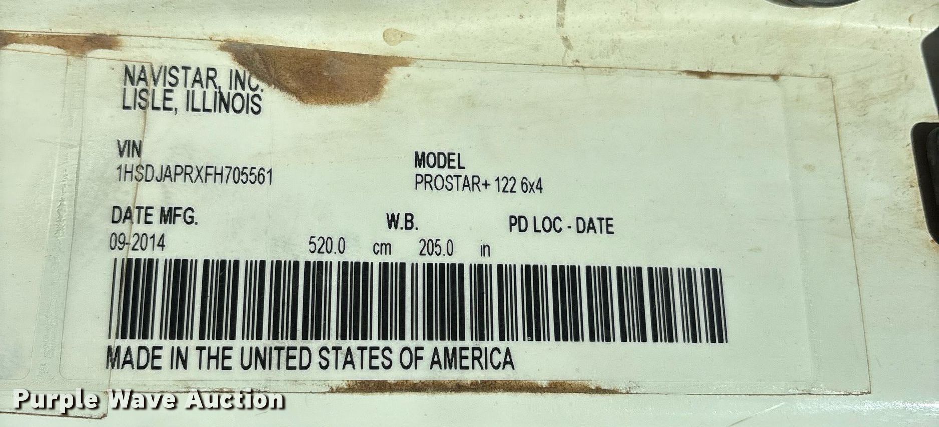 2015 International Prostar dump truck. Miles: 487,223 on odometer, Hours: 18,808 on meter, VIN: 1HSDJAPRXFH705561. Engine Cummins ISX15, Displacement: 15.0L, Cylinders: 6, Fuel type: Diesel, Engine brake. Transmission Eaton Fuller, Manual, Speed: 10. Chassis Axles: Tandem, Differential lock: Full, Suspension: Air Dump valves, Brakes: Air, PTO, GVWR: 52,350 lbs FAWR: 12,350 lbs, IAWR: 20,000 lbs, RAWR: 20,000 lbs, Wheelbase: 205". Interior AC, Heat, Heated mirrors, Power windows, Cruise control. Features Dump bed 14' L x 8' W, Side height: 43", Side board height: 8", Bed type: Steel, Barrel, Roll tarp, Ram: Single, End gate: Air operated. Tires Size: 11R22.5. Notes Windshield chipped or cracked. Texas title. Title has a lien that will be released following the close of the auction. Title distribution may be delayed up to 30 days from verification of funds. Welch Excavation. Winona, TX 75792