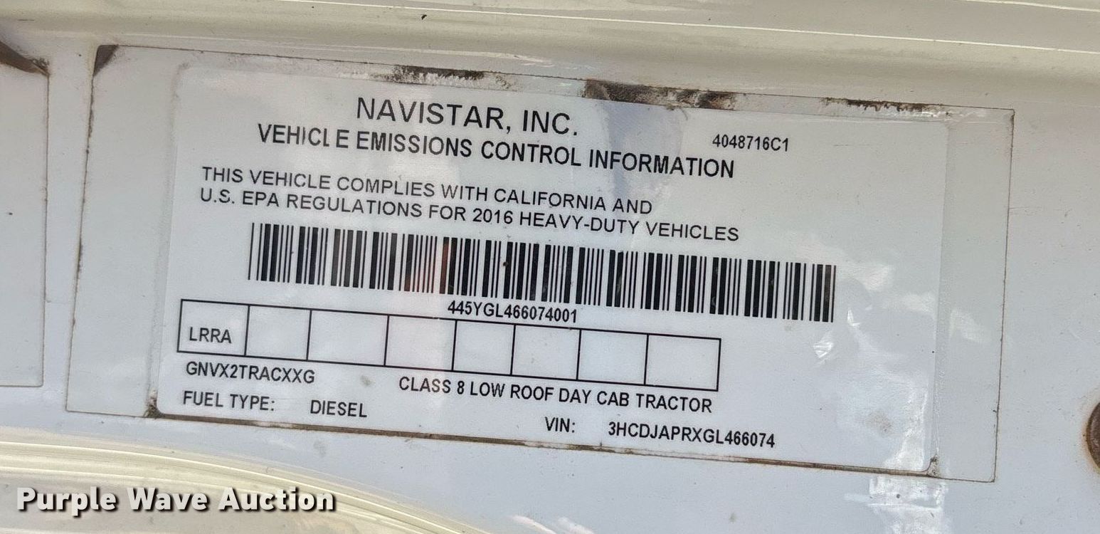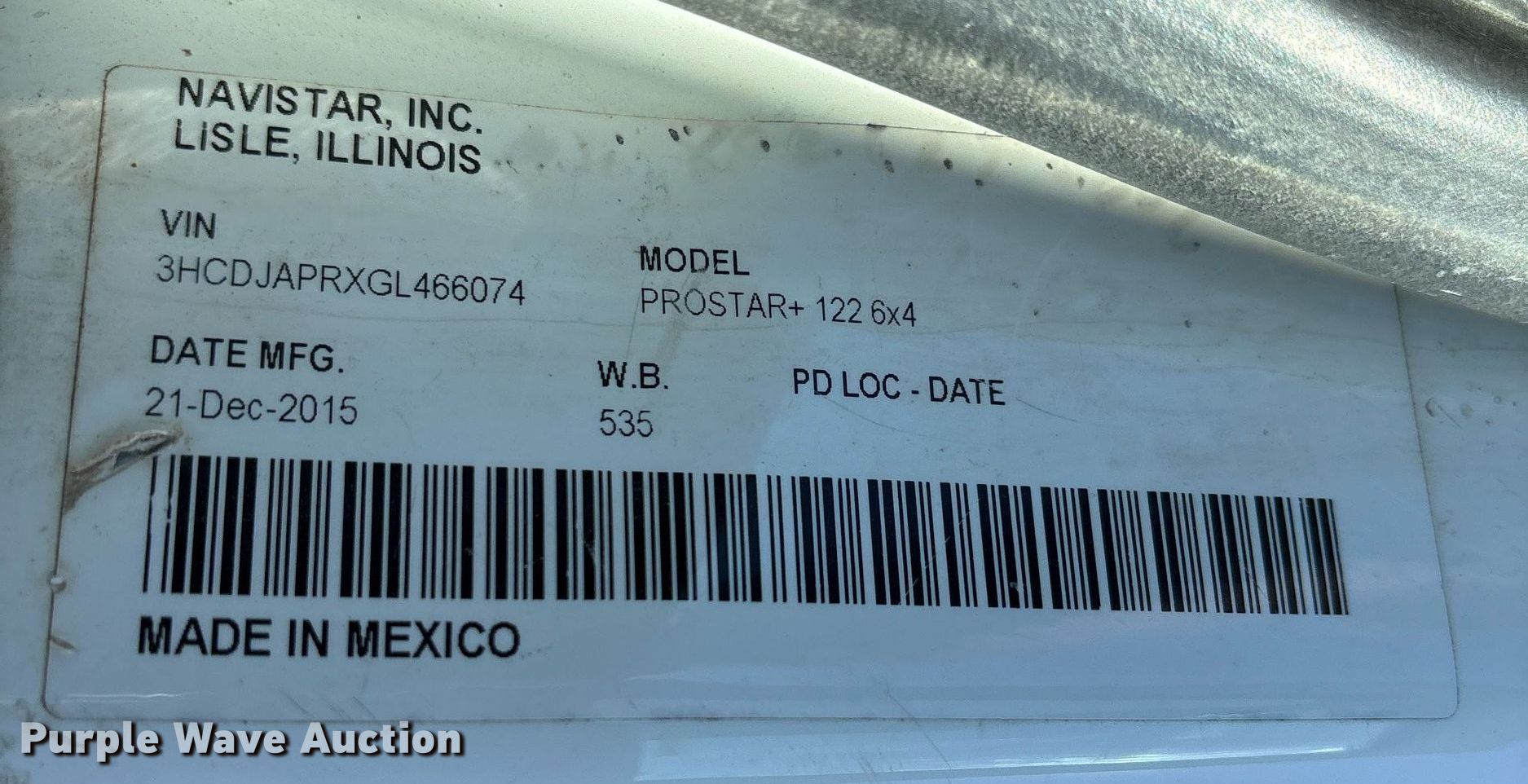 2016 International Prostar Plus 122 dump truck. Miles: Unknown, VIN: 3HCDJAPRXGL466074, Unit #: 14023. Engine Cummins ISX15, Displacement: 15.0L, Cylinders: 6, Fuel type: Diesel, Engine brake. Transmission Eaton Fuller, Manual, Speed: 10. Chassis Axles: Tandem, Differential lock: Full, Suspension: Air Dump valves, Brakes: Air, PTO, GVWR: 53,220 lbs FAWR: 13,220 lbs, IAWR: 20,000 lbs, RAWR: 20,000 lbs. Interior AC, Heat, Heated mirrors, Power windows, Cruise control. Features Dump bed Brazos, 14' L x 8' W, Side height: 44", Side board height: 10", Bed type: Steel, Barrel, Roll tarp, Ram: Single, End gate: Air operated. Tires Size: 11R22.5. Notes Windshield chipped or cracked, Dead battery, Bent frame, Bent dump bed, Non-operational unit. Texas title. Mileage has not been verified. Odometer discrepancy will be marked on the title. Title has a lien that will be released following the close of the auction. Title distribution may be delayed up to 30 days from verification of funds. Welch Excavation. Winona, TX 75792
