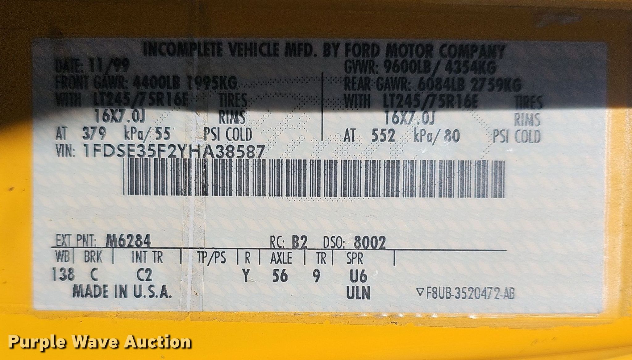 - VIN: 1FDSE35F2YHA38587