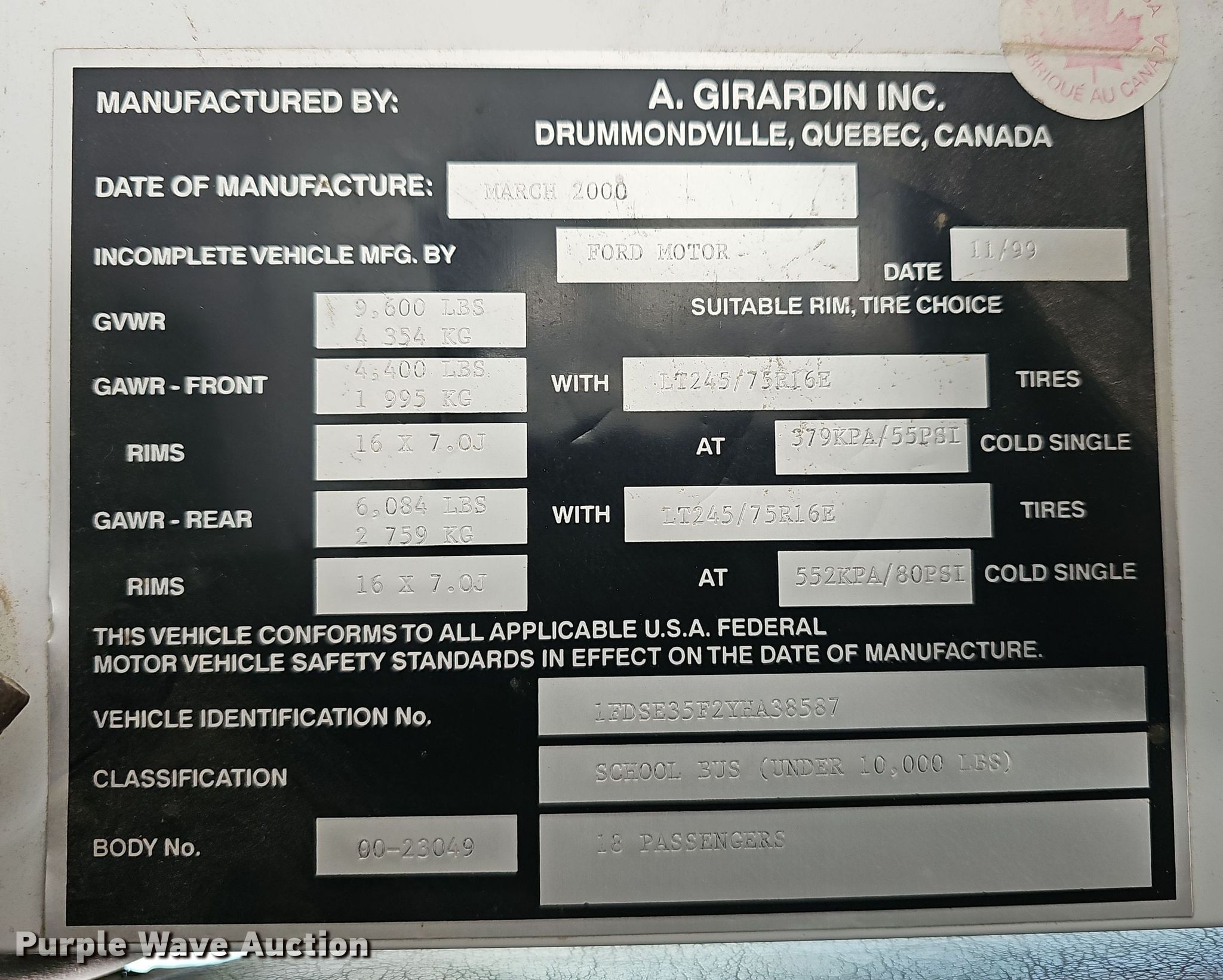 2000 Blue Bird E350 Super Duty school bus. Miles: 168,264 on odometer, VIN: 1FDSE35F2YHA38587, Unit #: 49. Engine Displacement: 7.3L, Cylinders: 8, Fuel type: Diesel. Transmission Automatic. Chassis Axles: Single, Suspension: Spring, Brakes: Hydraulic, GVWR: 9,600 lbs, Wheelbase: 138". Interior Heat, Heated mirrors, Passengers: 18. Tires Size: 245/75R16, Brand: Bridgestone. Kansas title. Title distribution may be delayed up to 14 days from verification of funds. Chapman, KS 67431