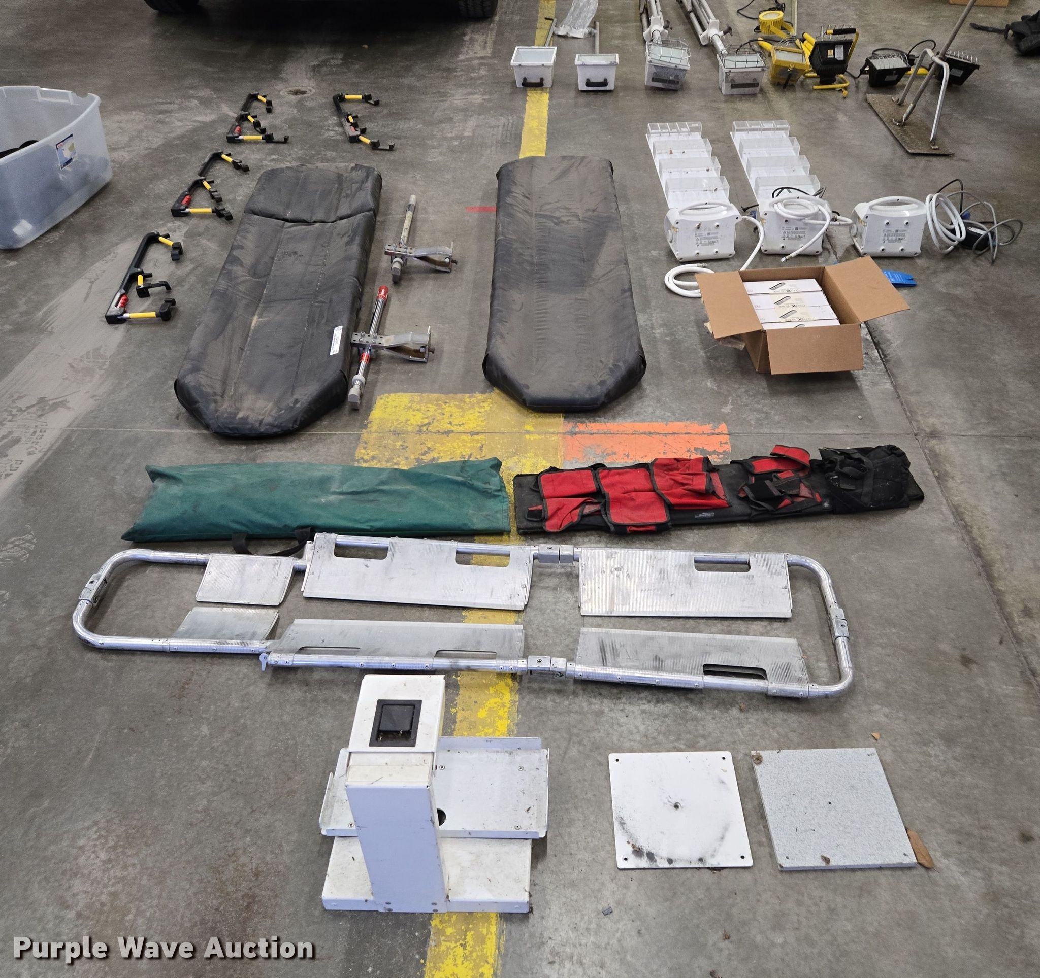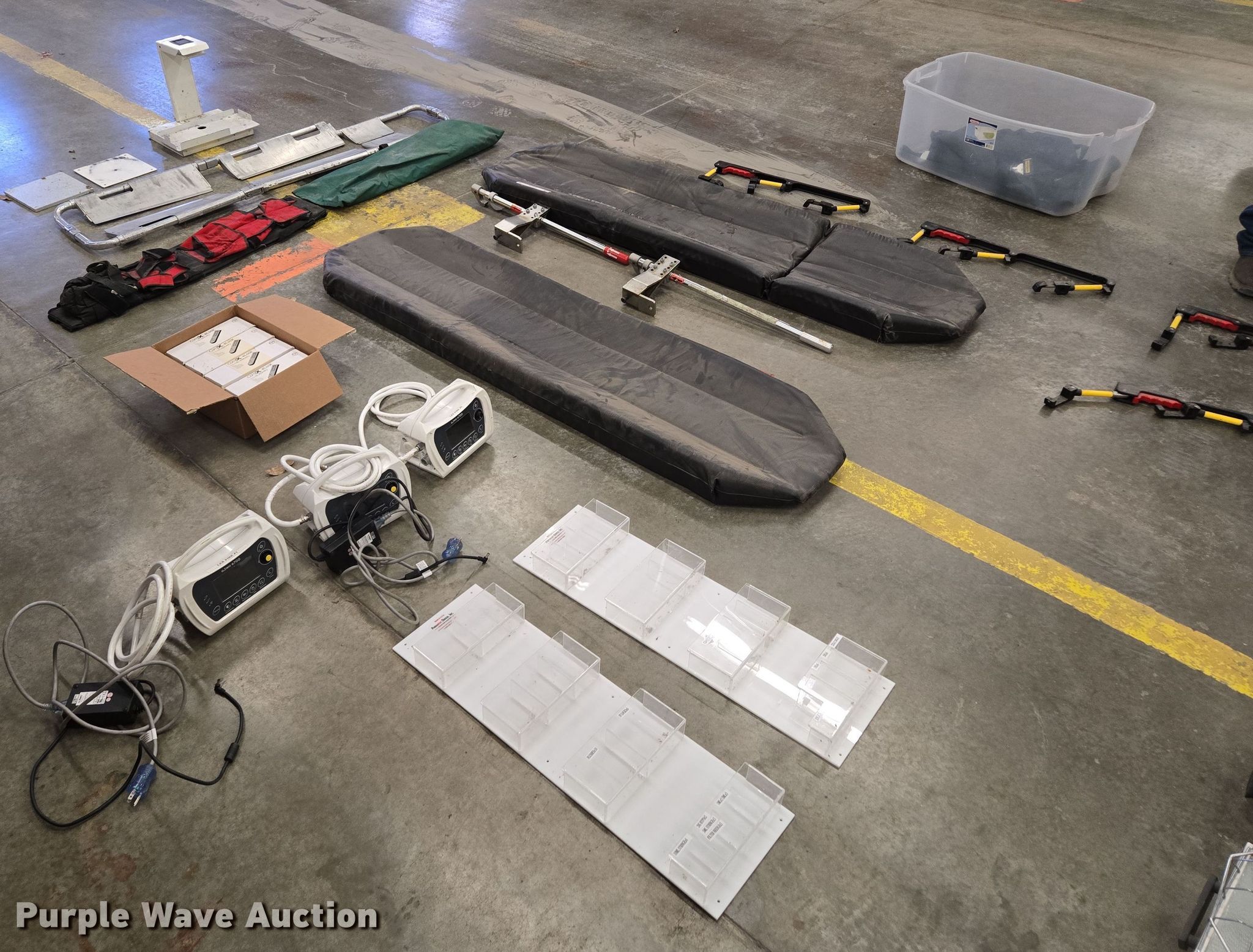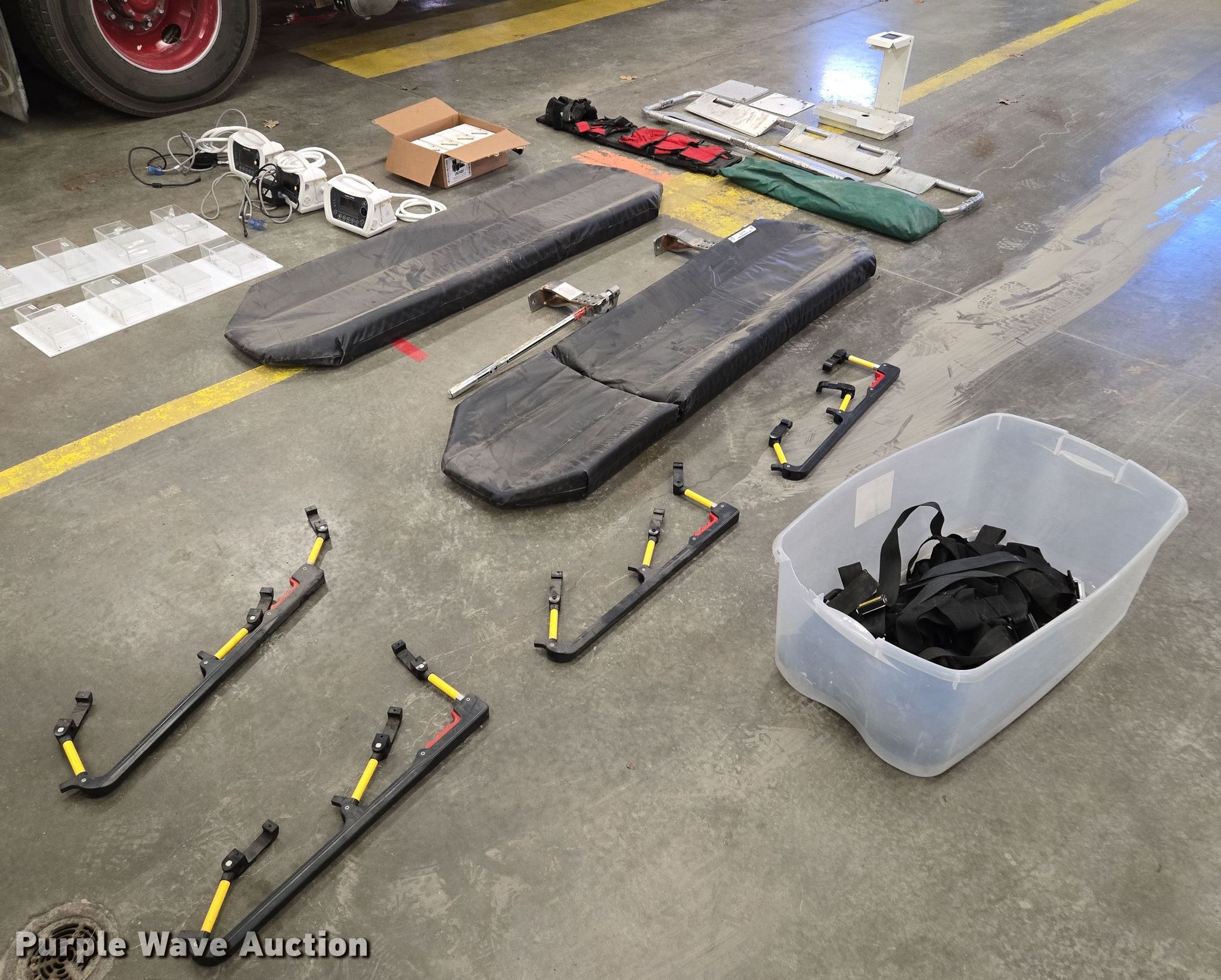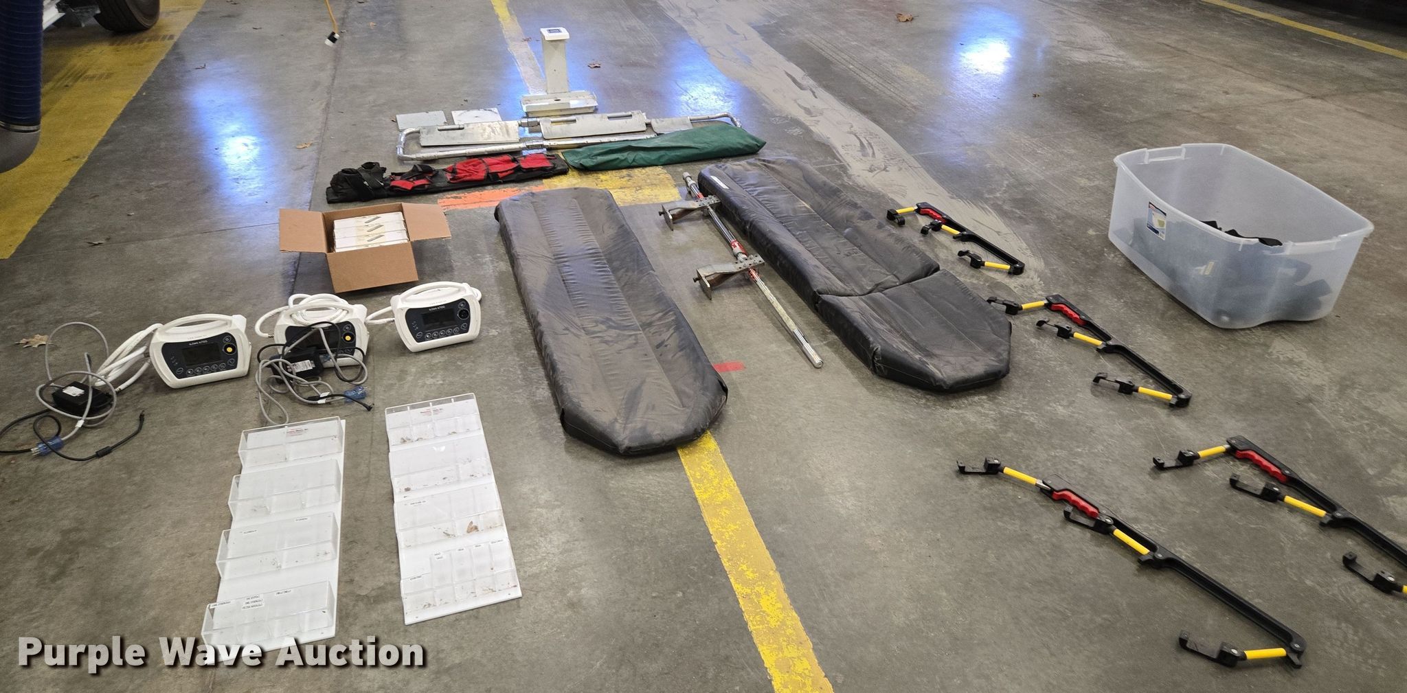 Purple Wave is selling a used Medical Equip. in Missouri. This item is a Medical equipment with the following: (4) CompX eLock electronic keypads, (4) stretcher rails, (3) O-two e700 ventilators, (2) stretcher pads, Back board