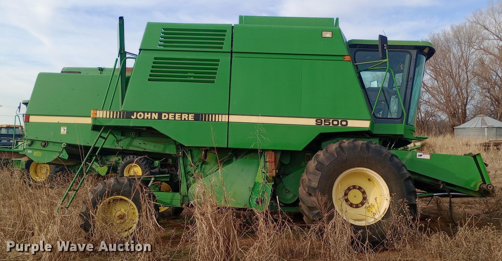 Purple Wave is selling a used Combine in Oklahoma. This item is a 1990 John Deere 9500 combine with the following: Engine hours: 2,676 on meter, Separator hours: 4,861 on meter, Serial: H09500X637154