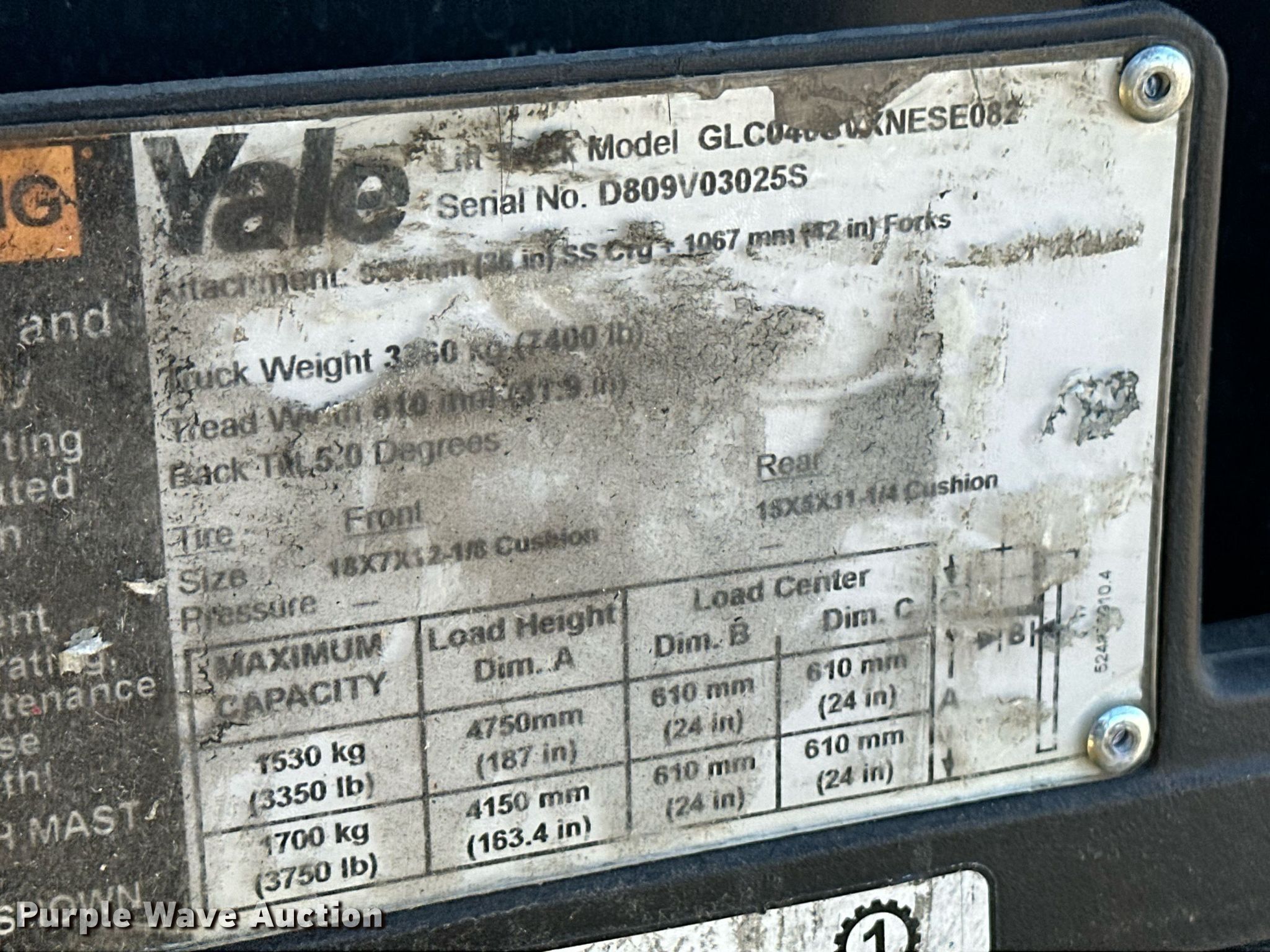 Purple Wave is selling a used Warehouse Forklift in Kansas. This item is a Yale GLC040VXNESE082 forklift with the following: Hours: 21,618 on meter, Serial: D809V03025S