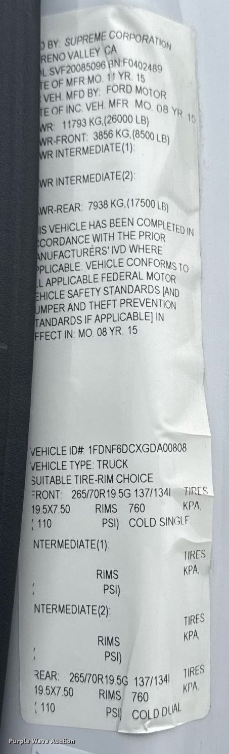 2016 Ford F650 Super Duty box truck. Miles: 230,843 on odometer, VIN: 1FDNF6DCXGDA00808. Engine Displacement: 6.7L, Cylinders: 8, Fuel type: Diesel. Transmission Automatic. Chassis Axles: Single, Suspension: Spring, Brakes: Hydraulic, GVWR: 26,000 lbs, Wheelbase: 230". Interior AC, Heat, Power windows, Power locks, Cruise control, Auxiliary controls. Features Box bed Supreme Corp, 20' L x 96" W x 90" H, Floor: Wood, Shelving. Tires Size: 235/70R19.5. Oklahoma title. Title distribution may be delayed up to 14 days from verification of funds. Collinsville, OK 74021