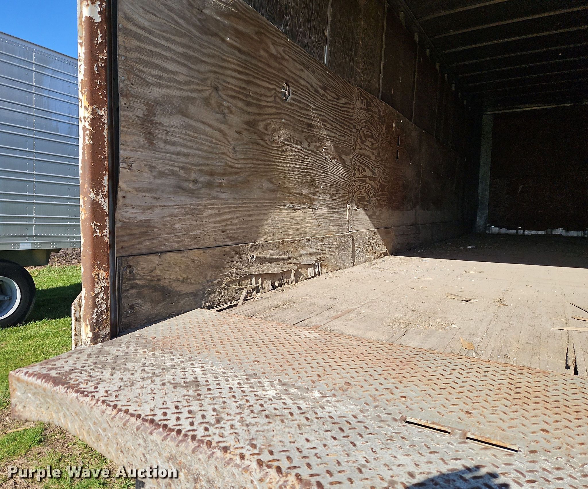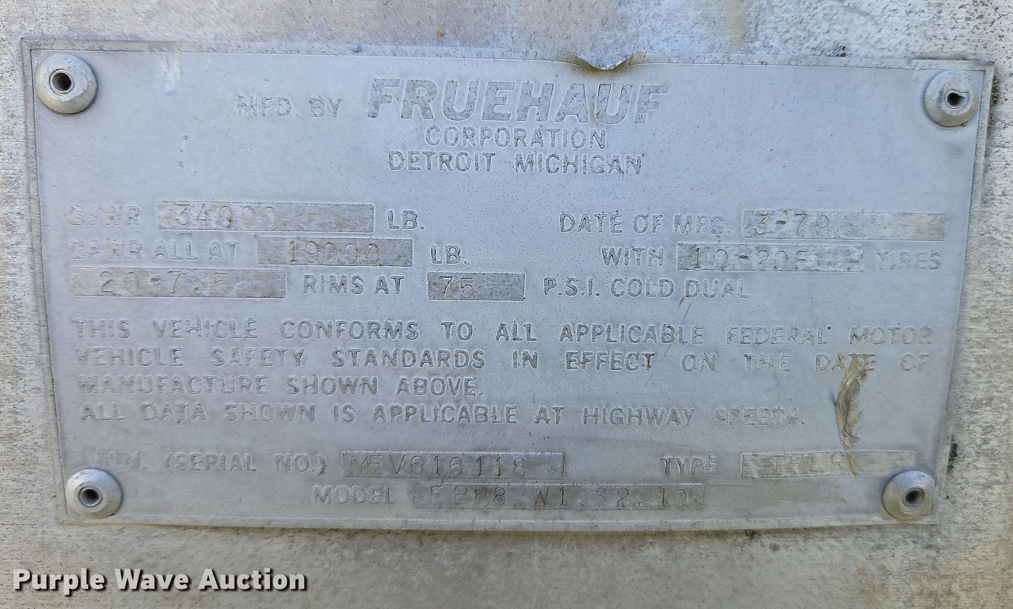 1979 Fruehauf FBB8 W1 32.10 dry van trailer. VIN: MEV616118. Dimensions Overall: 28' L x 96" W. Features Deck type: Wood. Chassis Hitch: Gooseneck, Landing gear: Dual, Suspension: Spring, Brakes: Air, GVWR: 34,000 lbs. Tires Steel wheels, Size: 10.00-20. Notes Non-operational rear door. Missouri title. Harttzler Farms, Inc.. Harrisonville, MO 64701