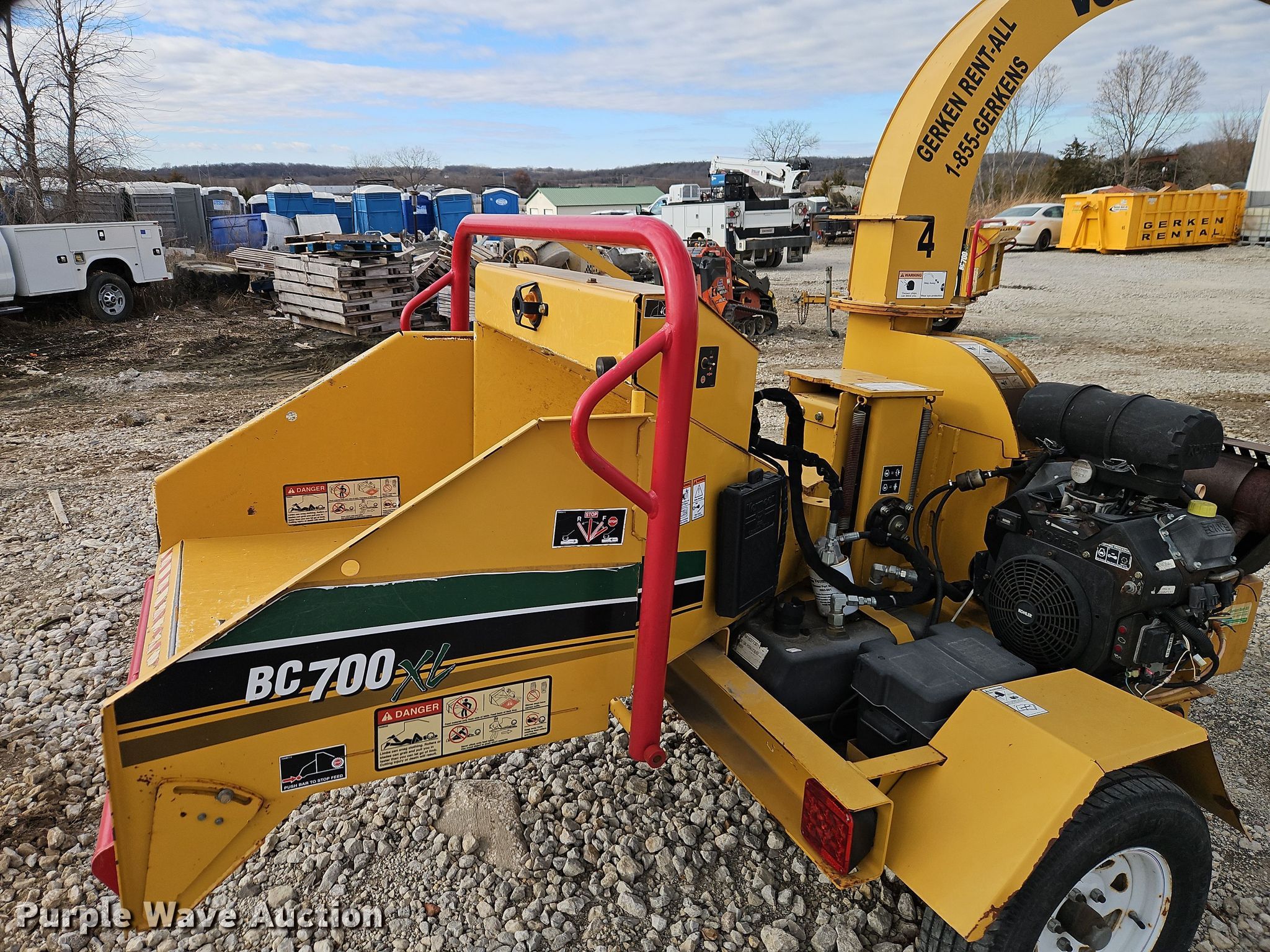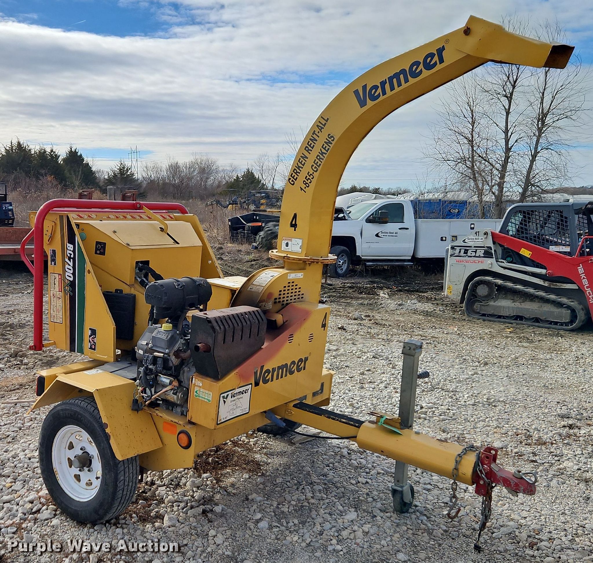 2014 Vermeer BC700 XL wood chipper. Hours: Unknown, VIN: 1VRC101V0E1000103. Engine Kohler, Cylinders: 2, Fuel type: Gas. Features Capacity: 6", Throat opening: 8" x 10". Trailer 8' L x 71" W, Ball hitch size: 2", Suspension: Spring, Axles: Single, Tire size: 175/80R13, GVWR: 2,000 lbs, GAWR: 2,000 lbs. This is worksite support equipment and will not come with a title. Transfer of ownership documentation will be a bill of sale. Gerken Rent-All. Paola, KS 66071