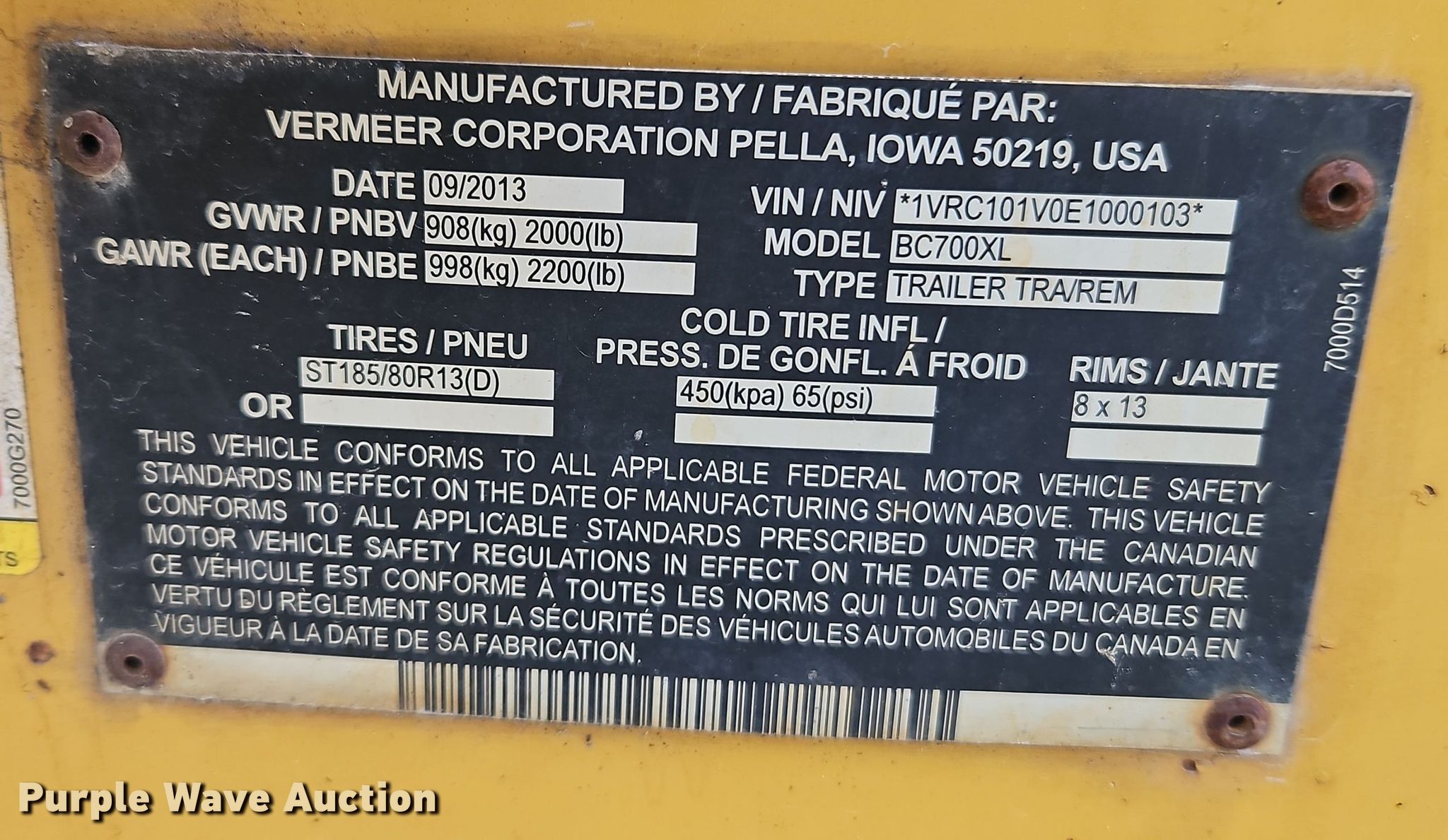 Purple Wave is selling a used Wood Chipper or Stump Grinder in Kansas. This item is a 2014 Vermeer BC700 XL wood chipper with the following: Hours: Unknown, VIN: 1VRC101V0E1000103