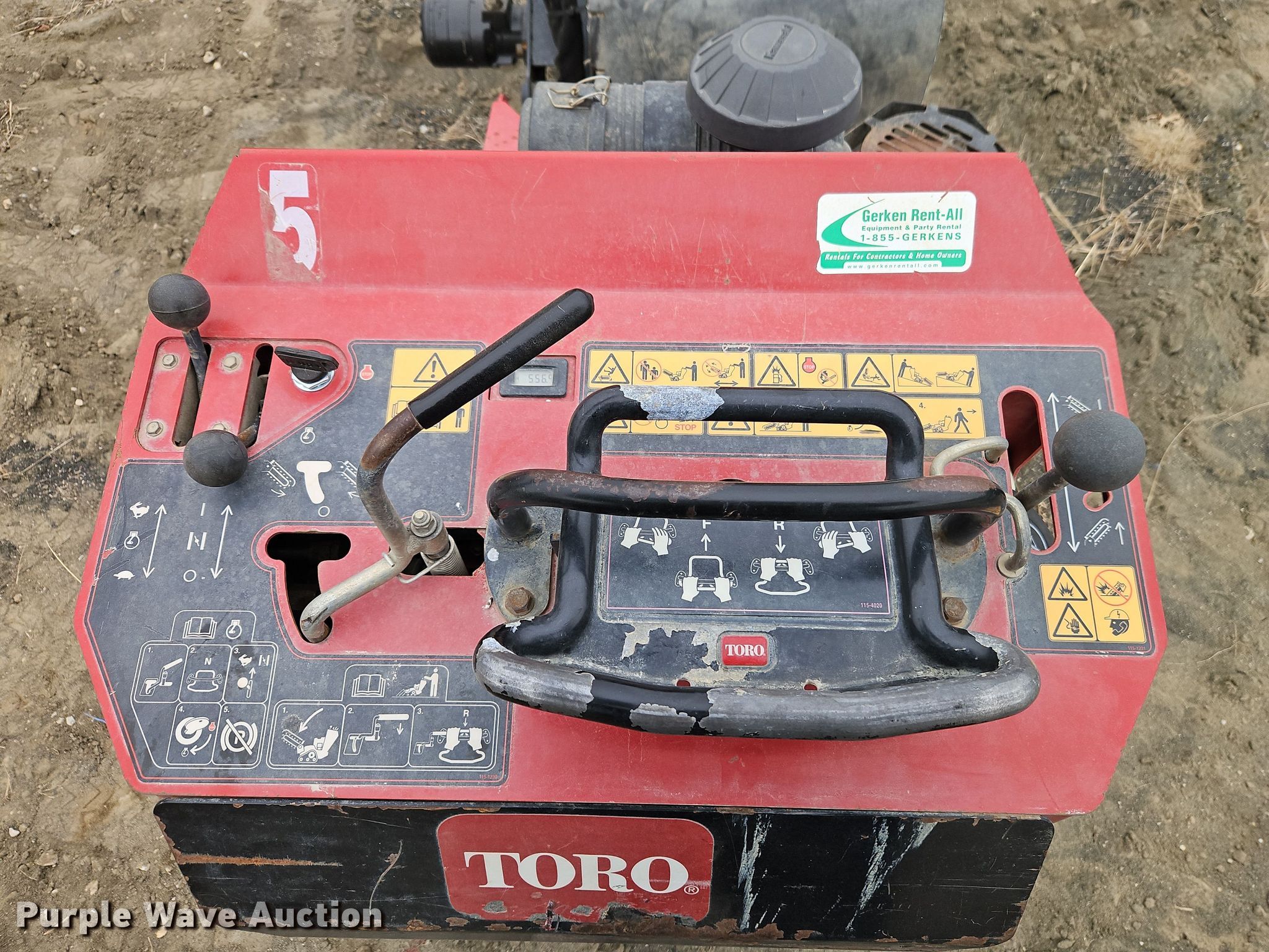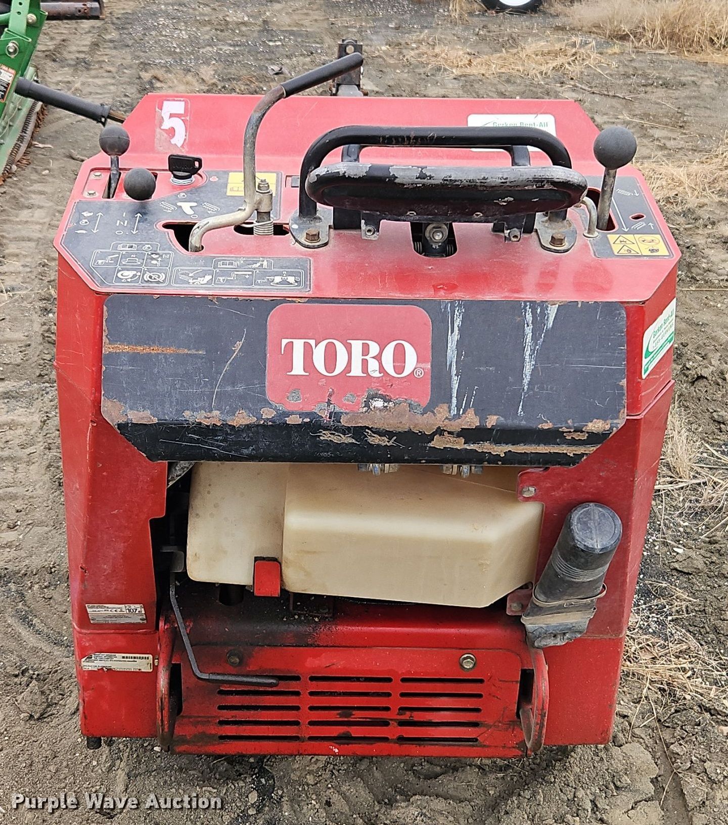 2014 Toro TRX-26 trencher. Hours: 557 on meter, Serial: 314000156. Engine Kawasaki, Cylinders: 2, Fuel type: Gas. Transmission Hydrostatic. Features Trencher Estimated dig depth: 48", Cutting width: 6", Teeth: Rock, Dirt. Tracks Width: 6", Rubber. Gerken Rent-All. Paola, KS 66071