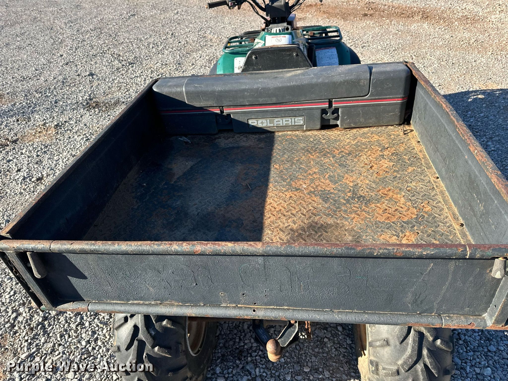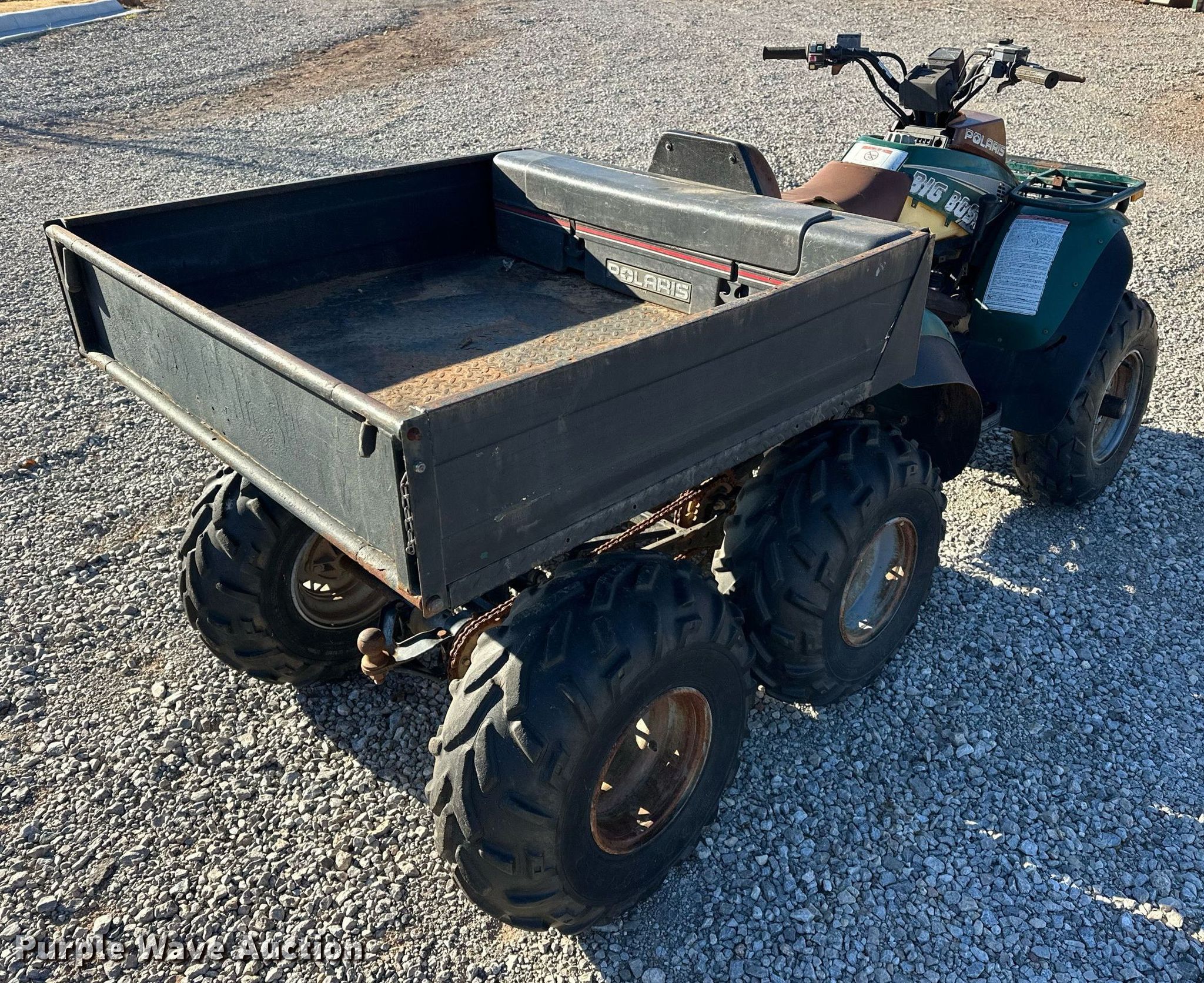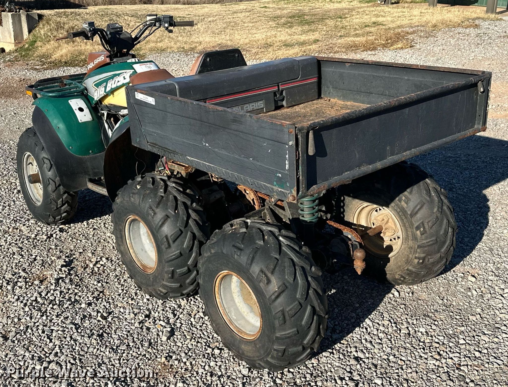 1996 Polaris Big Boss ATV. Miles: 2,574 on odometer, Serial: 2954888. Engine Cylinders: 1, Fuel type: Gas. Transmission Automatic. Chassis Four wheel drive/ All wheel drive. Features Grille guard, Receiver hitch, Dump bed 42" L x 43" W, Dump bed type: Manual. Tires Front: AT25x8-12, Rear: AT25x11-10. Notes Dead battery, Unknown operating condition. Transfer of ownership documentation will be a bill of sale. Norman, OK 73026