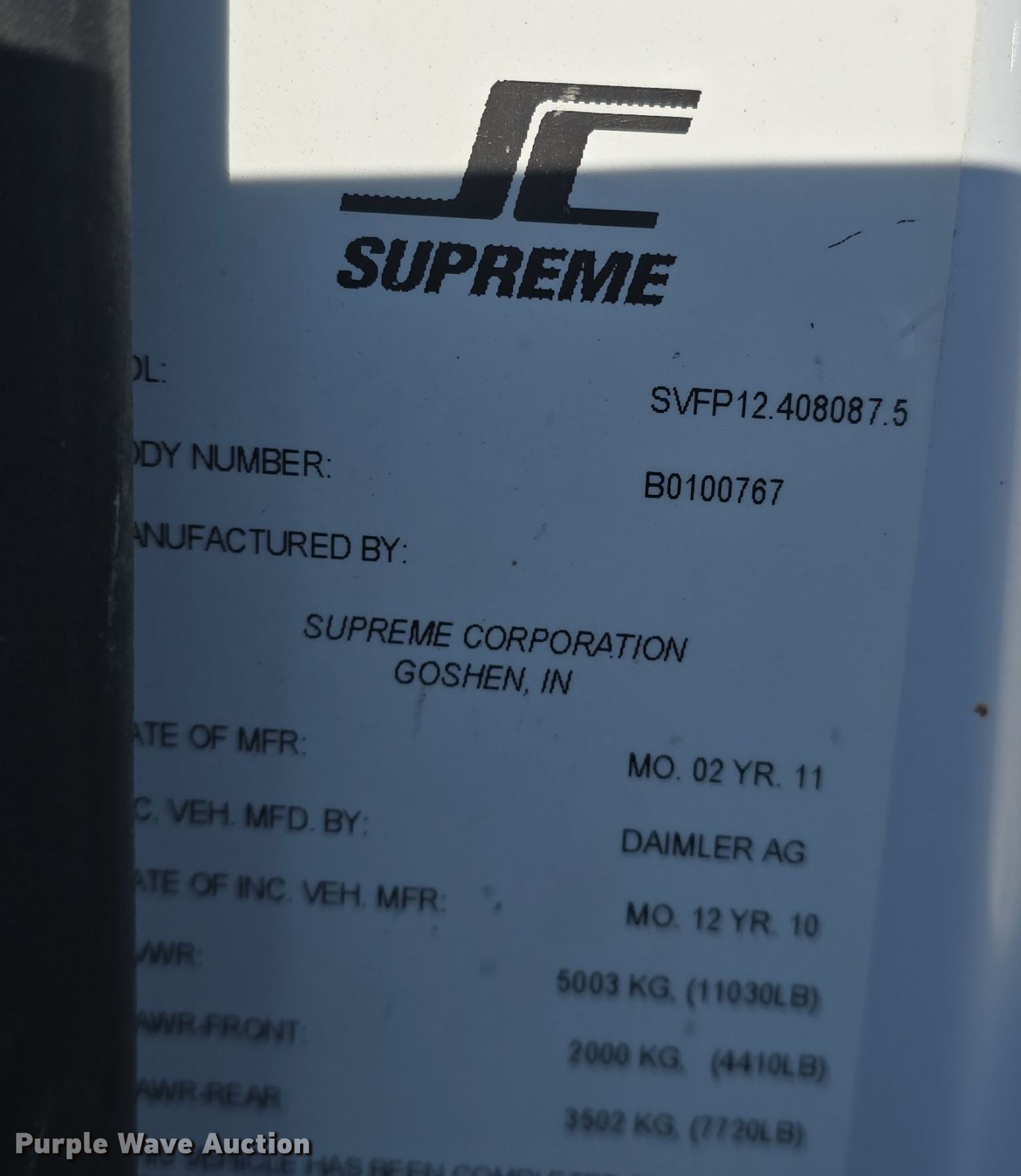 2011 Supreme B0100767 box bed. Serial: SVFP124080875, Overall: 14' L x 7' 2" W x 8' 4" H. Notes No keys, rear doors locked. Junction City, KS 66441