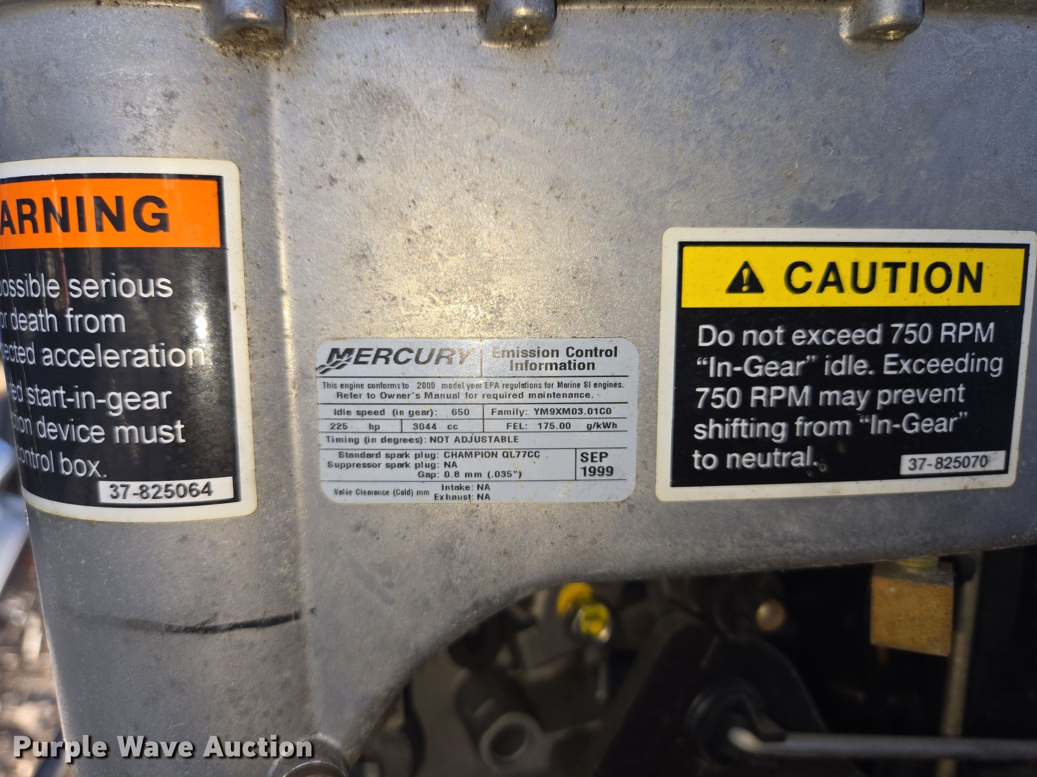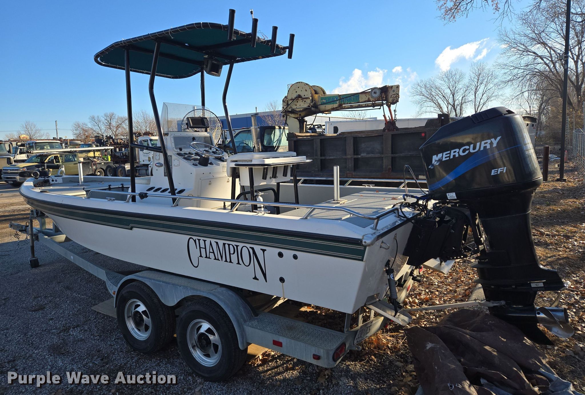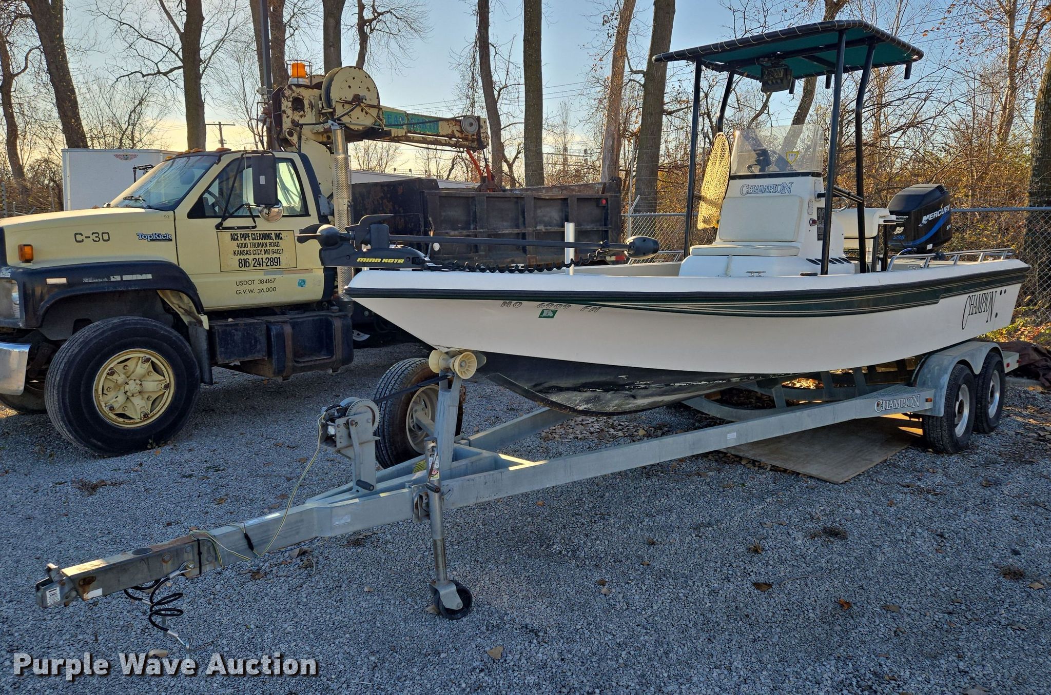 2000 Champion boat. Hours: Unknown, Length: 22', Hull ID: TSB320781900. Engine Engine type: Outboard, 2000 Mercury EDI, Serial: 0T054857, Cylinders: 3, Fuel type: Gas, HP: 225, Outdrive Propeller: Stainless steel. Operators station Capacity Person: 5, 900 lbs, Depth finder: Lawrance 899CI HD GPS. Features Bimini top, Trolling motor: Minn Kota Power Drive V2. Trailer 2000 Dri-Doc, VIN: 4U8BB232XYM006002, Overall length: 25', Overall width: 102", GVWR: 4,400 lbs, Ball hitch size: 2", Axles: Tandem, Tire size: 215/75R14. Features Lawrance LCX-26 GPS. Notes Items in cubbies not included, Glass cracked, Unknown operating condition. Boat - Missouri title. Outboard motor - Missouri title. Trailer - Missouri title. Title distribution may be delayed up to 14 days from verification of funds. Ace Pipe Cleaning, Inc.. Kansas City, MO 64120