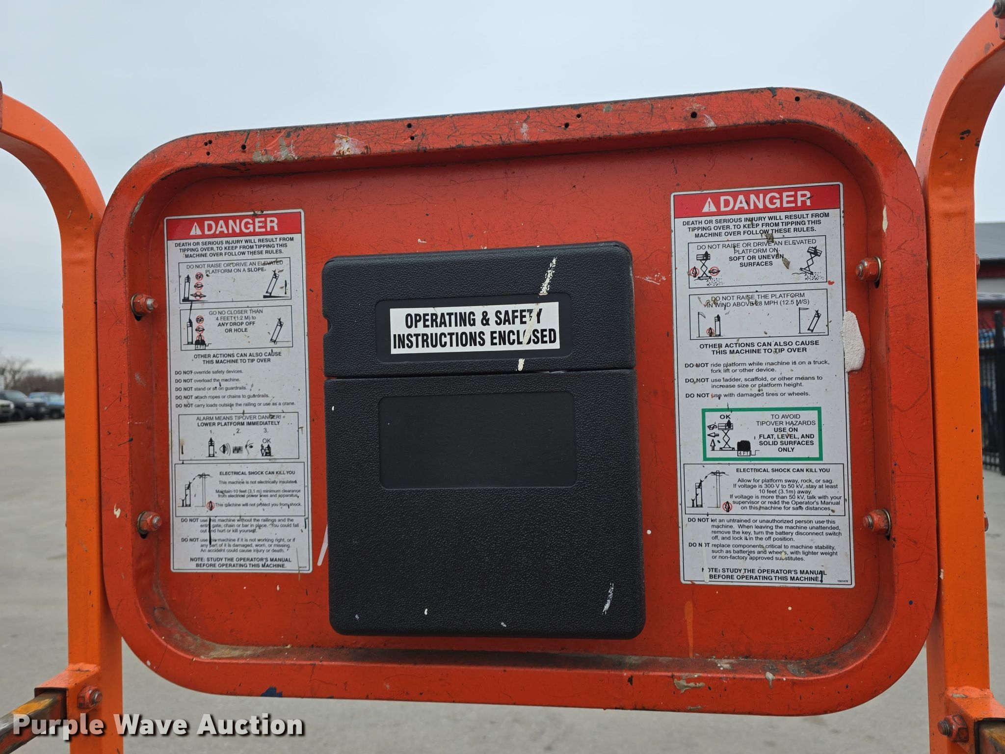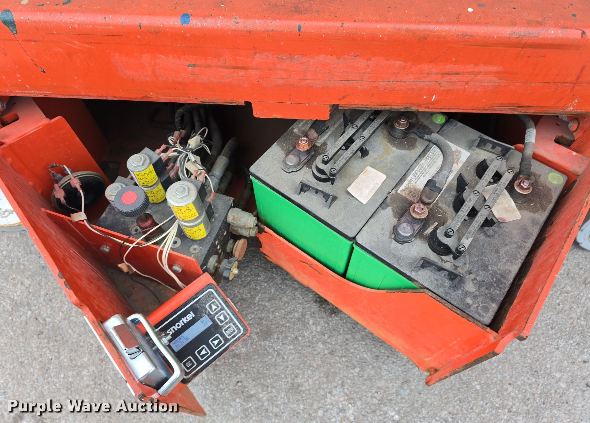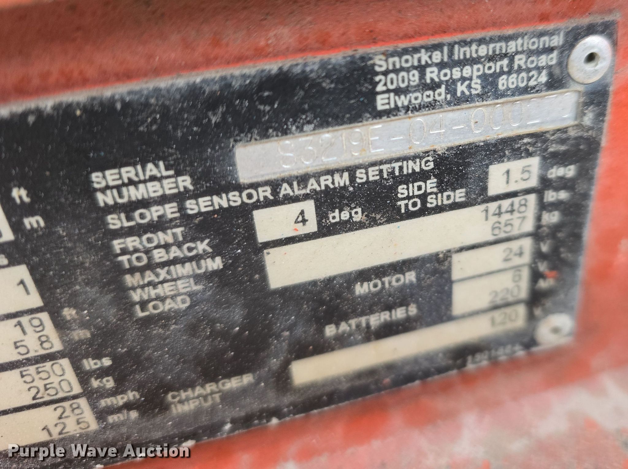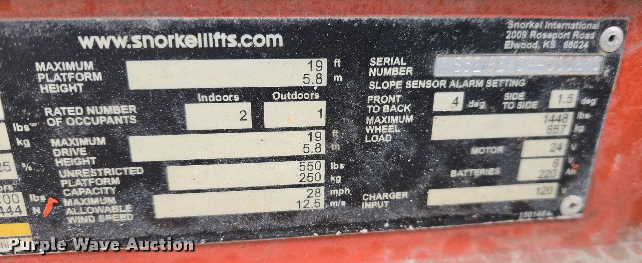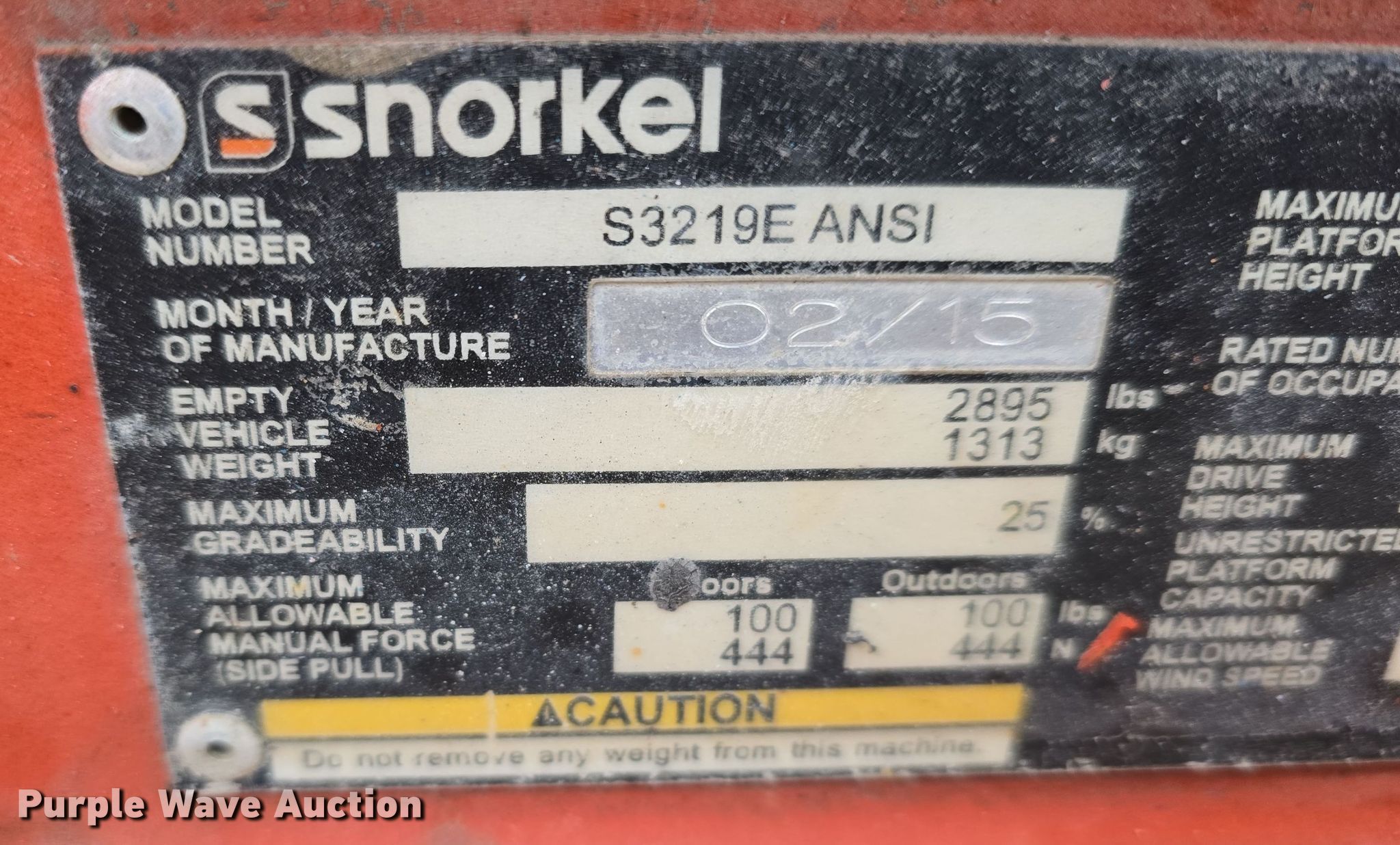 2015 Snorkel S3219E scissor lift. Hours: 512 on meter, Serial: S3219E-04-000270. Electric Motor Volts: 24. Features Maximum lift capacity: 550 lbs, Maximum lift height: 19', Platform: 102" L x 30" W, Controls: Remote Control, Ground, Platform extensions: Manual, Safety alarm. Tires Tire size: 12x4, Solid, Non-marking. Notes Owners manual. Jordan Machinery/ S & N Auto Sales. Waterloo, NE 68069