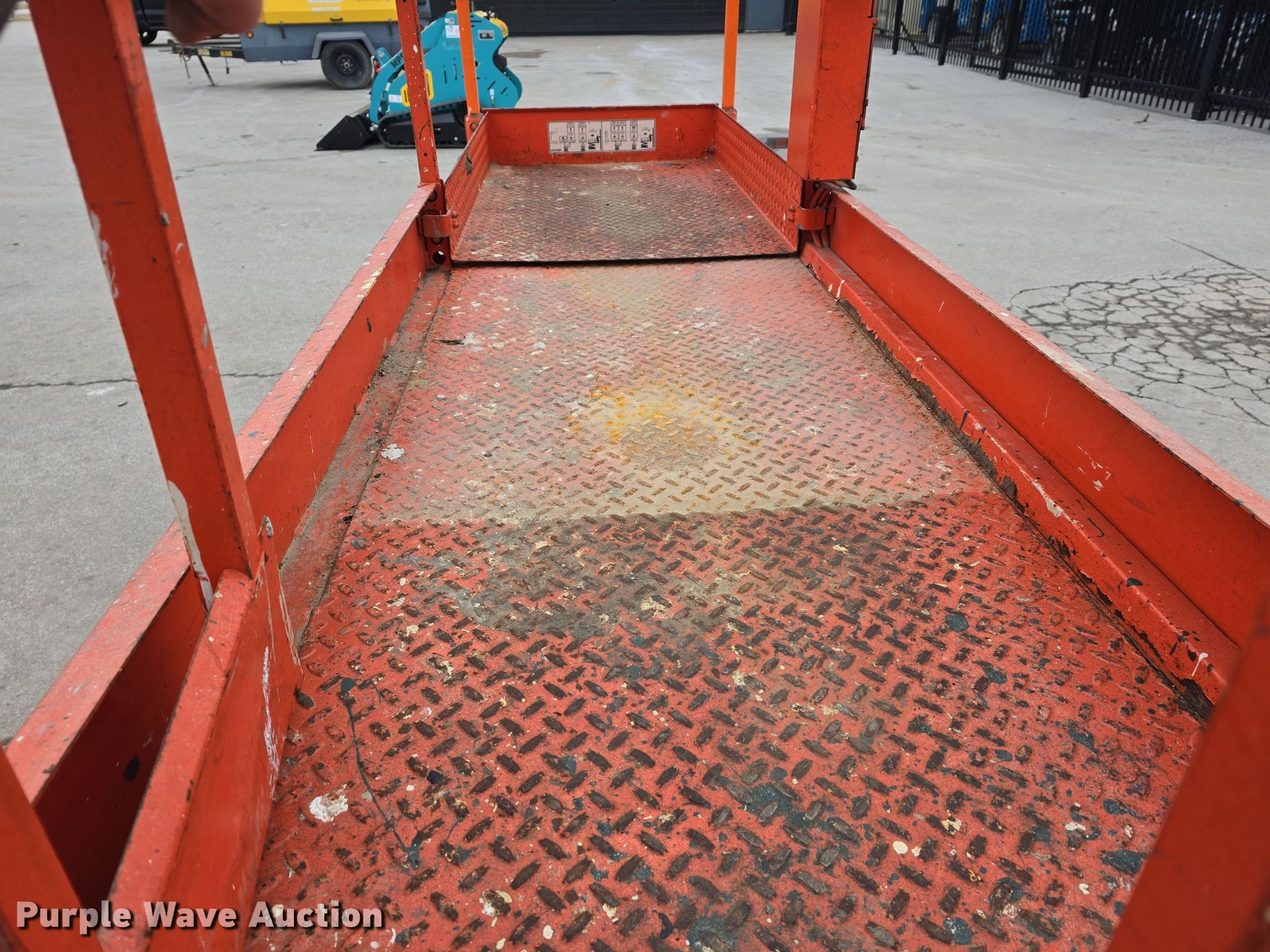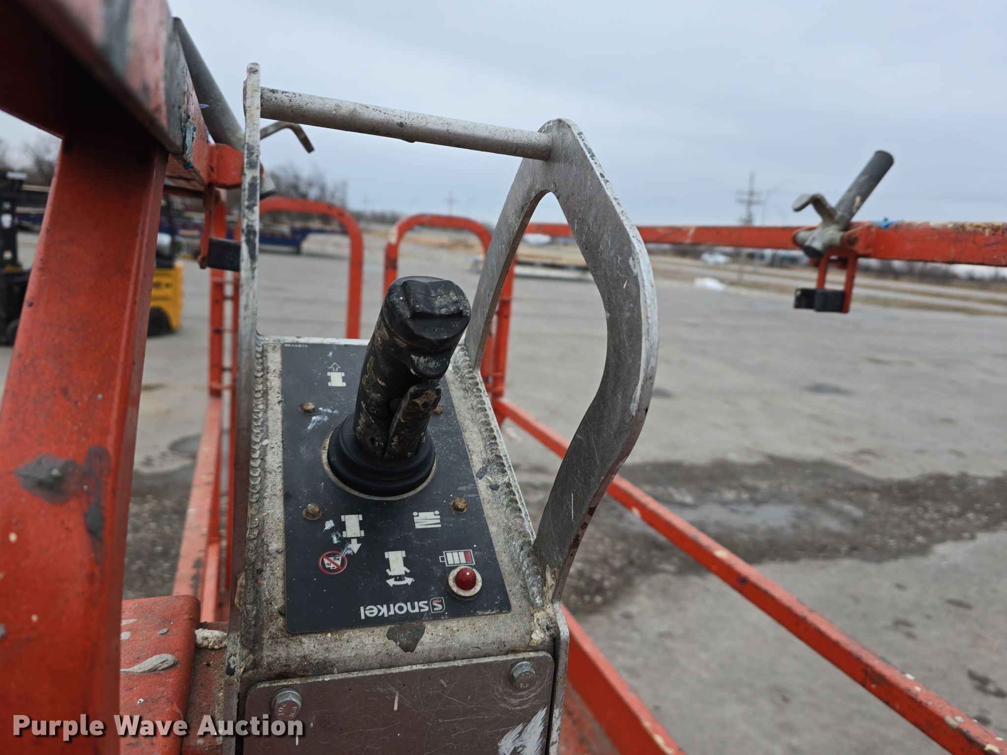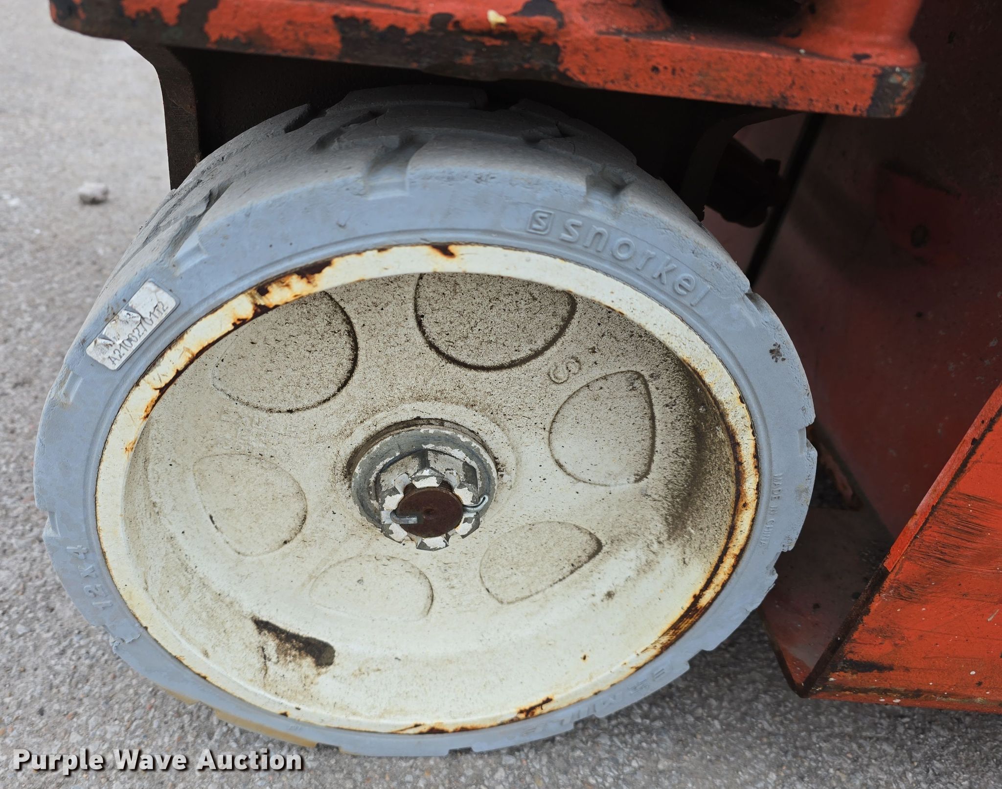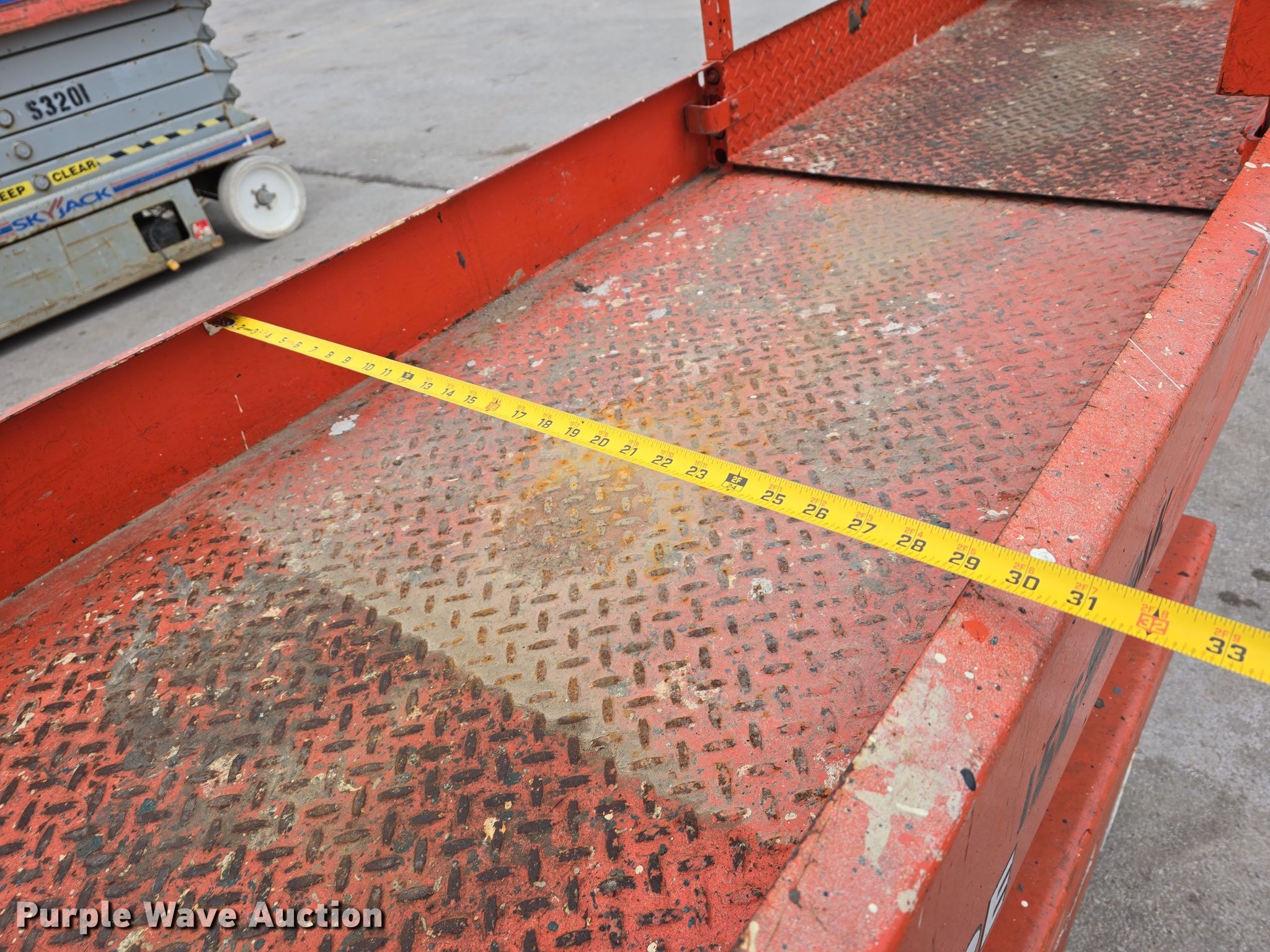 2015 Snorkel S3219E scissor lift. Hours: 512 on meter, Serial: S3219E-04-000270. Electric Motor Volts: 24. Features Maximum lift capacity: 550 lbs, Maximum lift height: 19', Platform: 102" L x 30" W, Controls: Remote Control, Ground, Platform extensions: Manual, Safety alarm. Tires Tire size: 12x4, Solid, Non-marking. Notes Owners manual. Jordan Machinery/ S & N Auto Sales. Waterloo, NE 68069