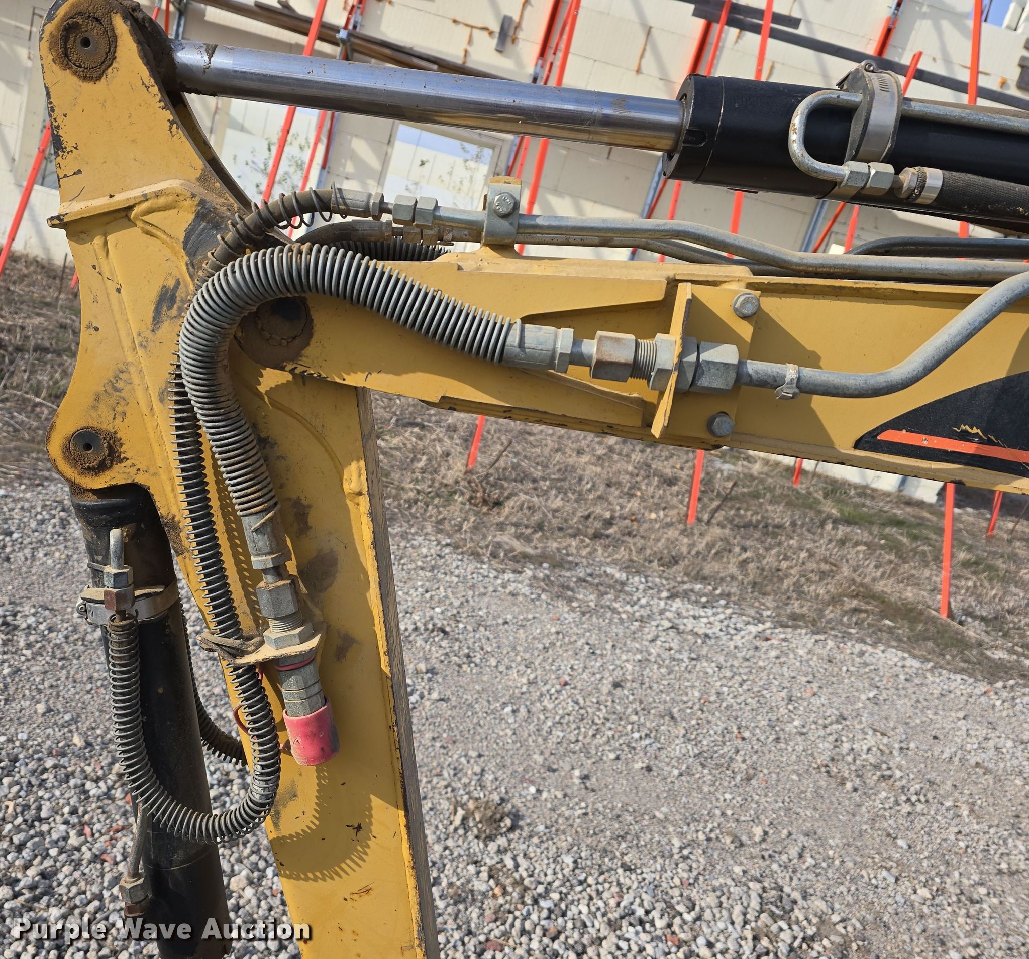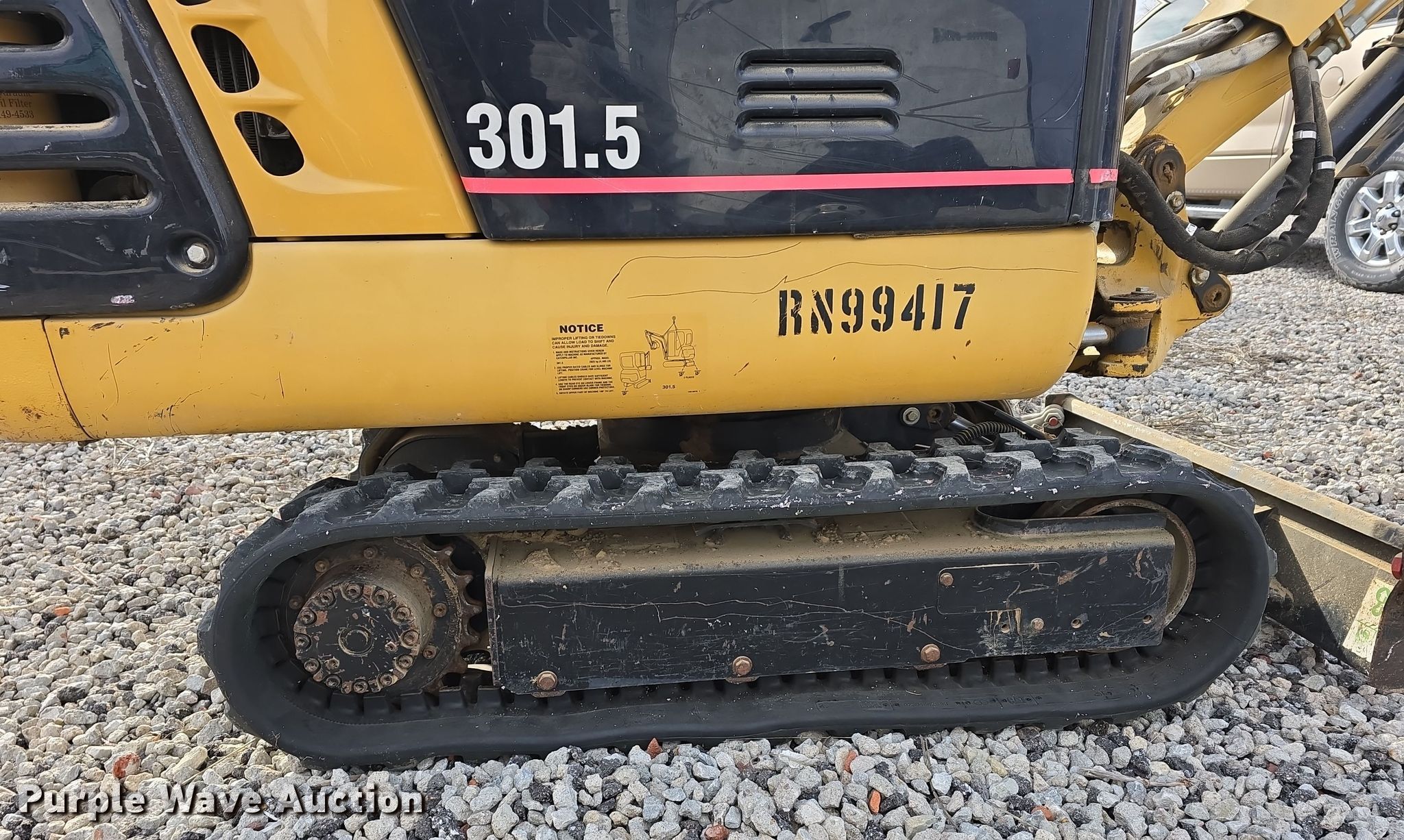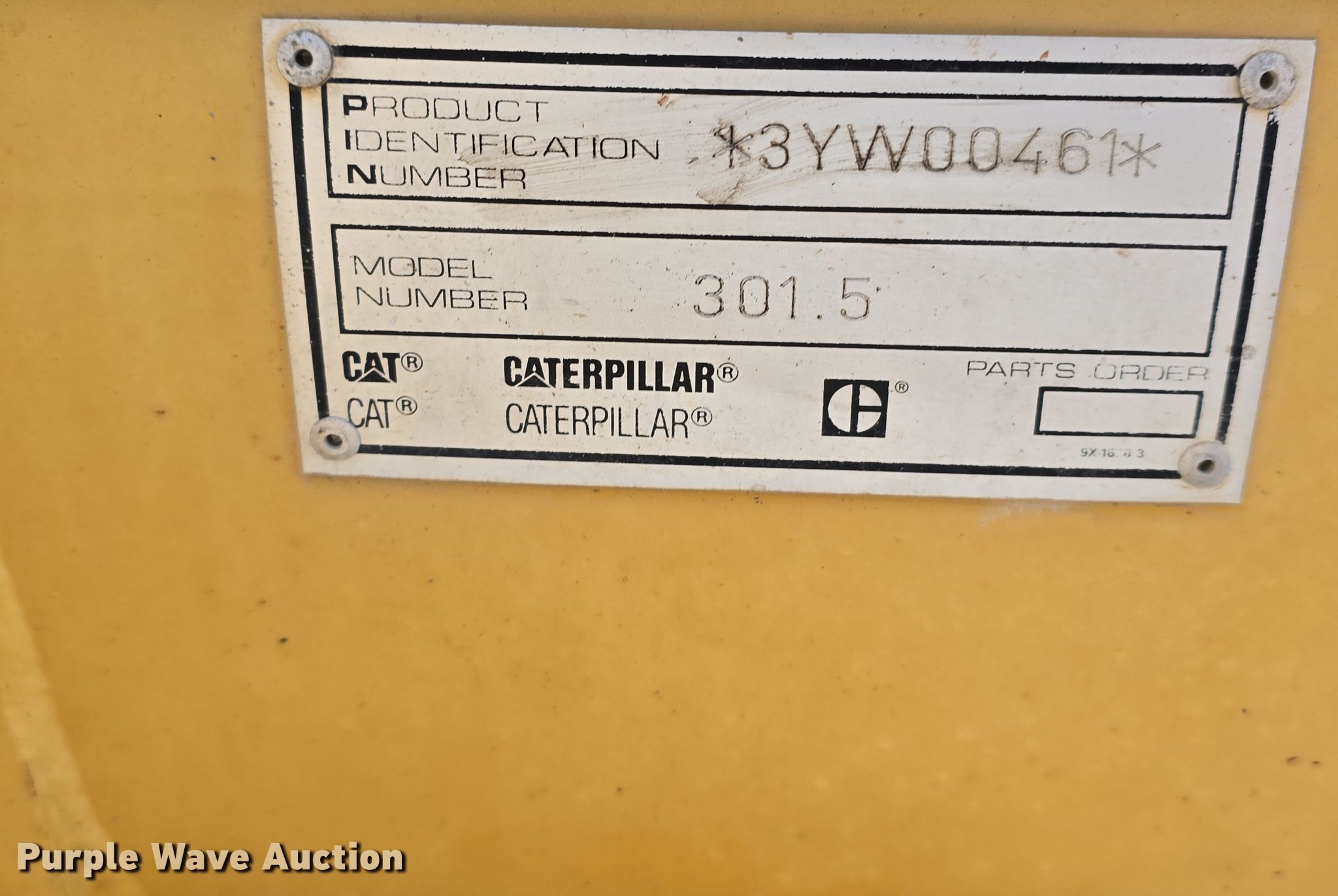 1999 Caterpillar 301.5 mini excavator. Hours: 1,081 on meter, Serial: 3YW00461. Engine Caterpillar 3003, Serial: 5DW00295, Cylinders: 3, Fuel type: Diesel. Transmission Hydrostatic. Operators station Enclosed cab, Heat. Features Auxiliary hydraulics Standard, Counter weights, Backfill blade Width: 38.5", Boom Swing, Stick Stick length: 3', Bucket Caterpillar 147 1014-00, Capacity: 0.018 cu.yd., Width: 9", Teeth: 3. Tracks Width: 9", Rubber. Notes Glass cracked. CRS Concrete. Denton, NE 68339