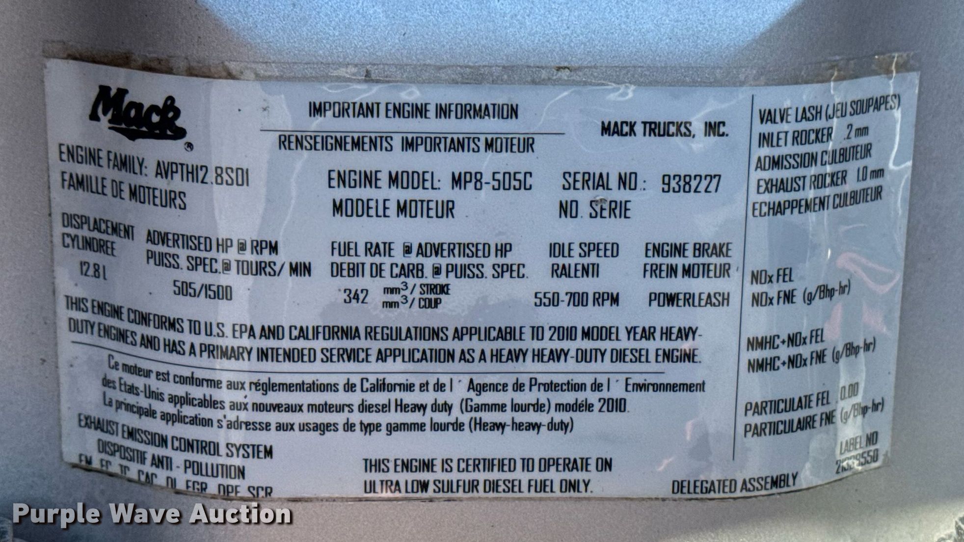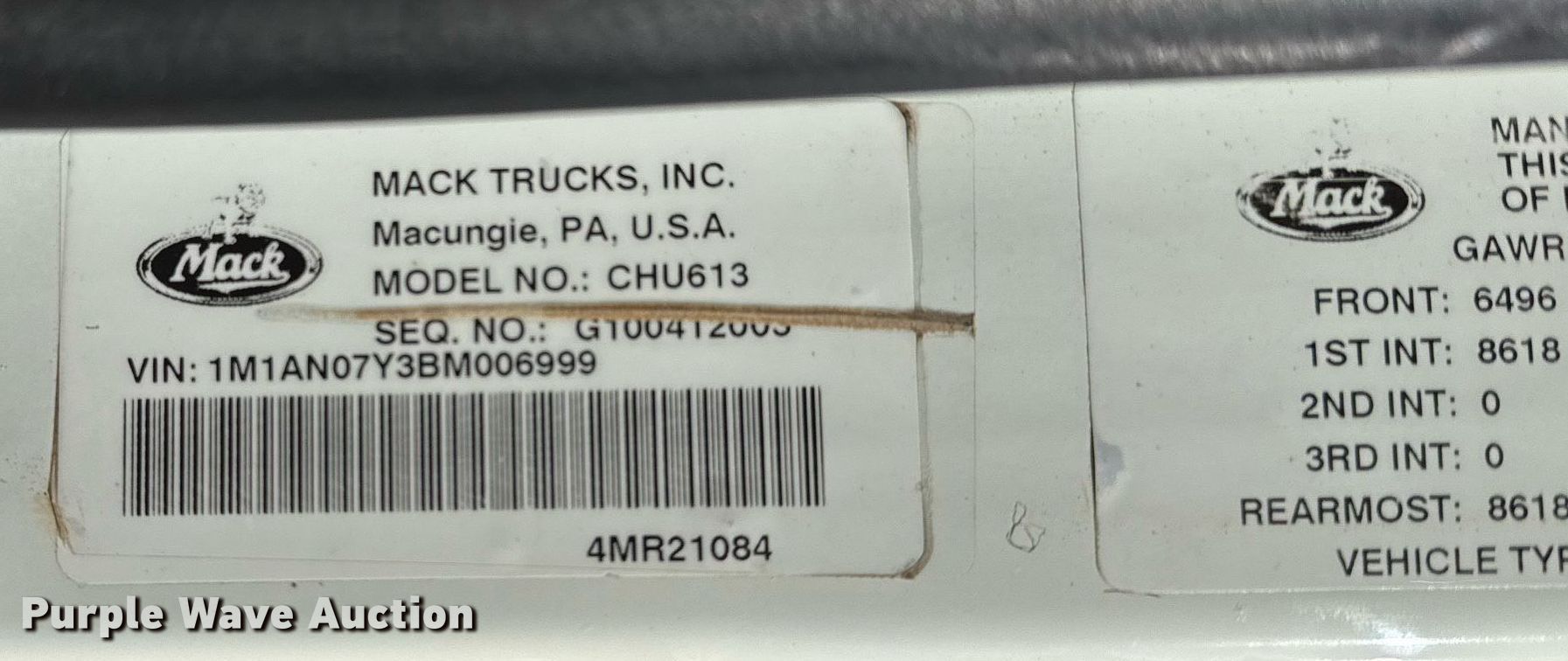 2011 Mack CHU613 vacuum truck. Miles: 422,706 on odometer, VIN: 1M1AN07Y3BM006999. Engine Mack MP8, Serial: 938227, Displacement: 12.8L, Cylinders: 6, Fuel type: Diesel, HP: 505. Transmission Eaton Fuller, Manual, Speed: 13. Chassis Axles: Tandem, Differential lock: Inter-axle, Suspension: Spring over walking beam, Brakes: Air, PTO, GVWR: 52,320 lbs. Interior AC, Heat, Heated mirrors, Power windows, Power locks, Cruise control. Features Tank bed 2011 Troxel Trailer Mfg Co, Capacity: 3,360 gallons, Top hatches: 2, Rear outlet: 6", Vacuum pump NVE 607 Challenger. Tires Size: 11R24.5. Notes Dash warning indicator: Check engine, Fault code, Windshield chipped or cracked. Oklahoma title. Title distribution may be delayed up to 14 days from verification of funds. Collinsville, OK 74021