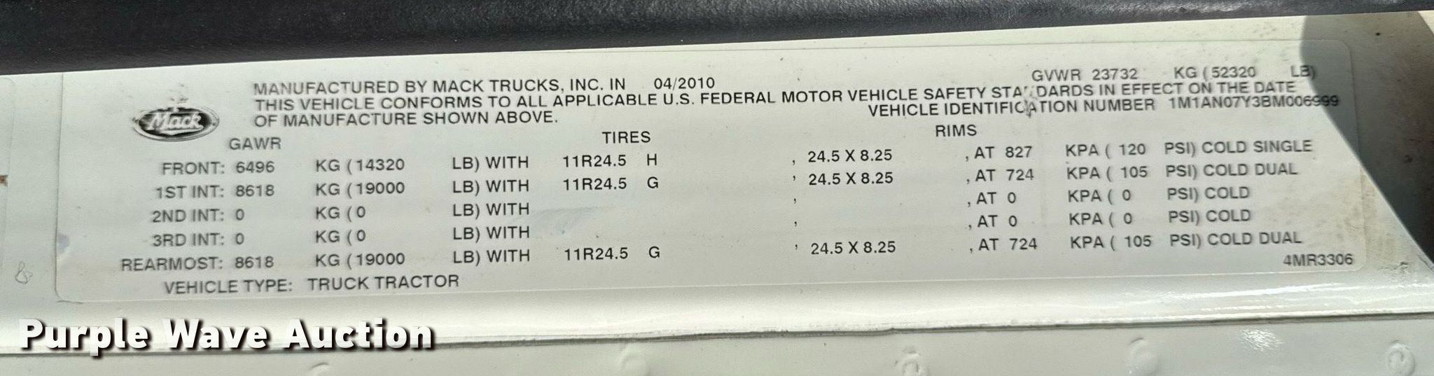 Purple Wave is selling a used Vacuum Truck in Oklahoma. This item is a 2011 Mack CHU613 vacuum truck with the following: Miles: 422,706 on odometer, VIN: 1M1AN07Y3BM006999