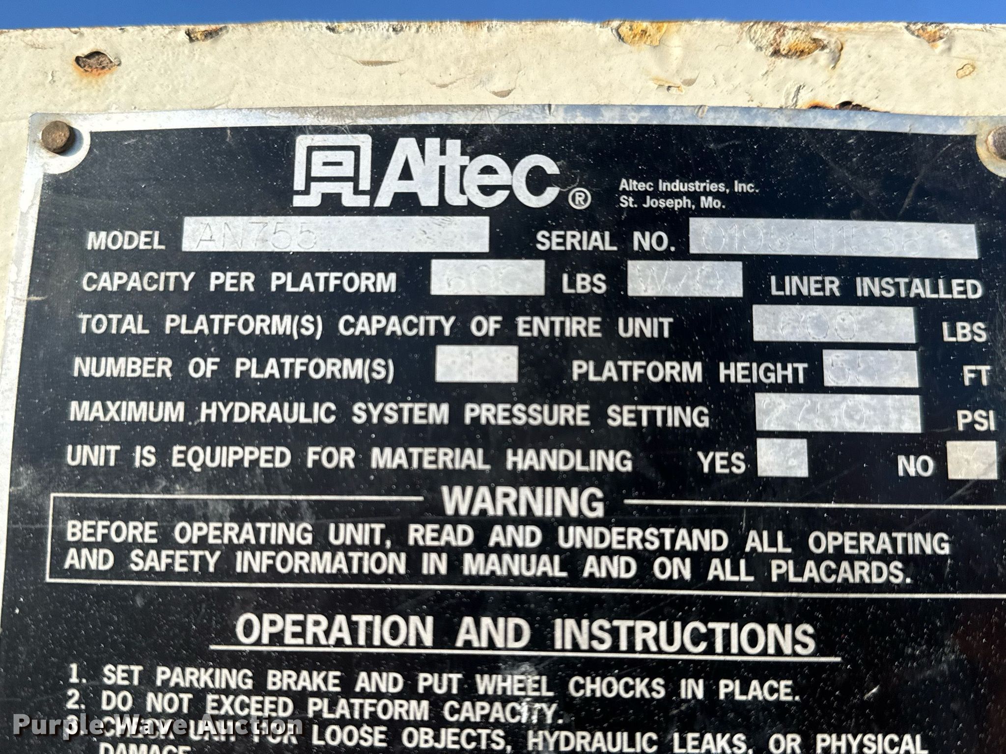 1995 Ford F800 bucket truck. Miles: 108,755 on odometer, Hours: 6,741 on meter, VIN: 1FDXF80C5SVA44051. Engine Cummins B5.9-210, Displacement: 5.9L, Cylinders: 6, Fuel type: Diesel, HP: 210. Transmission Automatic. Chassis Axles: Single, Suspension: Spring, Brakes: Air, PTO, GVWR: 33,000 lbs. Interior Heat, Brake controller. Features Bed Altec, 13' 6" L x 95" W, Boom Altec AN755, Serial: 0195-U1536, Maximum lift capacity: 600 lbs, Maximum lift height: 55', Boom type: Articulating, Insulated, Man basket, Boom controls Ground, Platform/ basket.. Tires Front: 12R22.5, Rear: 11R22.5. Notes Drivers side door handle issues. Kansas title. Title distribution may be delayed up to 14 days from verification of funds. Wichita, KS 67209