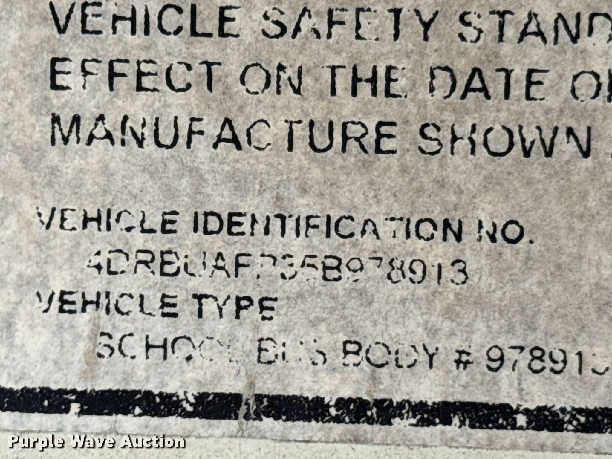 2005 IC CE200 school bus. Miles: 162,744 on odometer, VIN: 4DRBUAFP35B978913. Engine International VT365, Displacement: 6.0L, Cylinders: 6, Fuel type: Diesel. Transmission Automatic. Chassis Axles: Single, Suspension: Spring, Brakes: Hydraulic, GVWR: 29,800 lbs. Interior Heat, Heated mirrors, Cruise control, Auxiliary controls, Passengers: 65. Tires Size: 11R22.5. Notes Possible engine issues. Oklahoma title. Title distribution may be delayed up to 30 days from verification of funds. Pryor Public Schools. Pryor, OK 74361