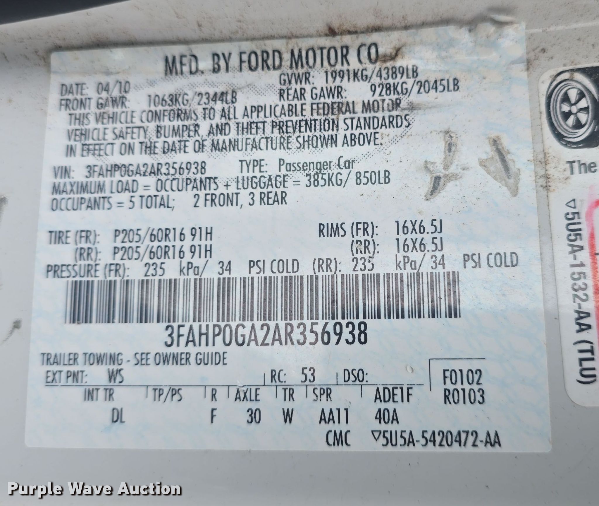 - VIN: 3FAHP0GA2AR356938