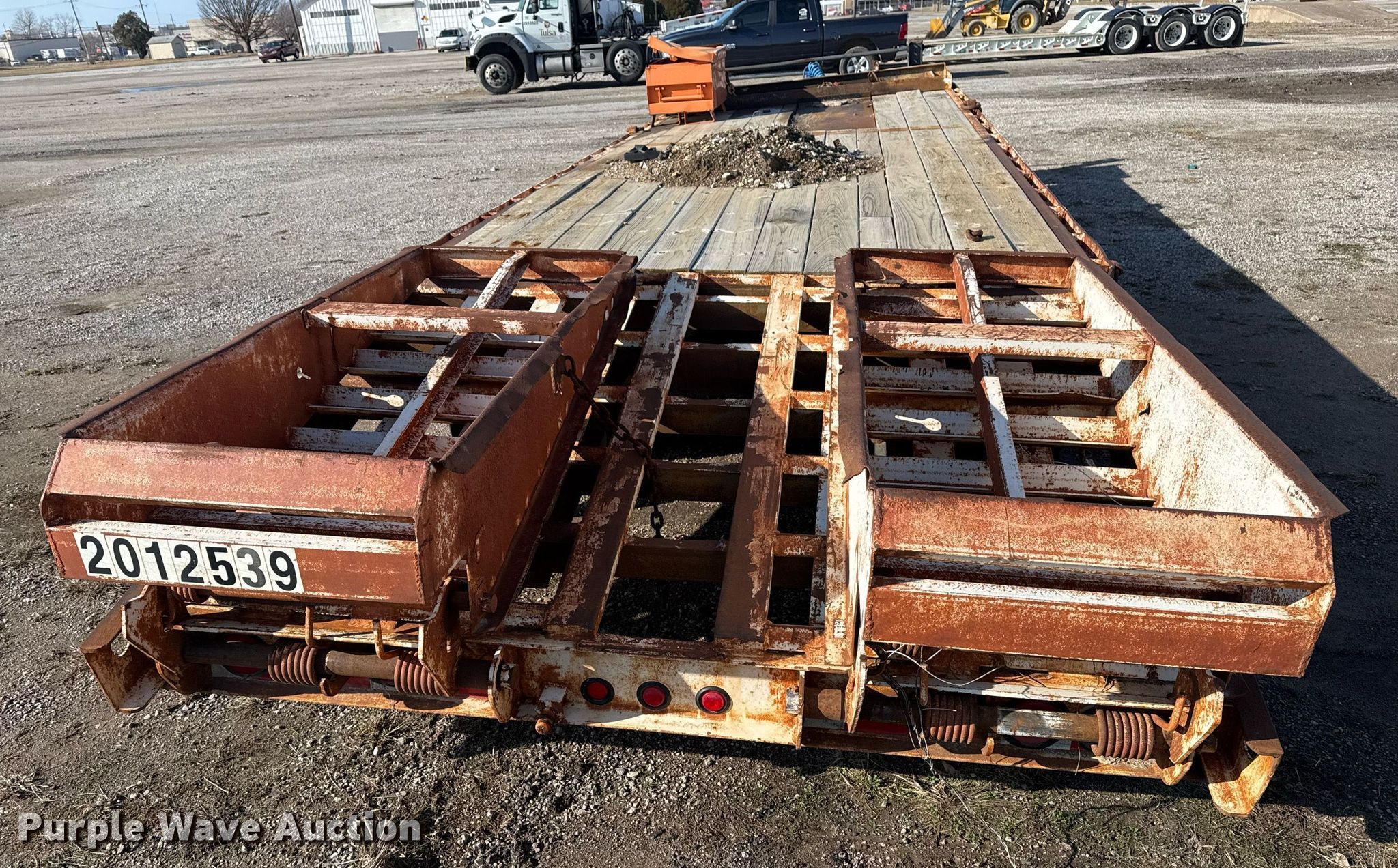 2012 Belshe BDT25 equipment trailer. VIN: 16JF02028C1046350. Dimensions Overall: 31' L x 96" W, Deck: 20' L x 91" W, Tail length: 6', Ramps: Manual Length: 5' 6". Features Deck type: Steel, Wood. Chassis Hitch: Pintle, Landing gear: Dual, Suspension: Spring, Brakes: Air, Axles: Tandem, GVWR: 28,500 lbs, GAWR: 12,000 lbs. Tires Steel wheels, Size: 215/75R17.5. Notes Ramps damaged, bent, Landing gear damaged, Flat tire, needs replaced. Oklahoma title. Seller is a government entity who will be assigning and distributing the title. Please contact the seller for distribution questions. Title distribution may be delayed up to 30 days from verification of funds. City of Tulsa. Tulsa, OK 74146