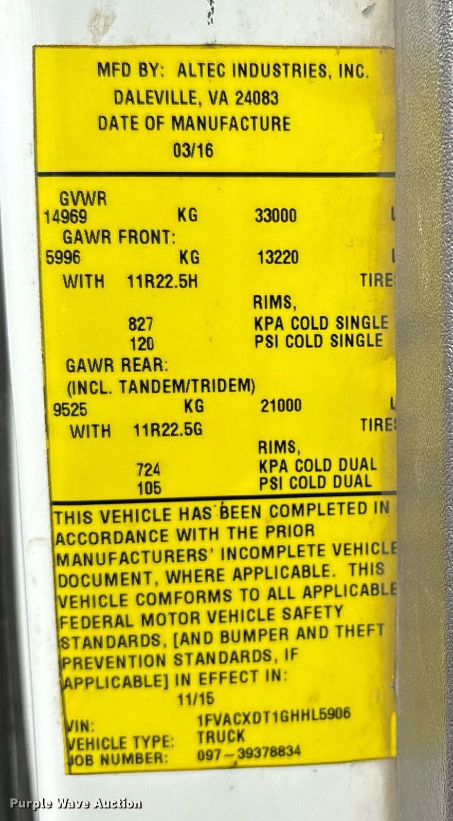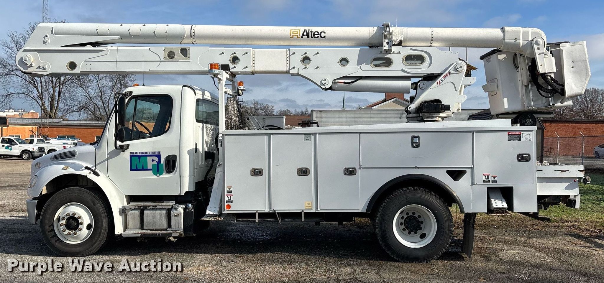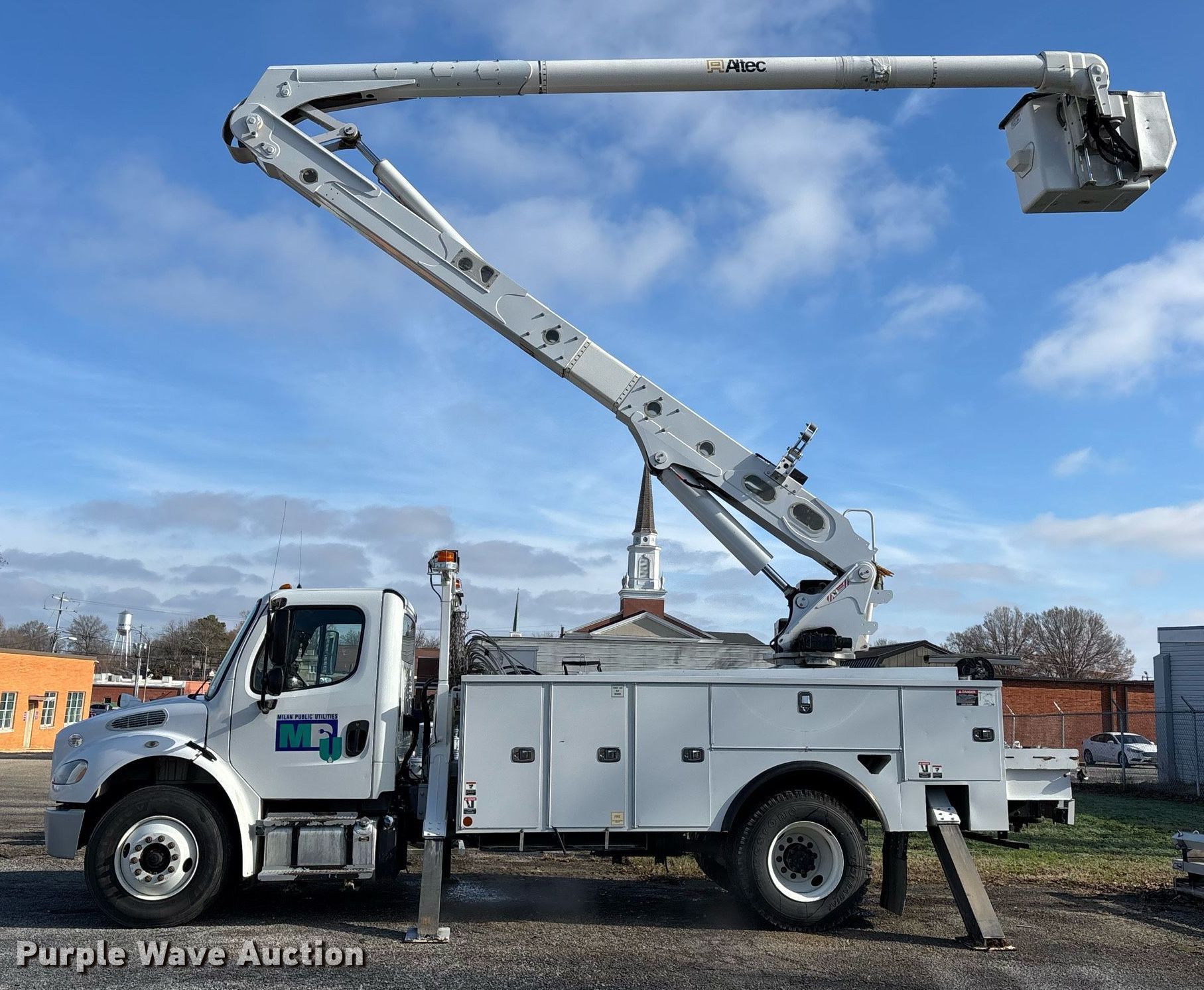 2016 Freightliner M2106 bucket truck. Miles: 74,909 on odometer, Hours: 9,027 on meter, VIN: 1FVACXDT1GHHL5906, Unit #: 21. Engine Cummins ISB, Serial: 73925984, Displacement: 6.7L, Cylinders: 6, Fuel type: Diesel, HP: 250. Transmission Allison 3800 RDS, Automatic. Chassis Axles: Single, Suspension: Spring, Brakes: Air, PTO, GVWR: 33,000 lbs, Wheelbase: 190". Interior AC, Heat, Cruise control, Auxiliary controls, Brake controller. Features Bed Altec, Serial: 97-39378834, 16' L x 94" W, Boom Altec AA55E, Serial: 0216FH2884, Mast height: 56', Maximum lift capacity: 600 lbs, Boom type: Articulating, Insulated, Man basket, Boom controls Ground, Platform/ basket.. Tires Size: 11R22.5. Notes Contents not included. Tennessee title. Title distribution may be delayed up to 14 days from verification of funds. Milan Public Utilities. Milan, TN 38358