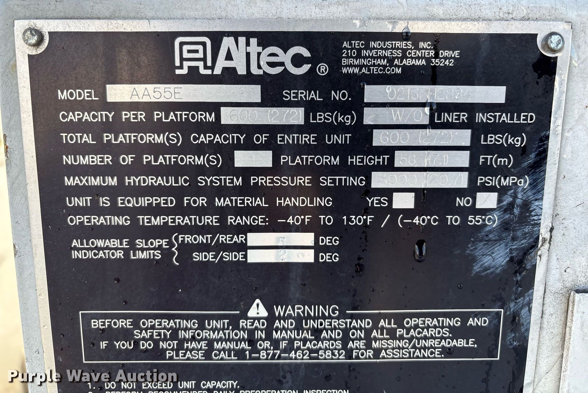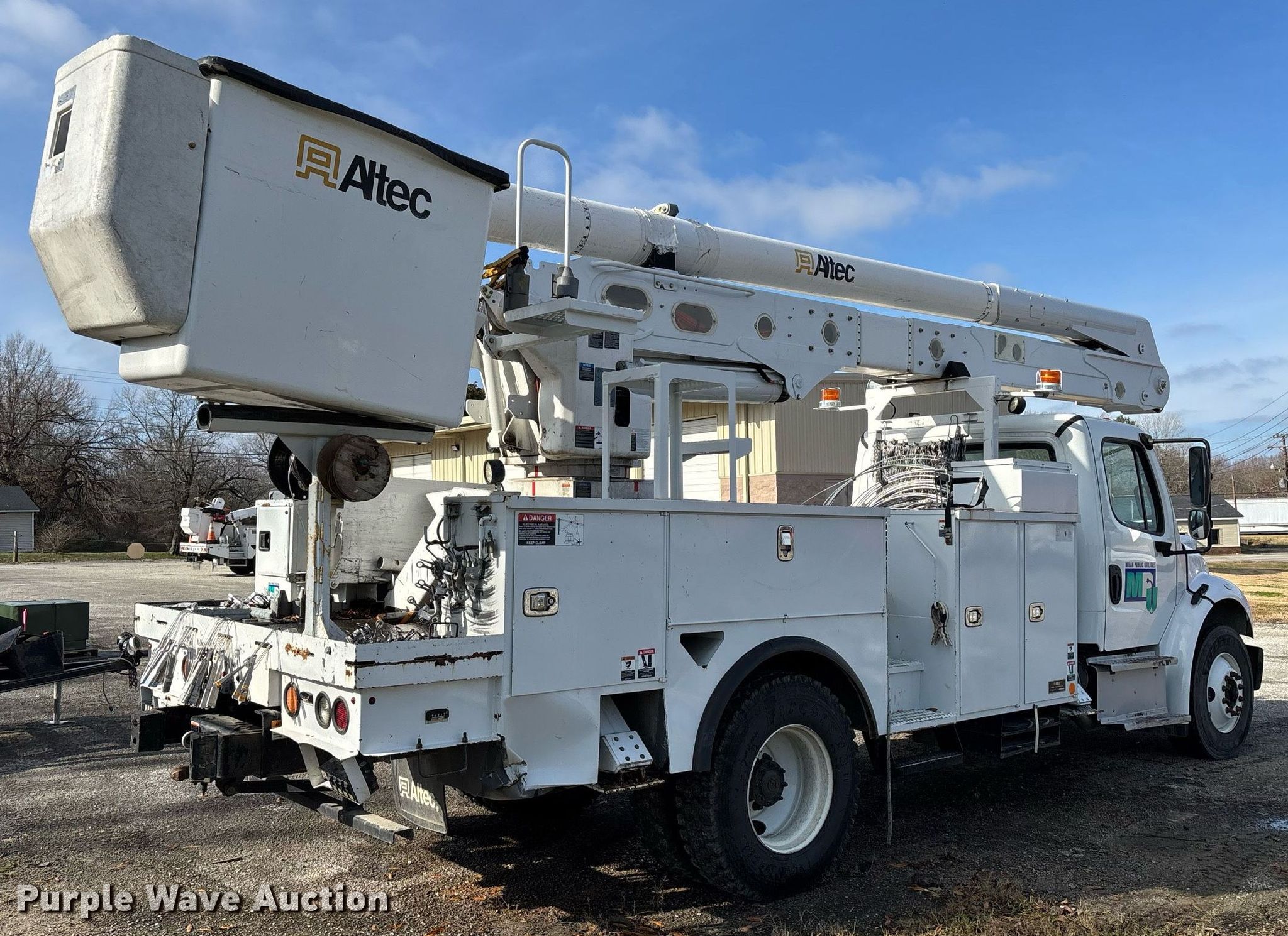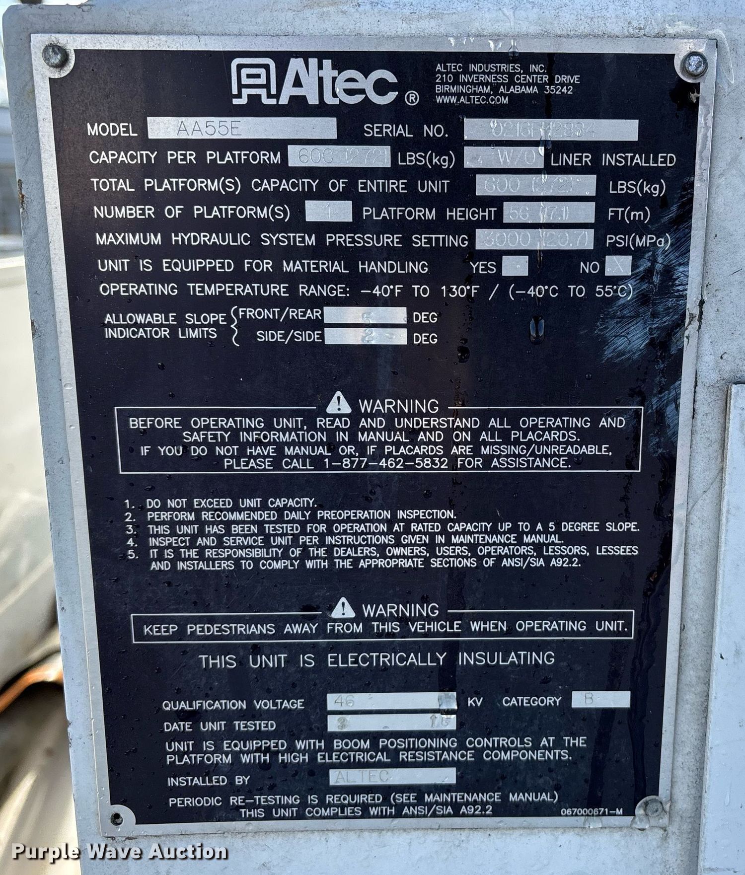 2016 Freightliner M2106 bucket truck. Miles: 74,909 on odometer, Hours: 9,027 on meter, VIN: 1FVACXDT1GHHL5906, Unit #: 21. Engine Cummins ISB, Serial: 73925984, Displacement: 6.7L, Cylinders: 6, Fuel type: Diesel, HP: 250. Transmission Allison 3800 RDS, Automatic. Chassis Axles: Single, Suspension: Spring, Brakes: Air, PTO, GVWR: 33,000 lbs, Wheelbase: 190". Interior AC, Heat, Cruise control, Auxiliary controls, Brake controller. Features Bed Altec, Serial: 97-39378834, 16' L x 94" W, Boom Altec AA55E, Serial: 0216FH2884, Mast height: 56', Maximum lift capacity: 600 lbs, Boom type: Articulating, Insulated, Man basket, Boom controls Ground, Platform/ basket.. Tires Size: 11R22.5. Notes Contents not included. Tennessee title. Title distribution may be delayed up to 14 days from verification of funds. Milan Public Utilities. Milan, TN 38358