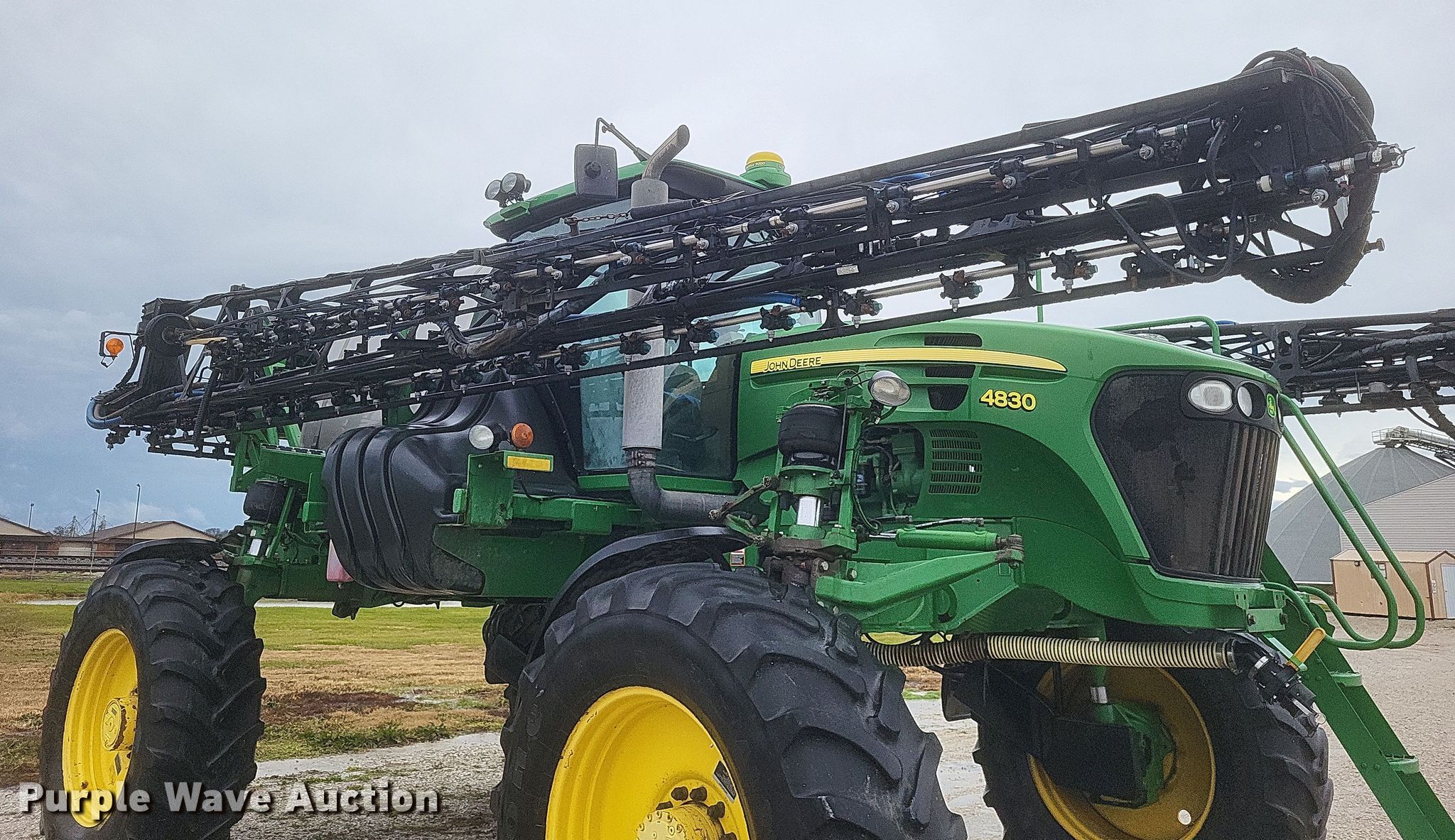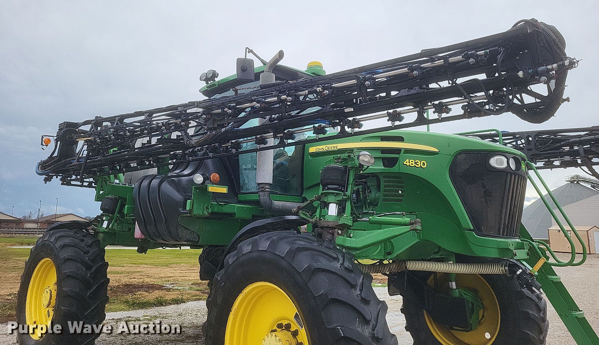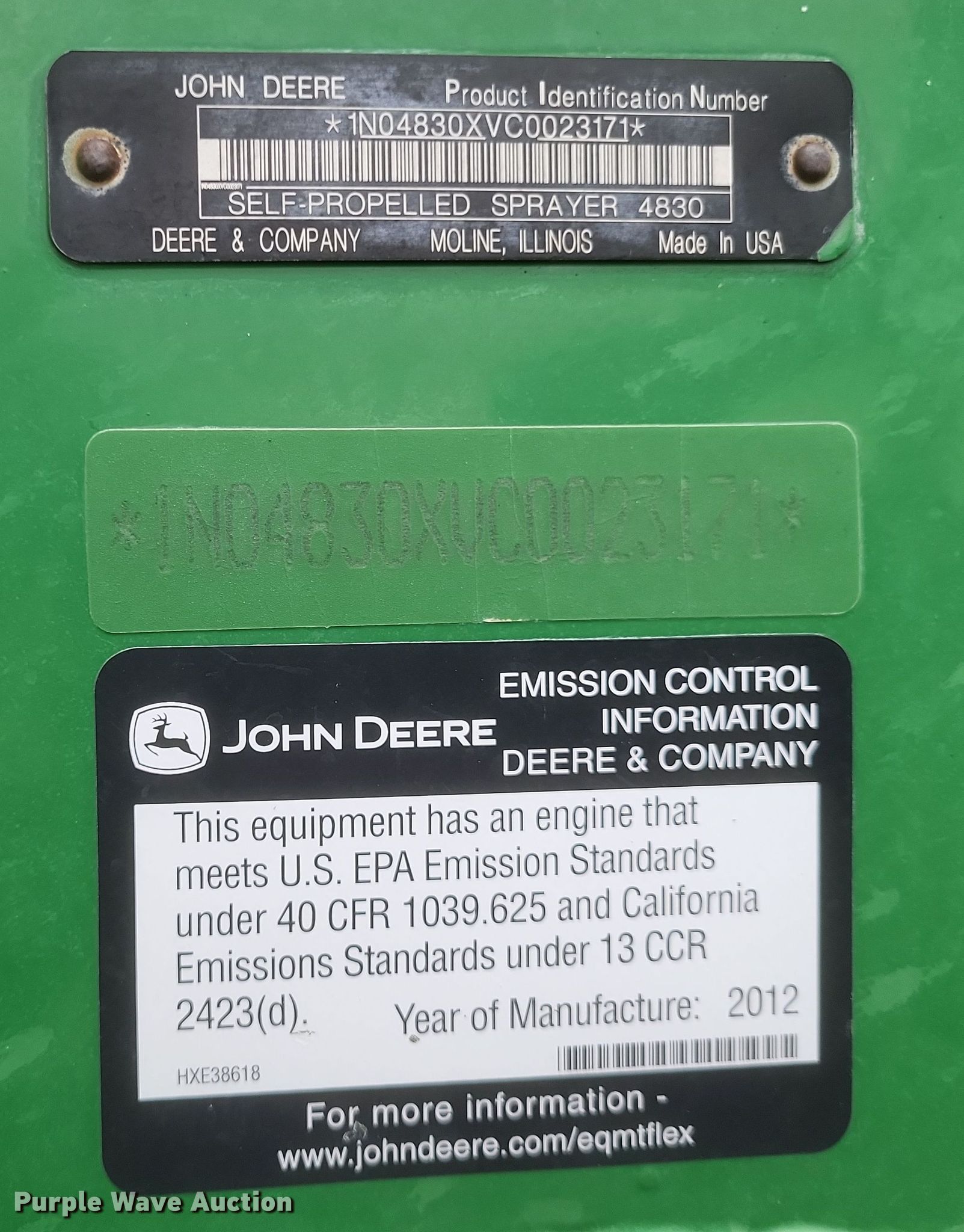 Purple Wave is selling a used Applicator Self Propelled in Indiana. This item is a 2012 John Deere 4830 sprayer with the following: Engine hours: 4,733 on meter, Spray hours: 2,362 on meter, VIN: 1N04830XVC0023171
