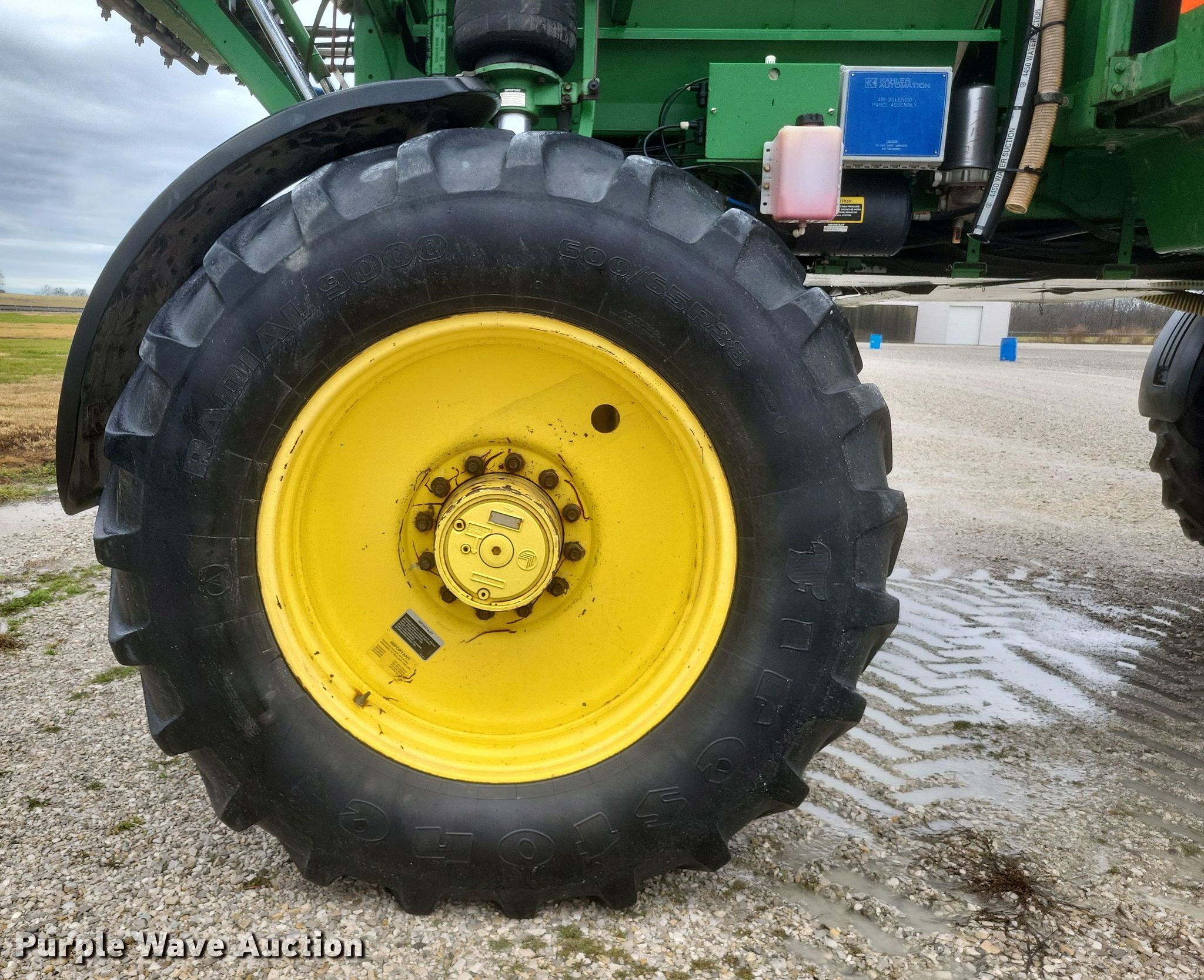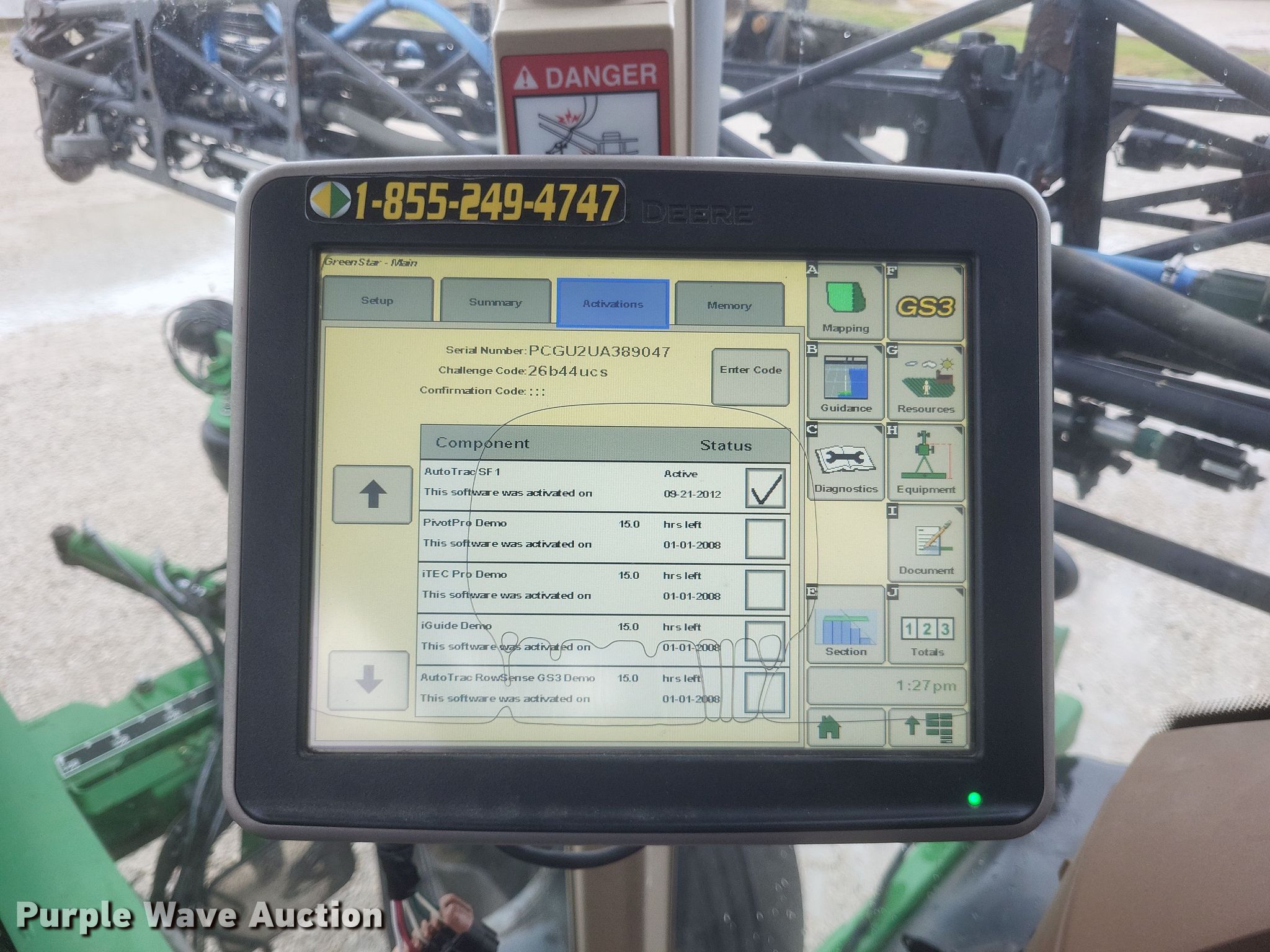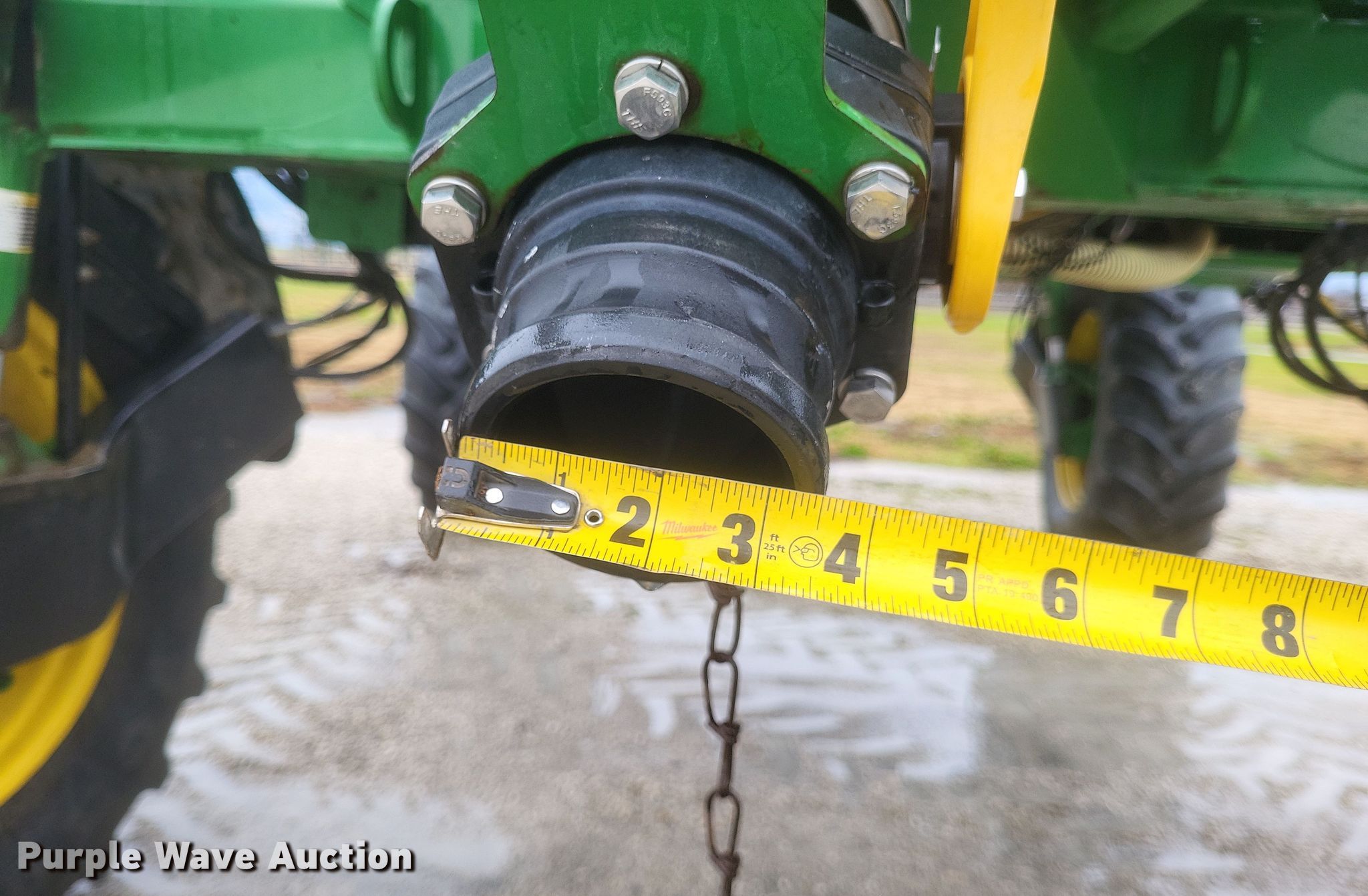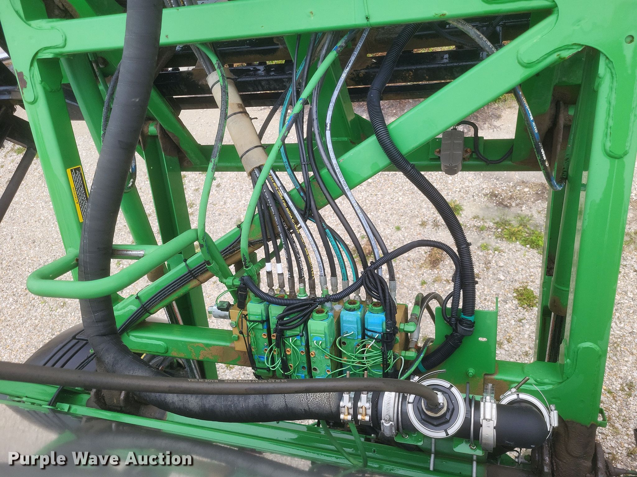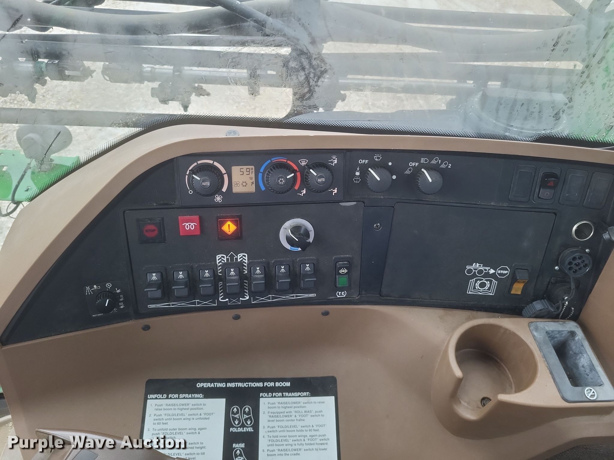 2012 John Deere 4830 sprayer. Engine hours: 4,733 on meter, Spray hours: 2,362 on meter, VIN: 1N04830XVC0023171. Engine John Deere 2240, Displacement: 414 C.I.D., Cylinders: 6, Fuel type: Diesel. Transmission Hydrostatic. Operators station AC, Heat. Features Hydraulic ladder, Belly shield, Solution tank Type: Stainless Steel, Front fill, Capacity: 1000 gallons, Rinse tank Capacity: 120 gallons, Boom Sections: 5, Boom breakaway, Hydraulic boom fold, Hydraulic height control, Nozzle Spacing: 15", Nozzle bodies: 5-way, Fence row nozzles, Electronics GPS monitor John Deere GreenStar 2630, GPS receiver John Deere Starfire 3000.. Tires Size: 600/65R38, Flotation tires. Notes Additional row crop wheels and tires. Keystone Cooperative. Vincennes, IN 47591