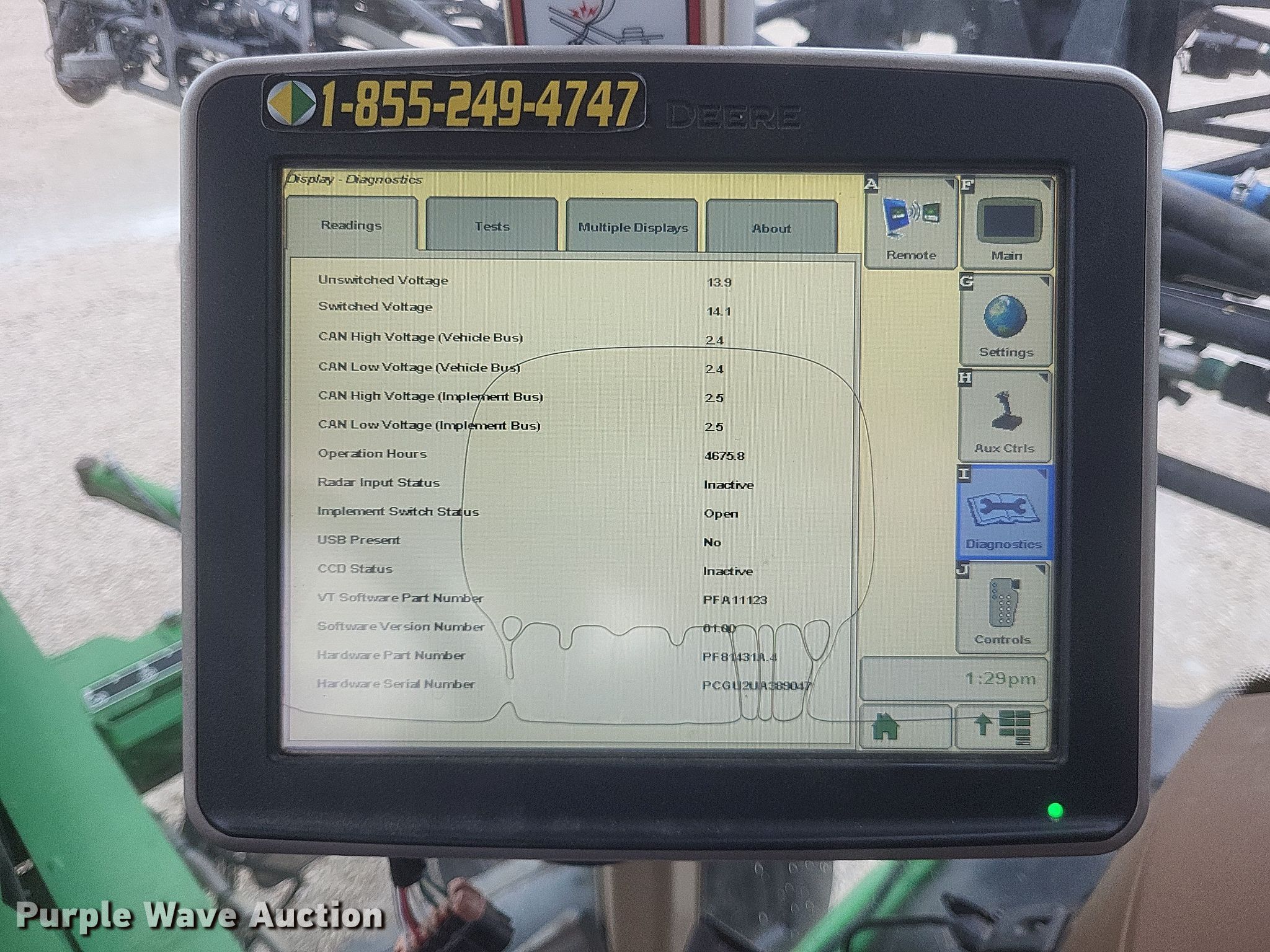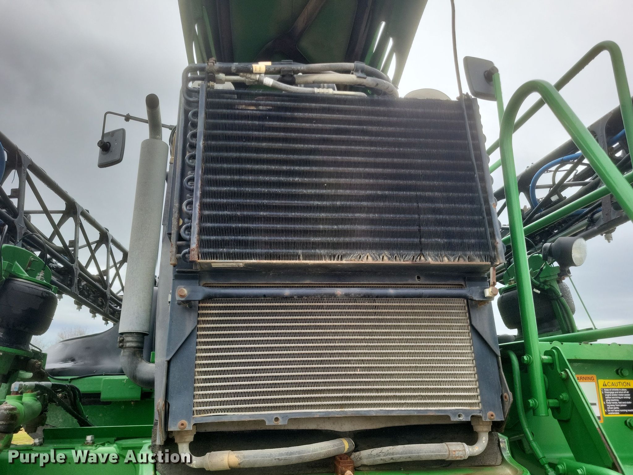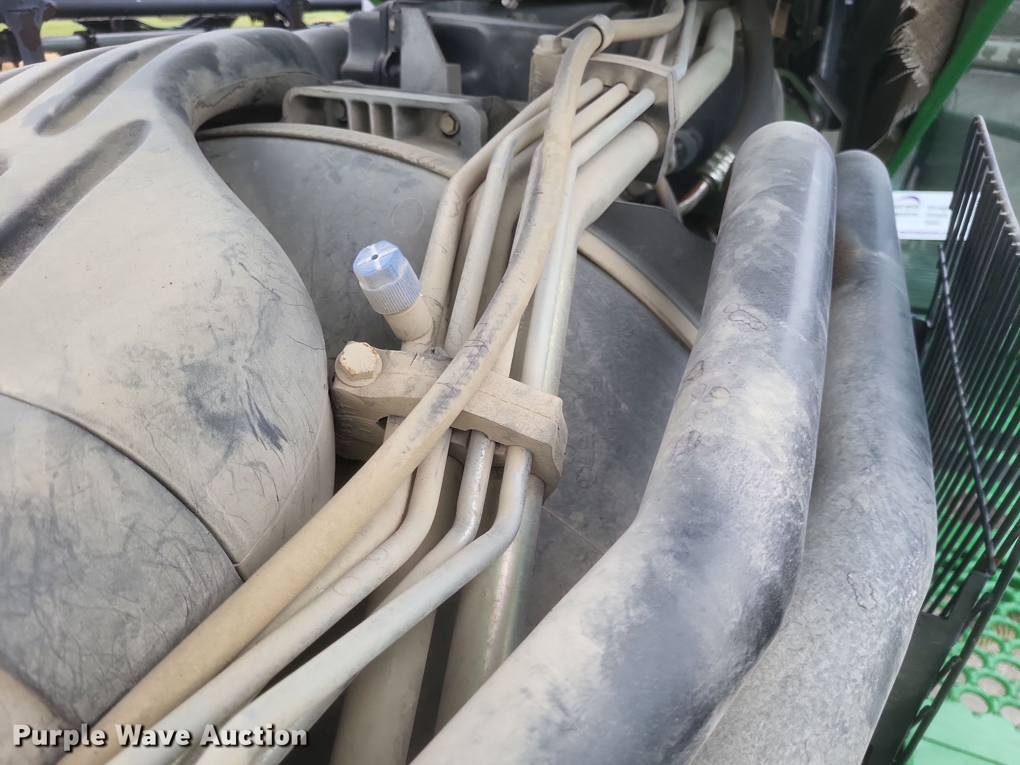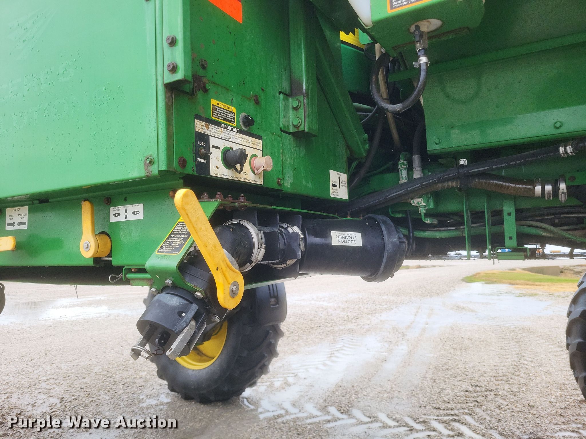 2012 John Deere 4830 sprayer. Engine hours: 4,733 on meter, Spray hours: 2,362 on meter, VIN: 1N04830XVC0023171. Engine John Deere 2240, Displacement: 414 C.I.D., Cylinders: 6, Fuel type: Diesel. Transmission Hydrostatic. Operators station AC, Heat. Features Hydraulic ladder, Belly shield, Solution tank Type: Stainless Steel, Front fill, Capacity: 1000 gallons, Rinse tank Capacity: 120 gallons, Boom Sections: 5, Boom breakaway, Hydraulic boom fold, Hydraulic height control, Nozzle Spacing: 15", Nozzle bodies: 5-way, Fence row nozzles, Electronics GPS monitor John Deere GreenStar 2630, GPS receiver John Deere Starfire 3000.. Tires Size: 600/65R38, Flotation tires. Notes Additional row crop wheels and tires. Keystone Cooperative. Vincennes, IN 47591