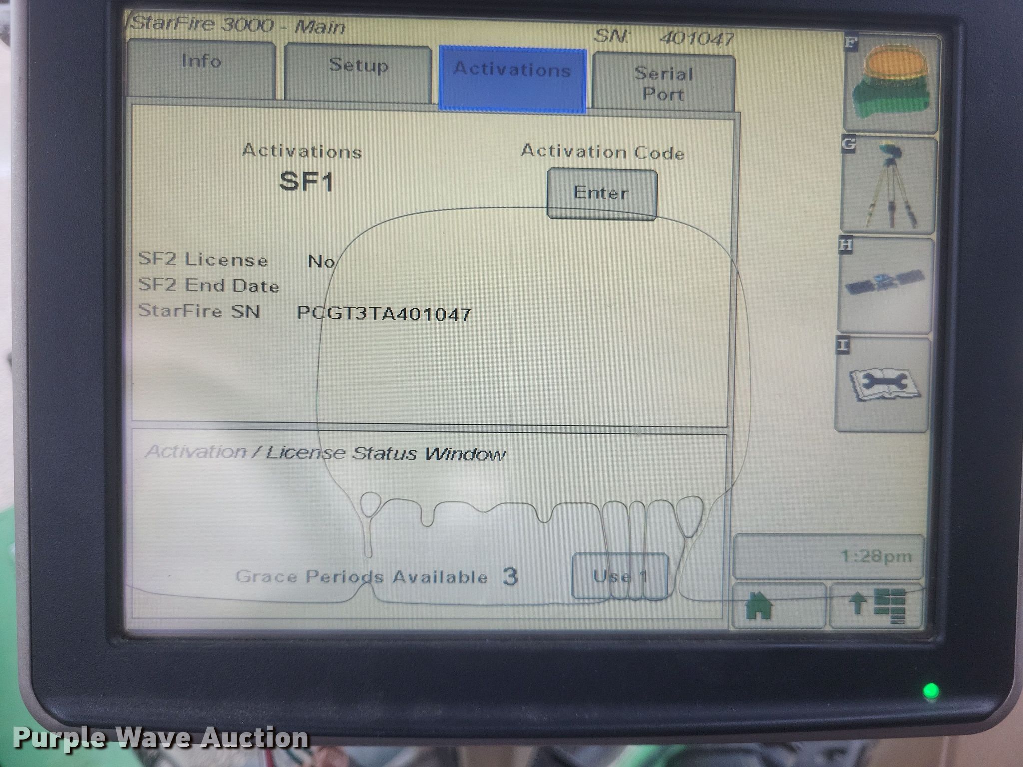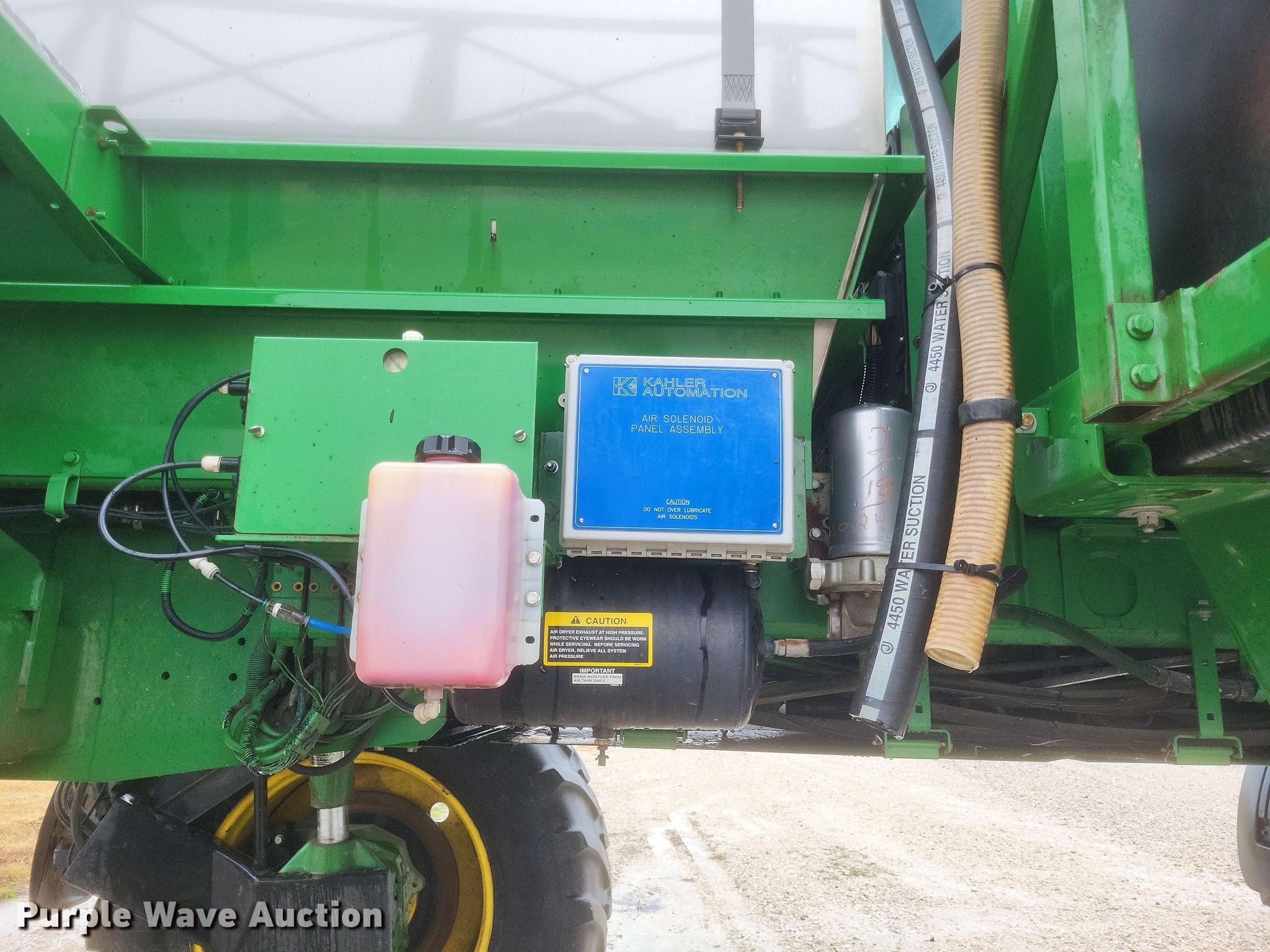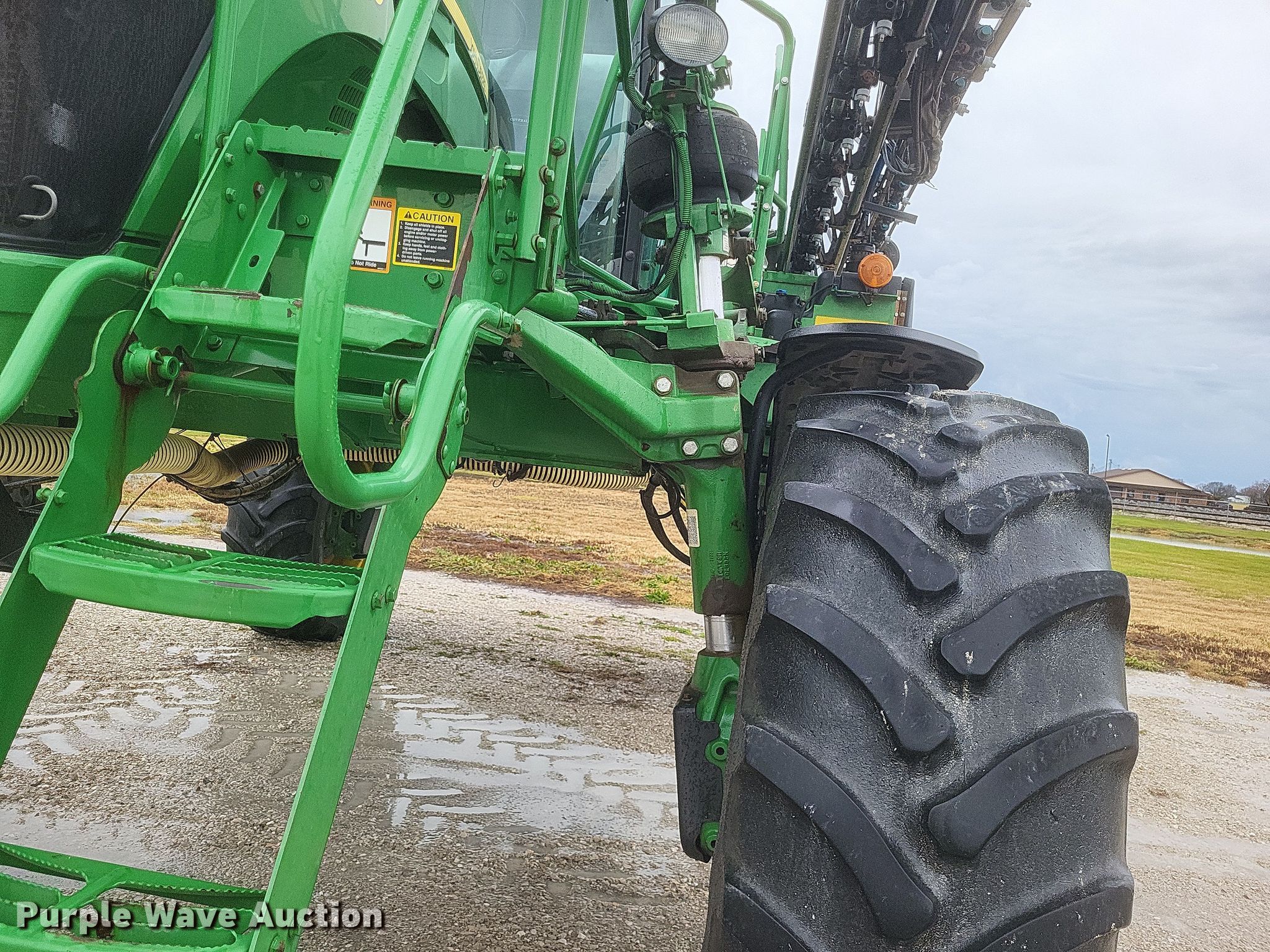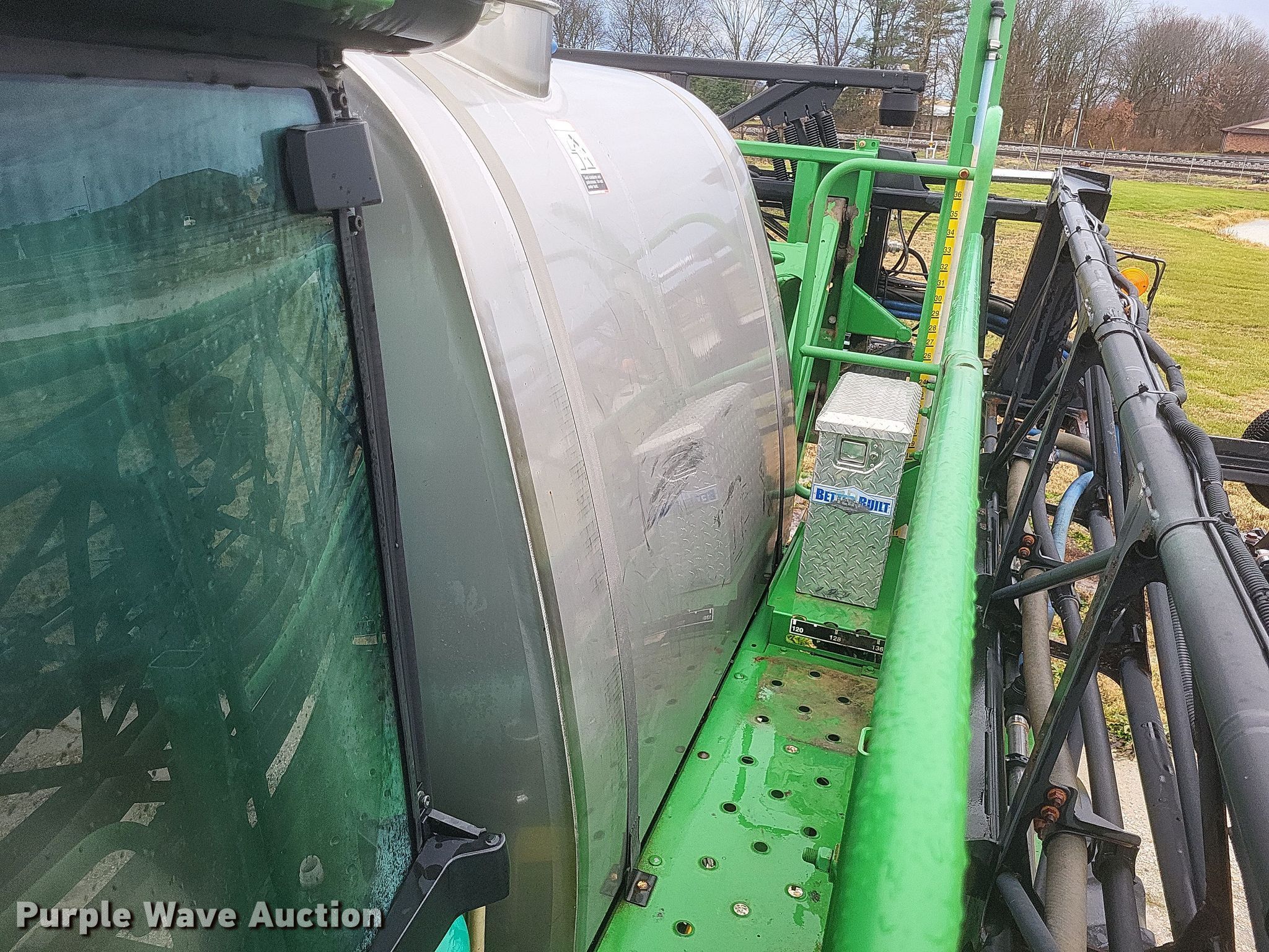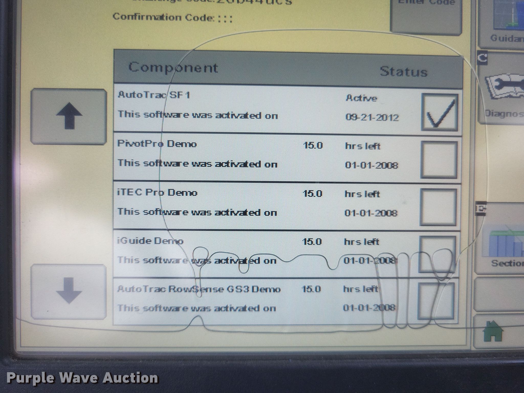 2012 John Deere 4830 sprayer. Engine hours: 4,733 on meter, Spray hours: 2,362 on meter, VIN: 1N04830XVC0023171. Engine John Deere 2240, Displacement: 414 C.I.D., Cylinders: 6, Fuel type: Diesel. Transmission Hydrostatic. Operators station AC, Heat. Features Hydraulic ladder, Belly shield, Solution tank Type: Stainless Steel, Front fill, Capacity: 1000 gallons, Rinse tank Capacity: 120 gallons, Boom Sections: 5, Boom breakaway, Hydraulic boom fold, Hydraulic height control, Nozzle Spacing: 15", Nozzle bodies: 5-way, Fence row nozzles, Electronics GPS monitor John Deere GreenStar 2630, GPS receiver John Deere Starfire 3000.. Tires Size: 600/65R38, Flotation tires. Notes Additional row crop wheels and tires. Keystone Cooperative. Vincennes, IN 47591