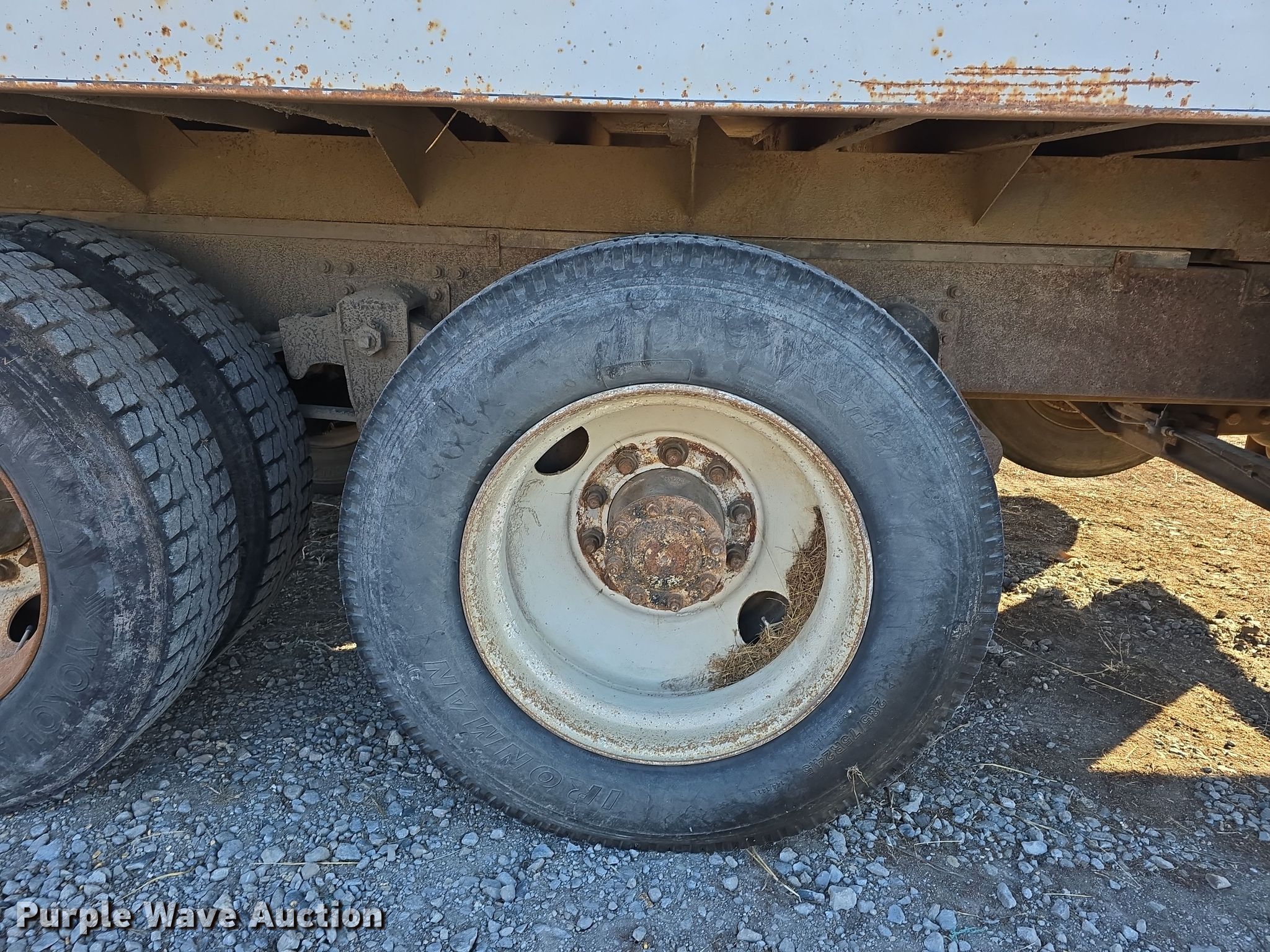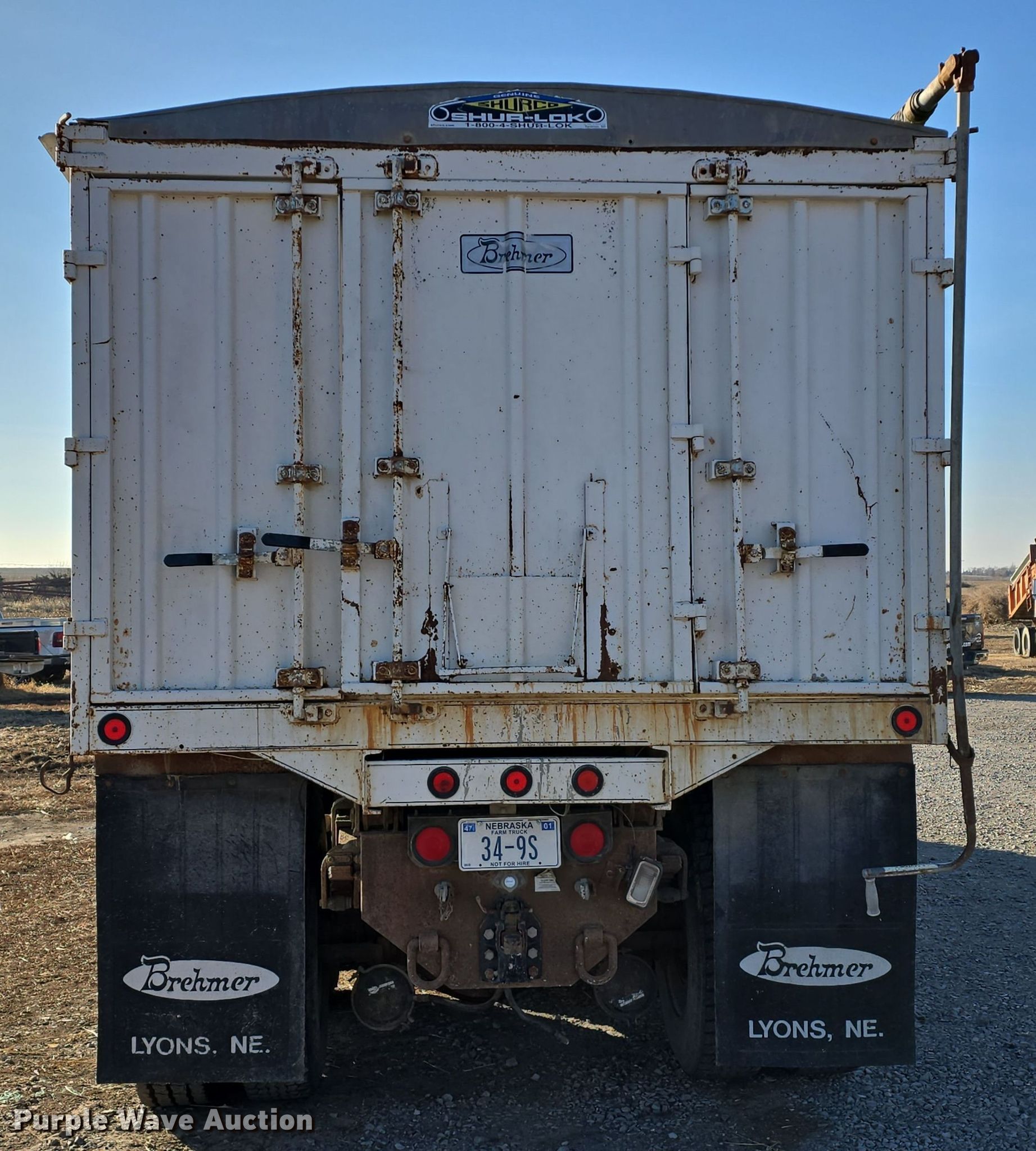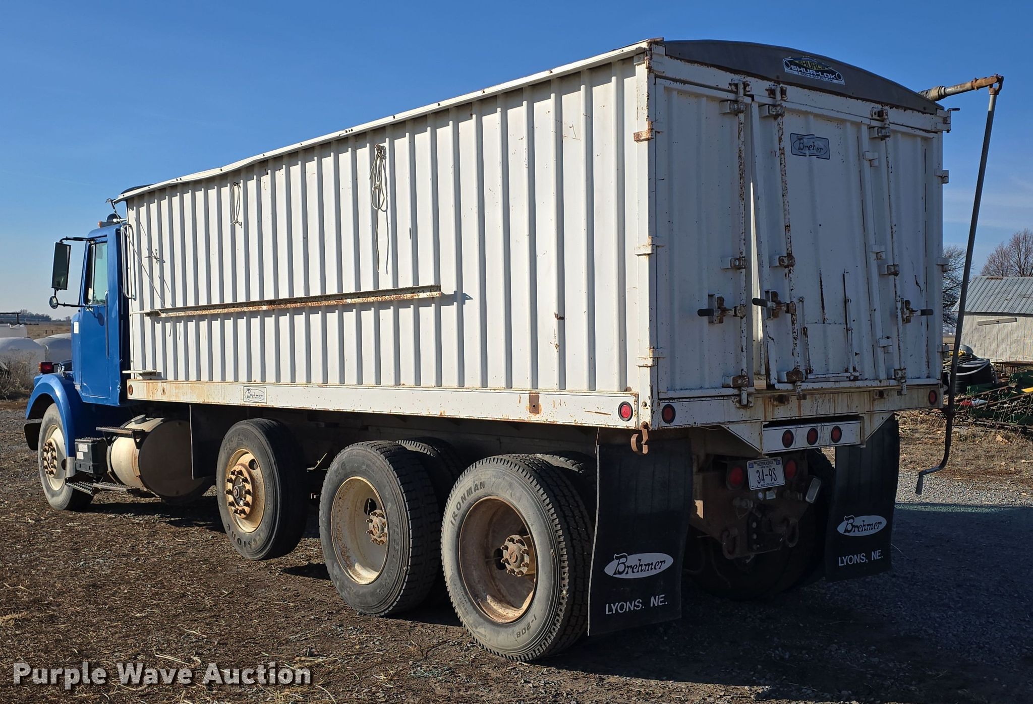 1987 White GMC grain truck. Miles: 163,779 on odometer, VIN: 1WUADCJE5HN116581. Engine Cummins F300-BCIV, Serial: 11362779, Displacement: 855 C.I.D., Cylinders: 6, Fuel type: Diesel. Transmission Eaton Fuller RT-11609A, Manual. Chassis Axles: Triple, Pusher axle, Suspension: Spring, Brakes: Air, PTO, Wheelbase: 250". Interior Heat, Heated mirrors, Brake controller. Features Dump bed Brehmer, 20' L x 96" W, Side height: 60", Bed type: Steel, Roll tarp, Ram: Dual, End gate: Manual. Tires Front: 11R24.5, Rear: 285/75R24.5, Lift axle: 295/75R22.5. Notes Windshield chipped or cracked. Nebraska title. Bear Creek Farms. Bruning, NE 68322